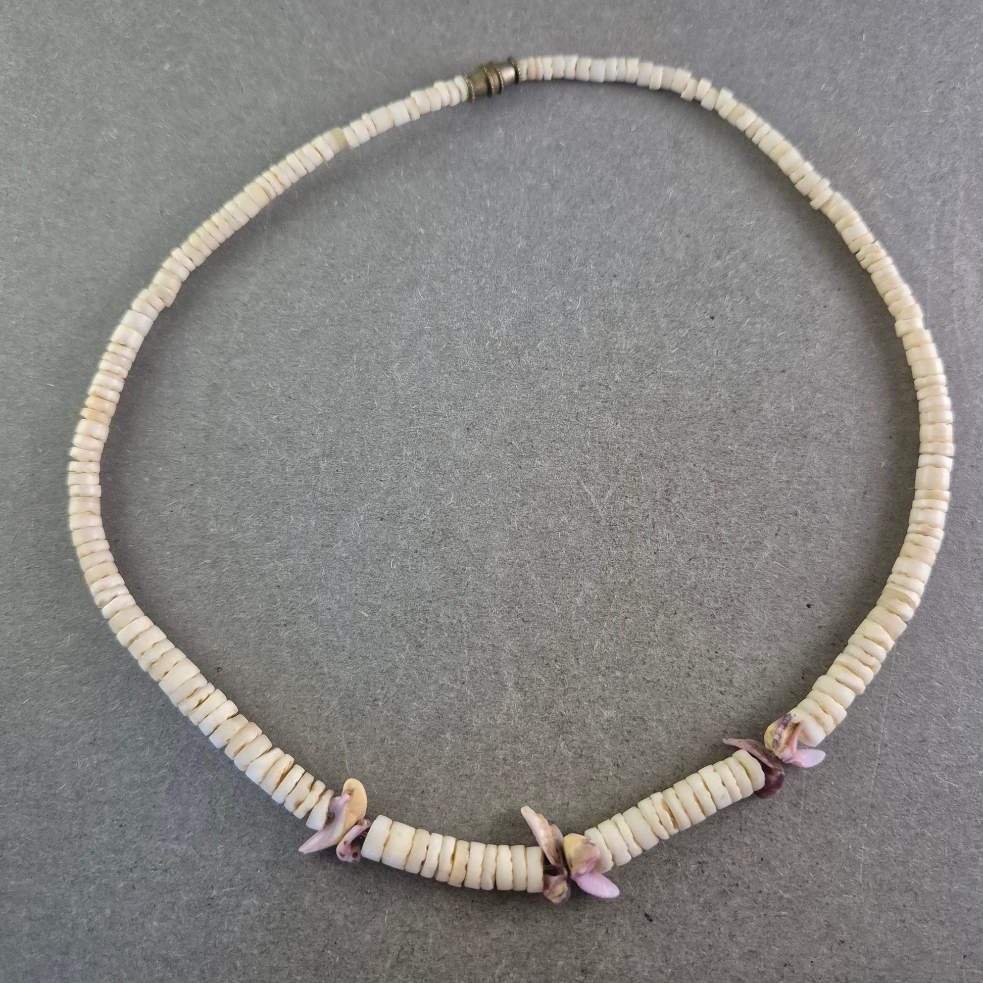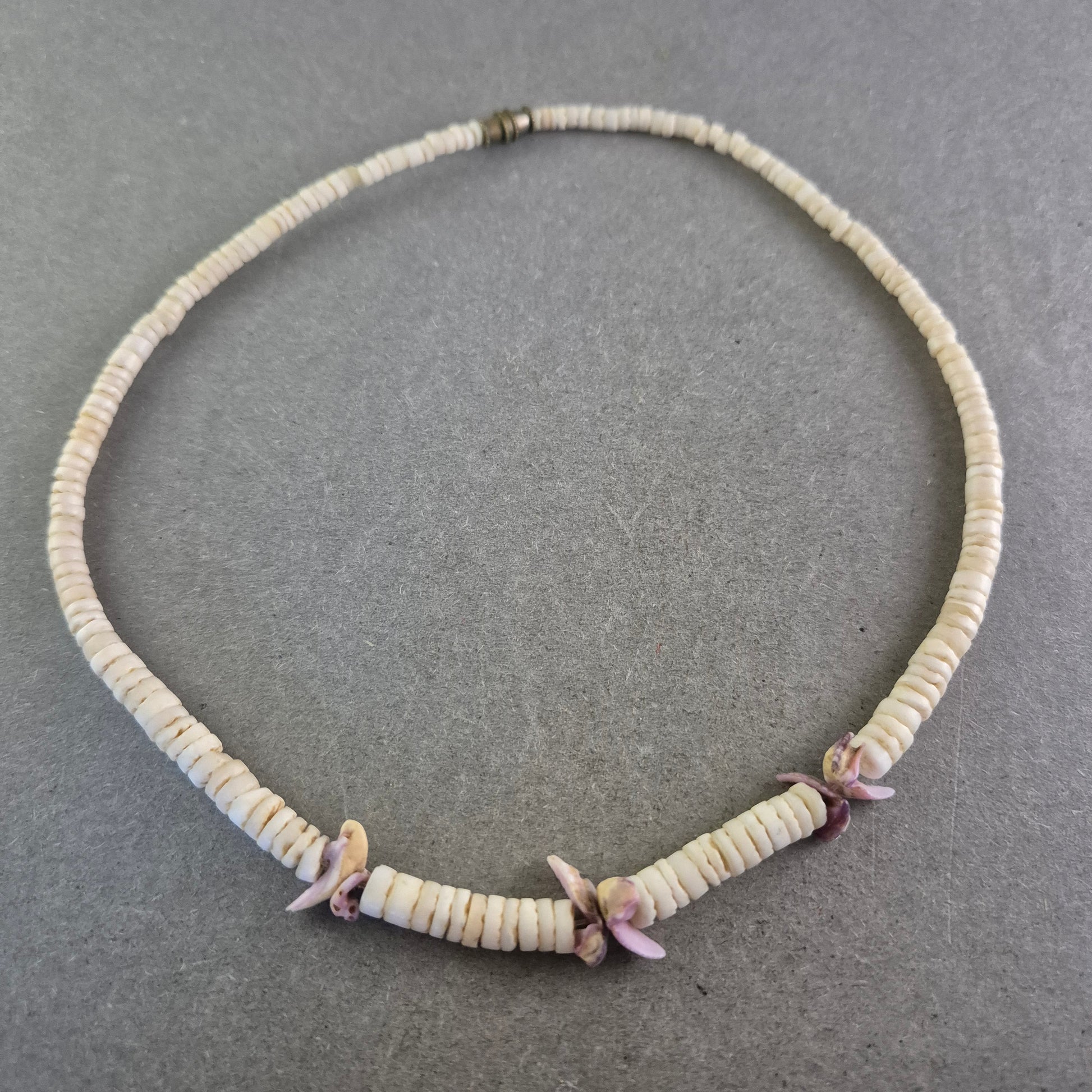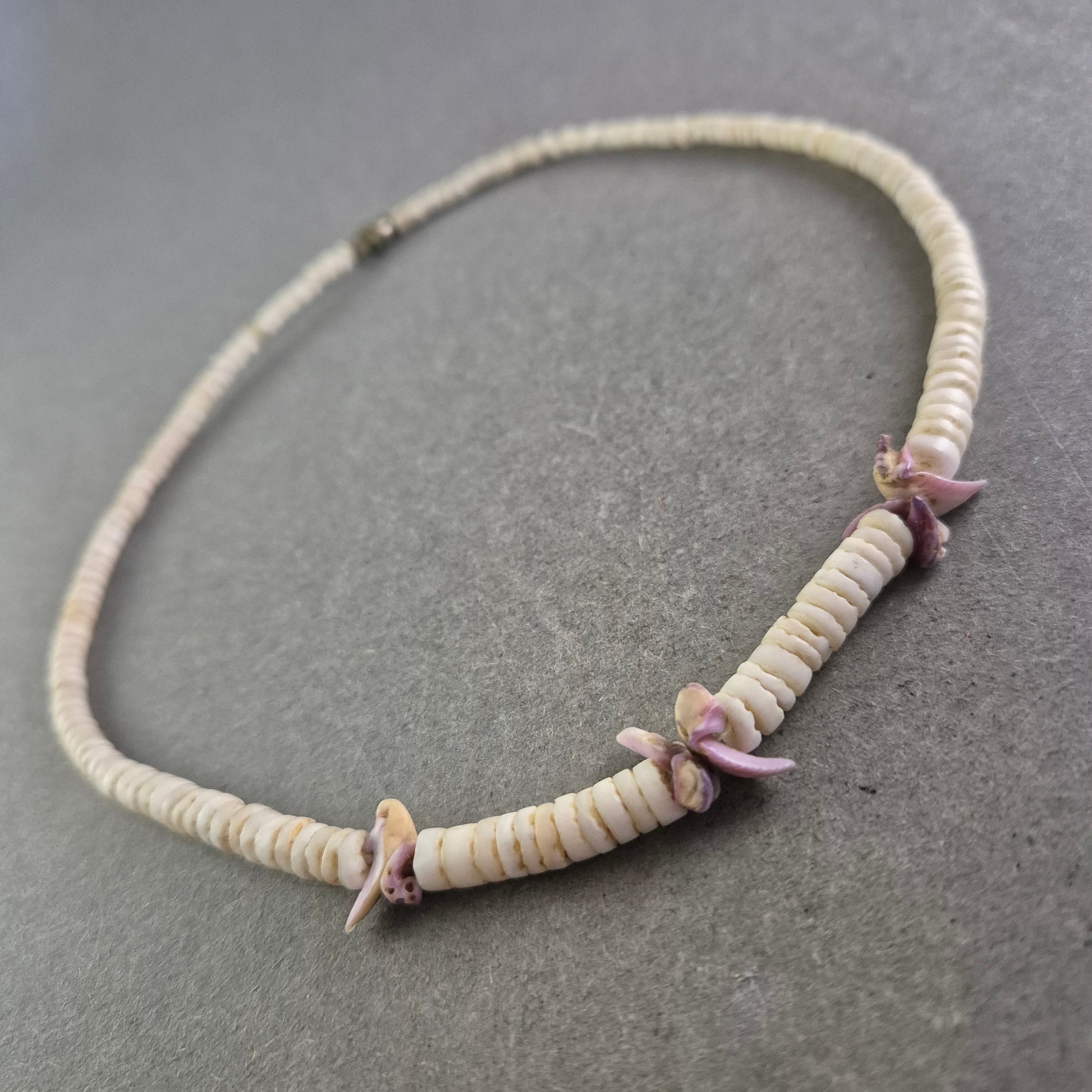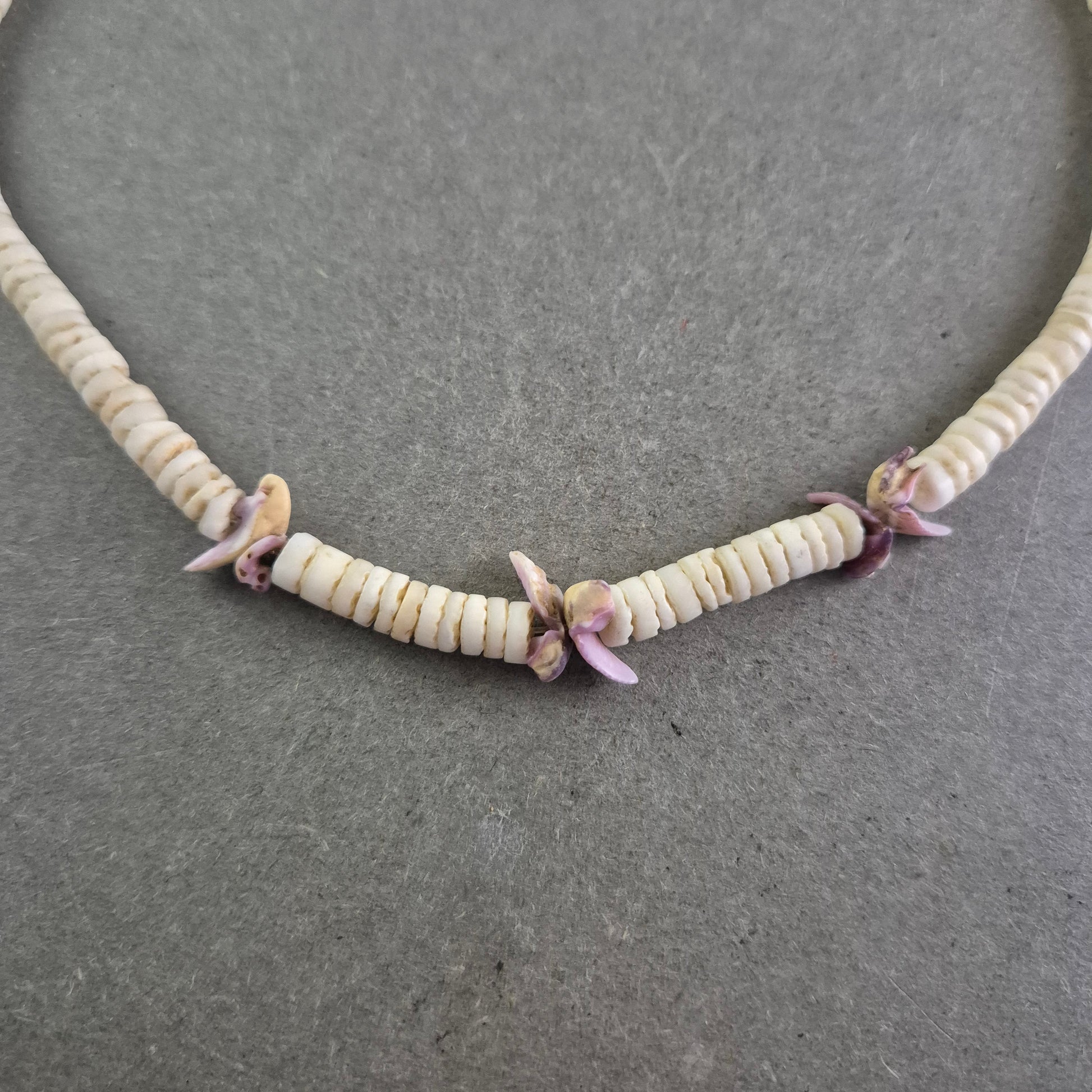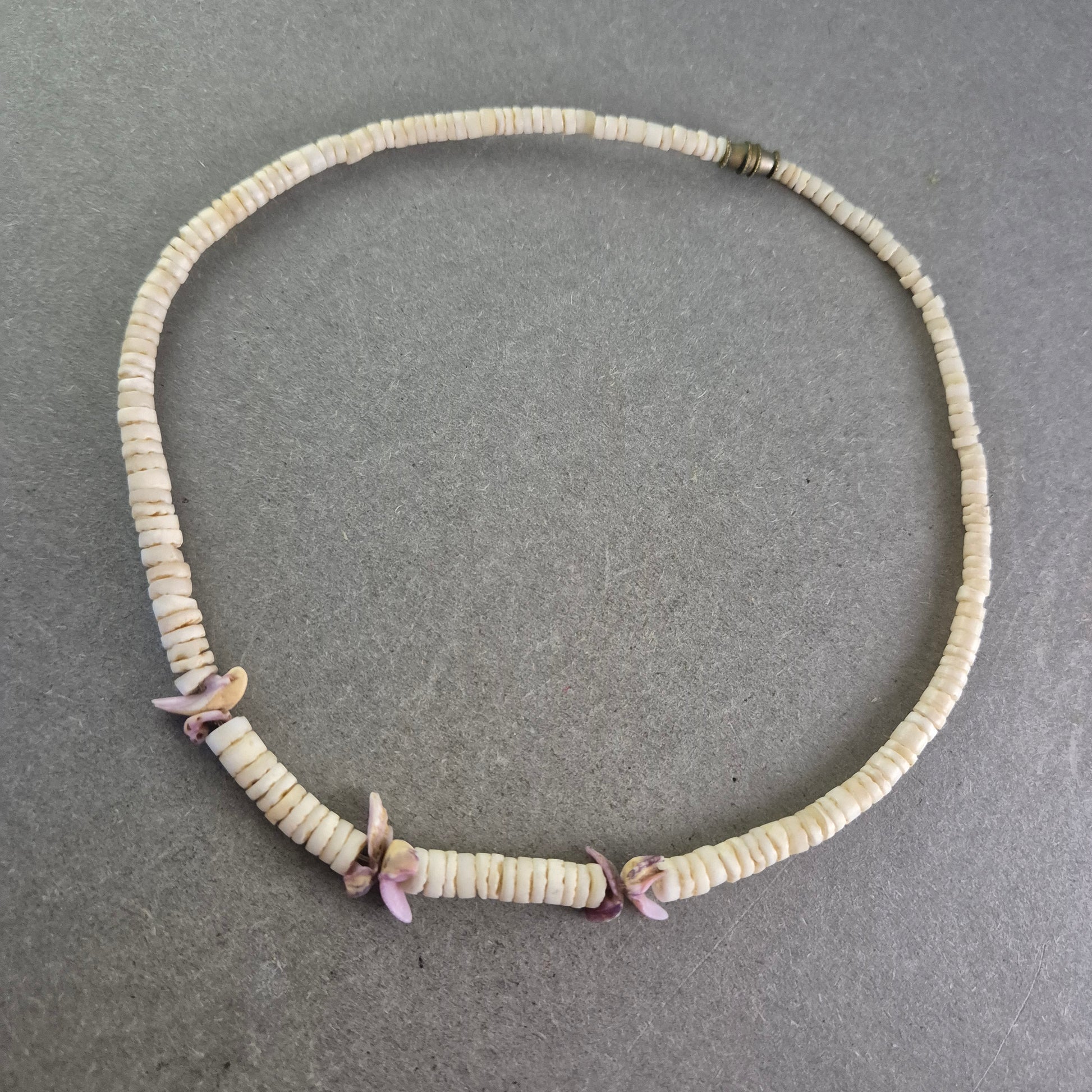 Diese handgearbeitete Muschelkette bringt den Charme von Naturmaterialien stilvoll zum Ausdruck. Die feinen, runden Muschelscheiben sind gleichmäßig aneinandergereiht und werden durch kleine violettfarbene Muschelstücke akzentuiert. Der dezente Naturlook macht die Kette zu einem besonderen Schmuckstück, das perfekt zu sommerlichen Outfits passt.