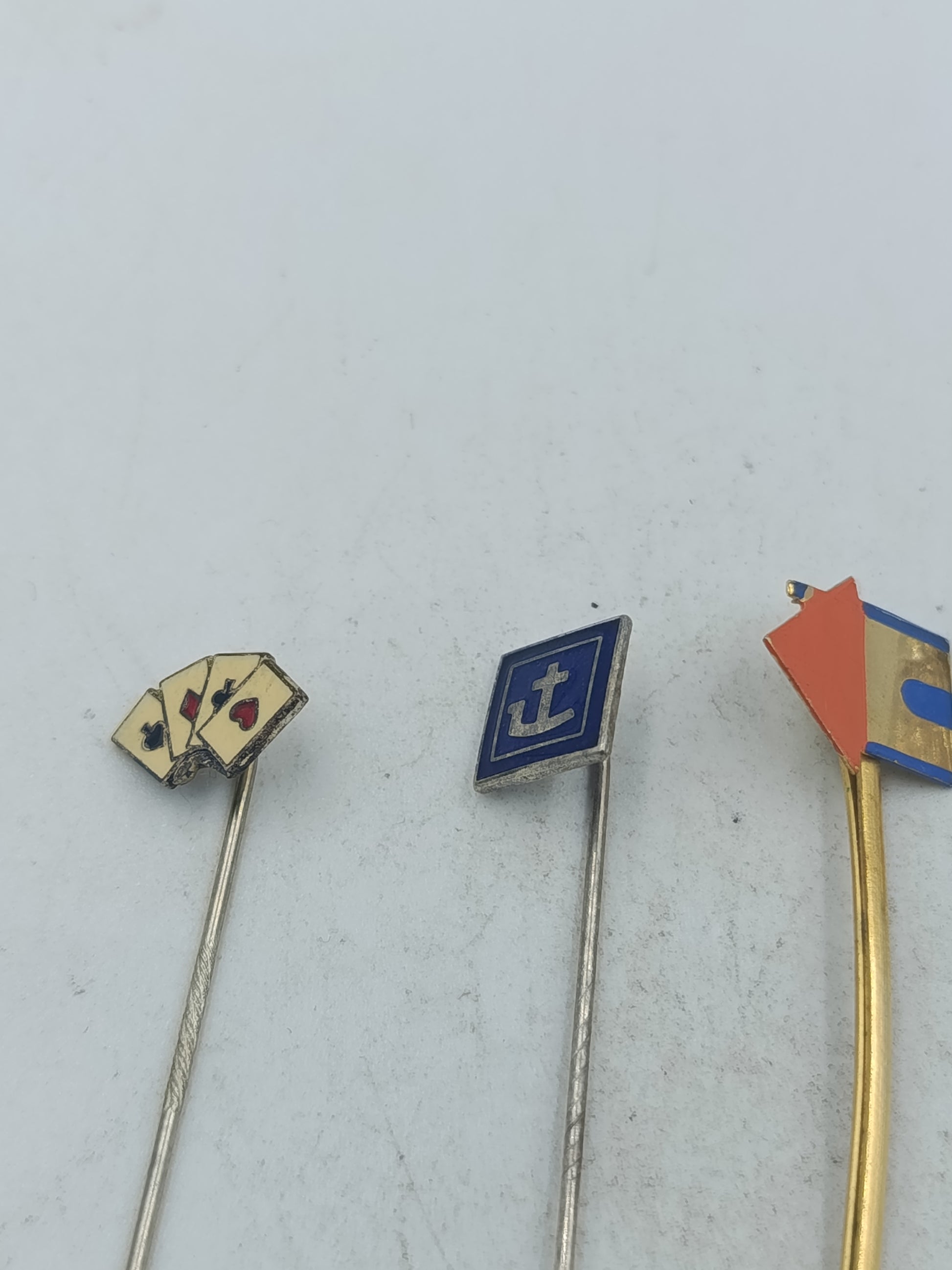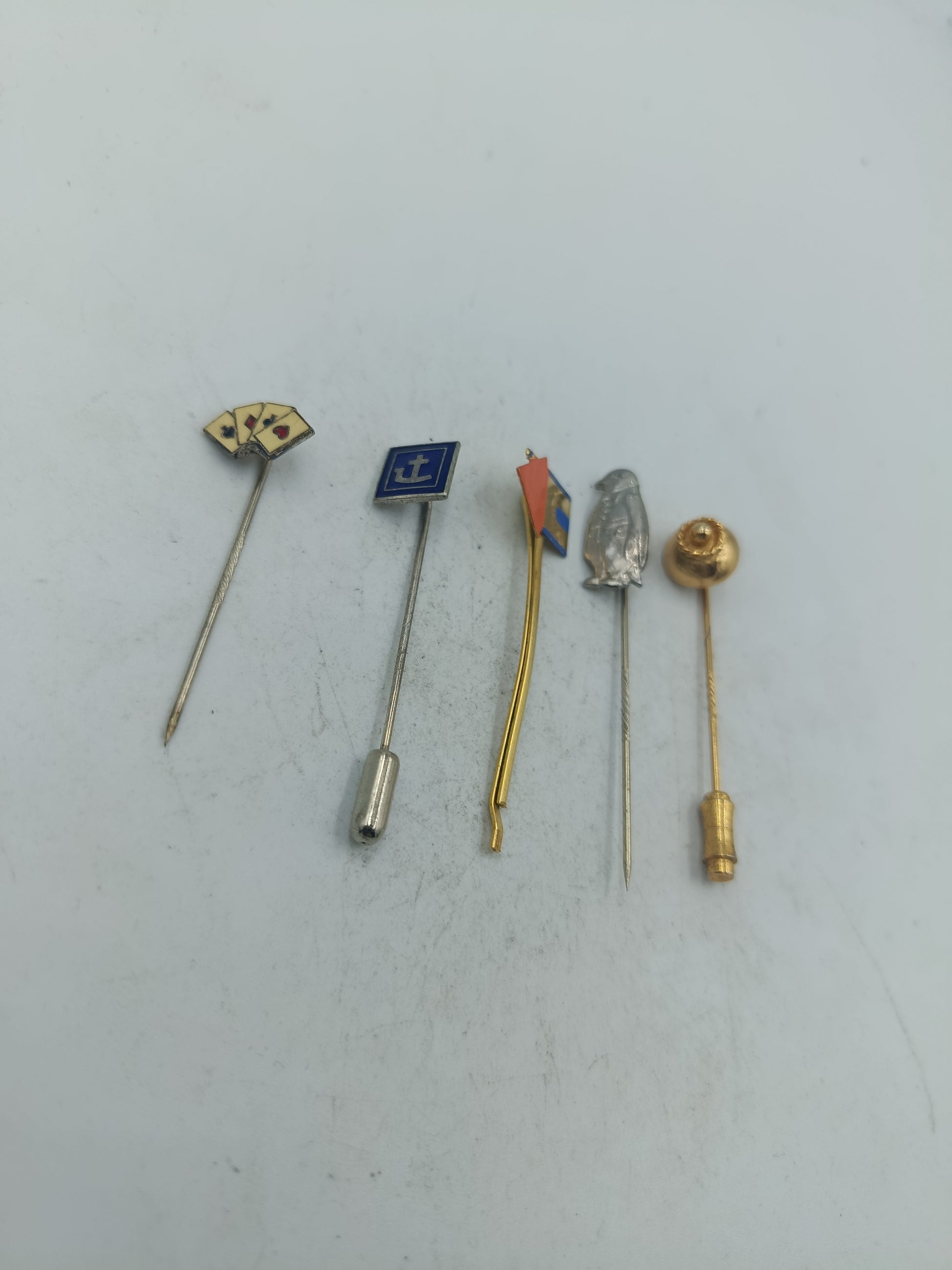 Vintage Set aus fünf Anstecknadeln mit unterschiedlichen Motiven und Metalloberflächen