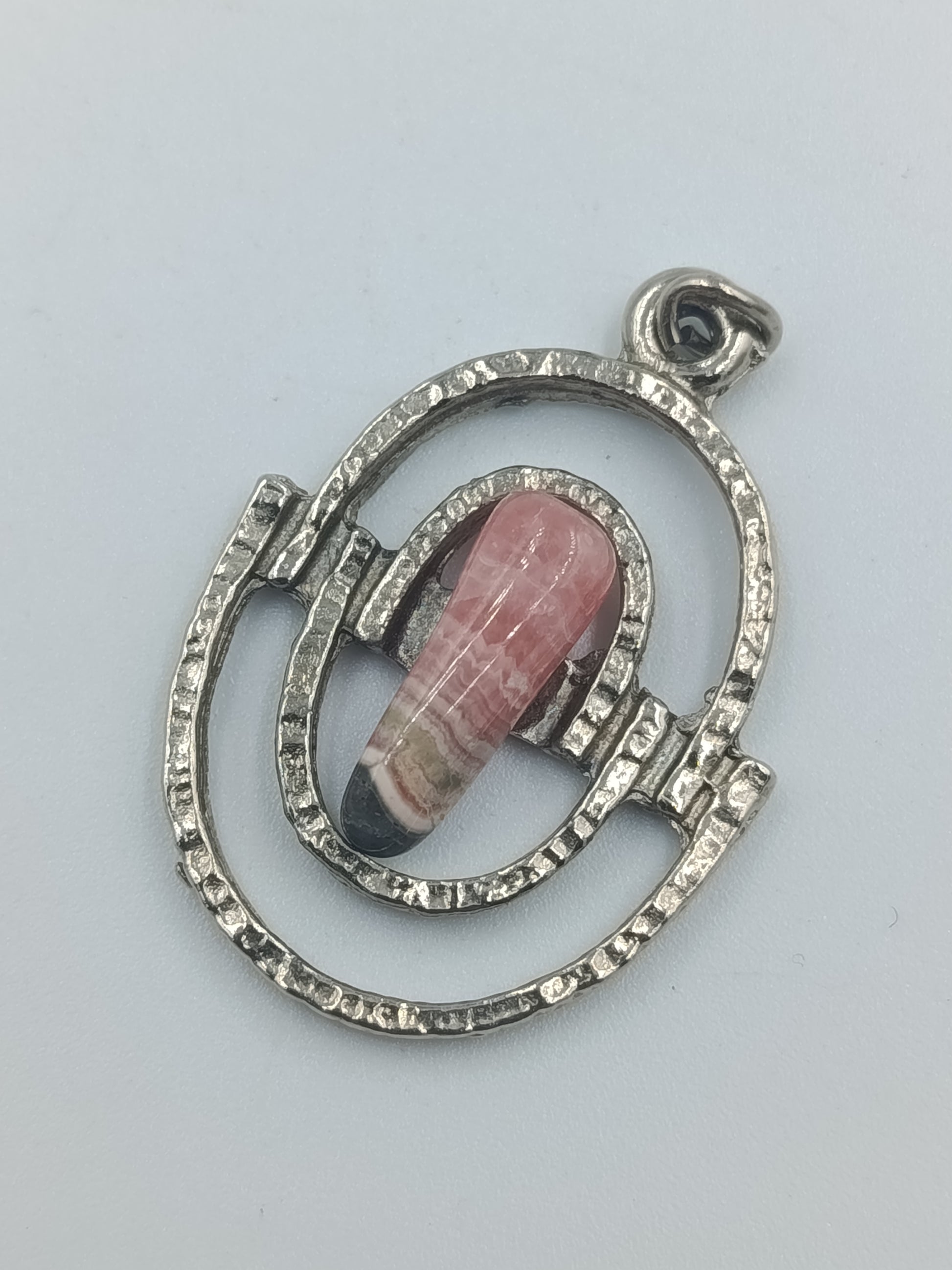 Ausgefallener Vintage-Anhänger aus gehämmertem, silberfarbenem Metall mit einem wunderschönen, länglichen Rhodochrosit-Stein in Rosa- und Grautönen. Der offene, ovale Rahmen gibt dem Design eine moderne, fast skulpturale Wirkung. Ideal für eine lange Kette oder ein Lederband.
