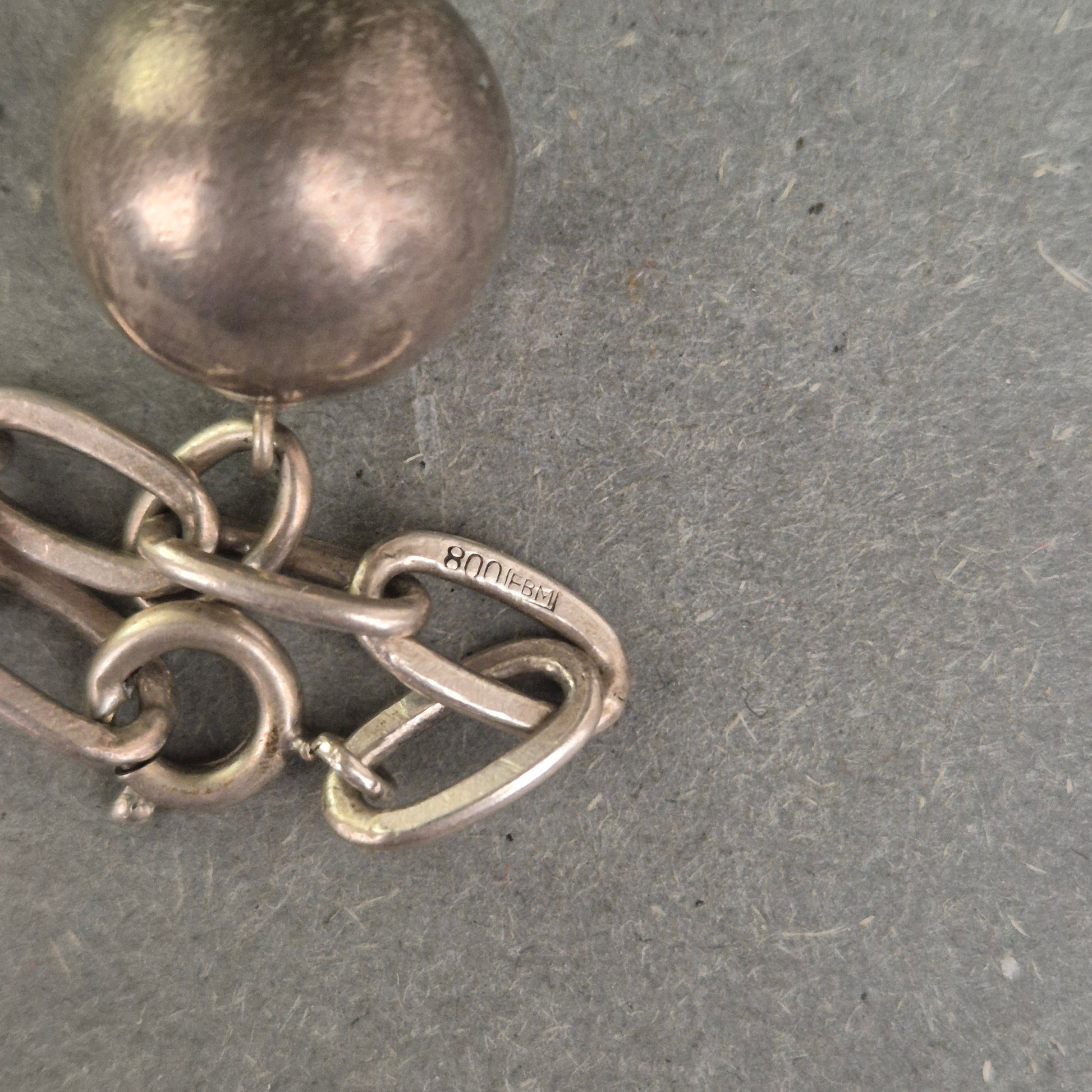 Dieses auffällige Armband im Vintage-Stil besteht aus robustem 800er Silber und besticht durch seinen massiven Kugelanhänger, der dem Design eine besondere Note verleiht. Die grobgliedrige Gliederkette unterstreicht den handgearbeiteten Charakter. Ein seltenes Sammlerstück, das italienisches Kunsthandwerk mit markantem Design vereint.
