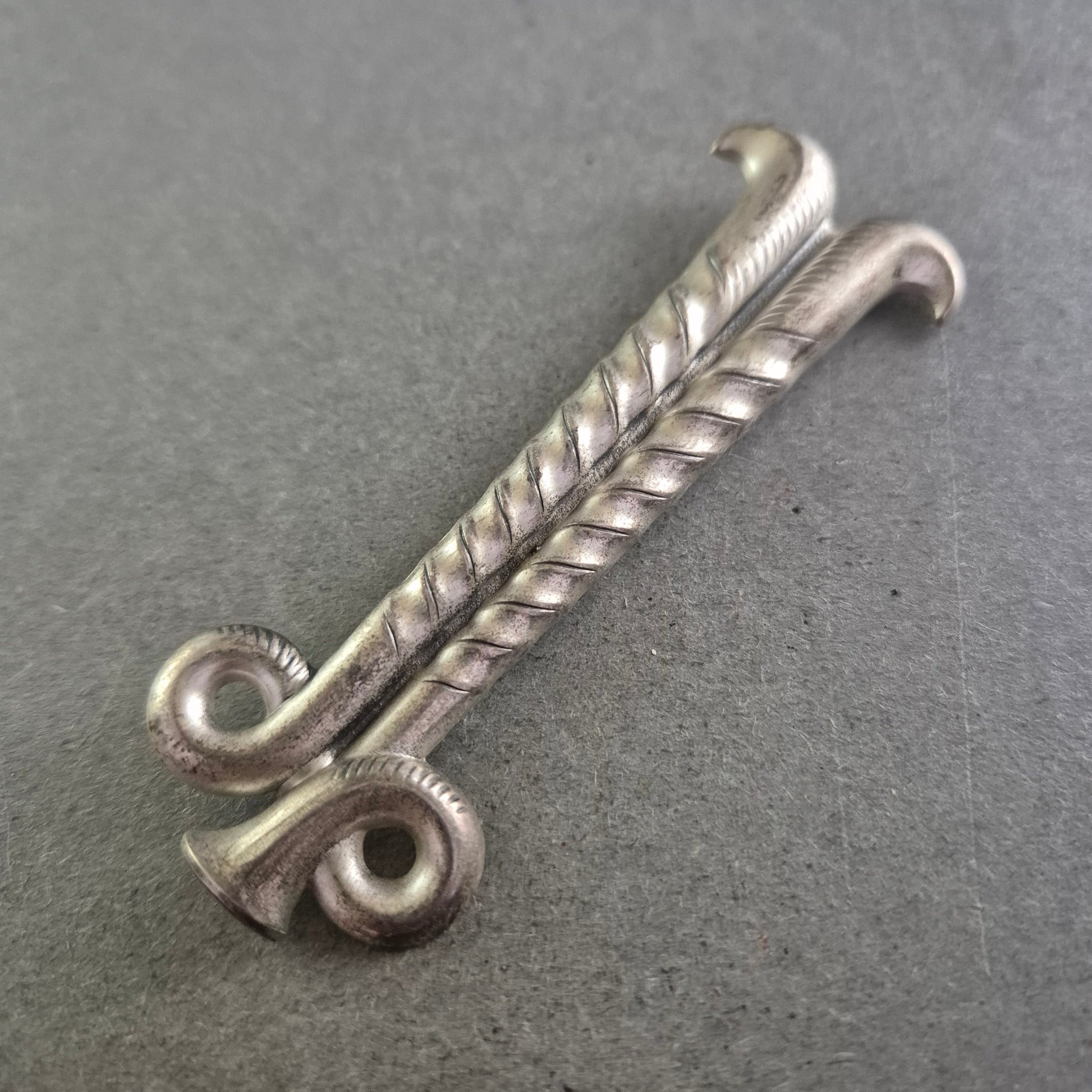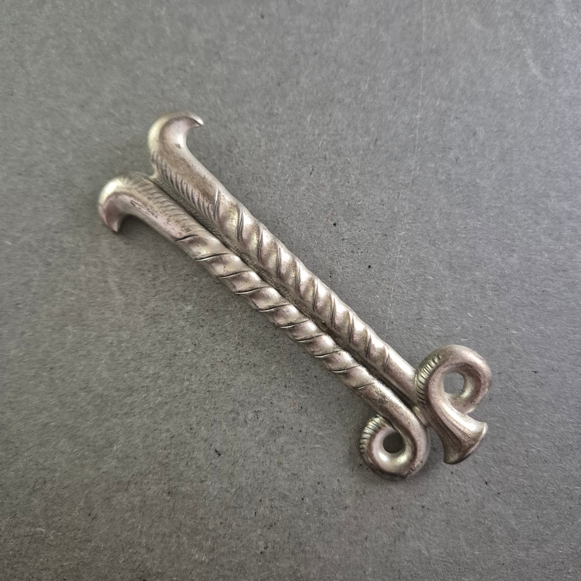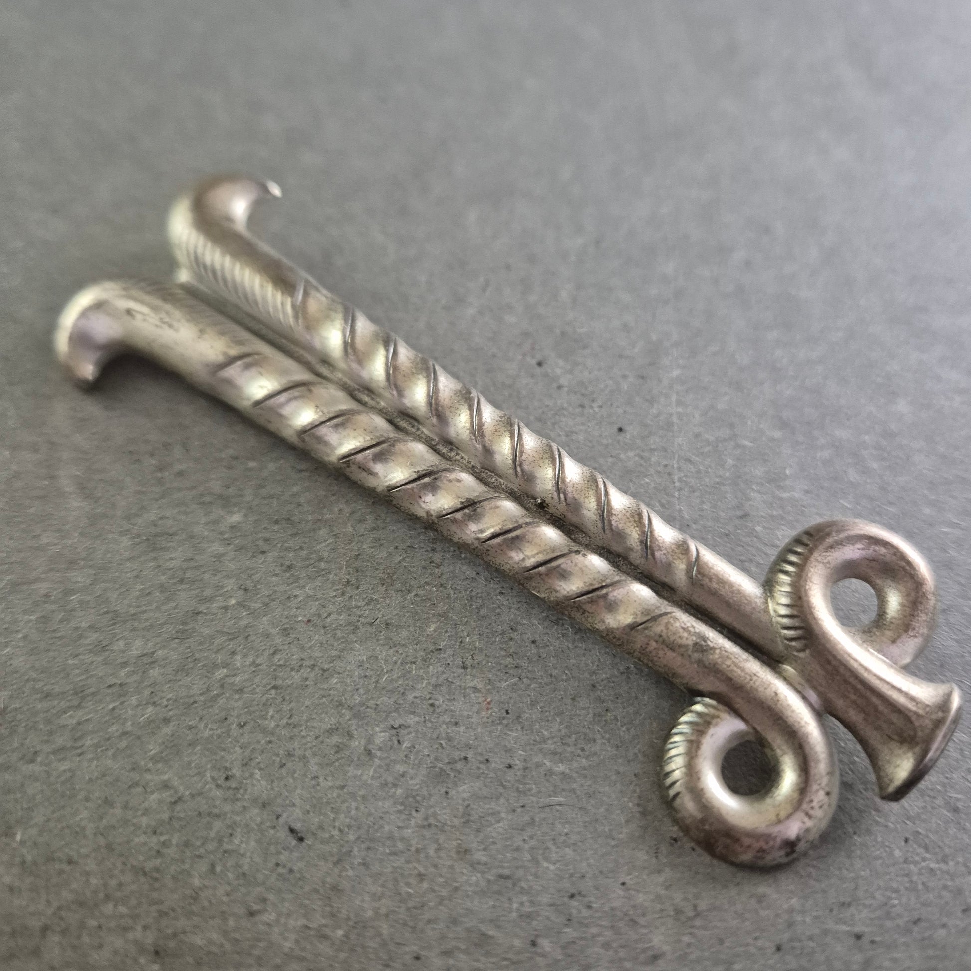 Diese Vintage-Brosche ist ein stilvolles Accessoire für Liebhaber alpiner Nostalgie. Gefertigt in Form zweier gekreuzter, antiker Skier mit feinen Details und Spiralprägung, erinnert sie an den klassischen Charme des Wintersports vergangener Jahrzehnte. Die Brosche besteht aus versilbertem Metall (vermutlich Alpacca oder Silberlegierung) und verfügt über eine gut erhaltene Nadelmechanik.