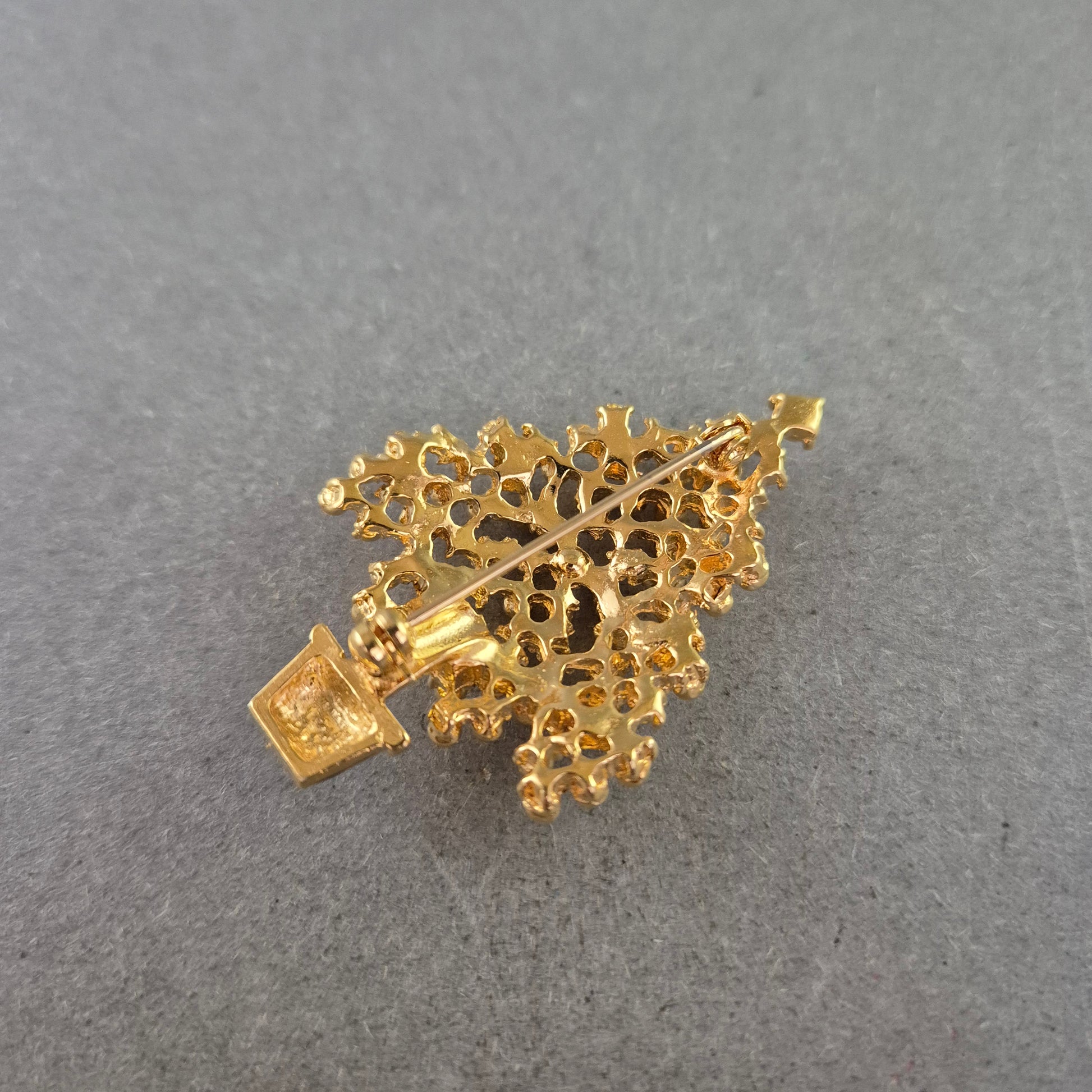 Diese dekorative Brosche in Form eines stilisierten Weihnachtsbaums ist mit zahlreichen kleinen Schmucksteinen in festlichen Farben verziert. Die glänzende Oberfläche in warmem Goldton, kombiniert mit roten, grünen, weißen und blauen Ziersteinen, verleiht der Brosche einen feierlichen Glanz. Perfekt für die Adventszeit, Weihnachtsfeiern oder als charmantes Geschenk.