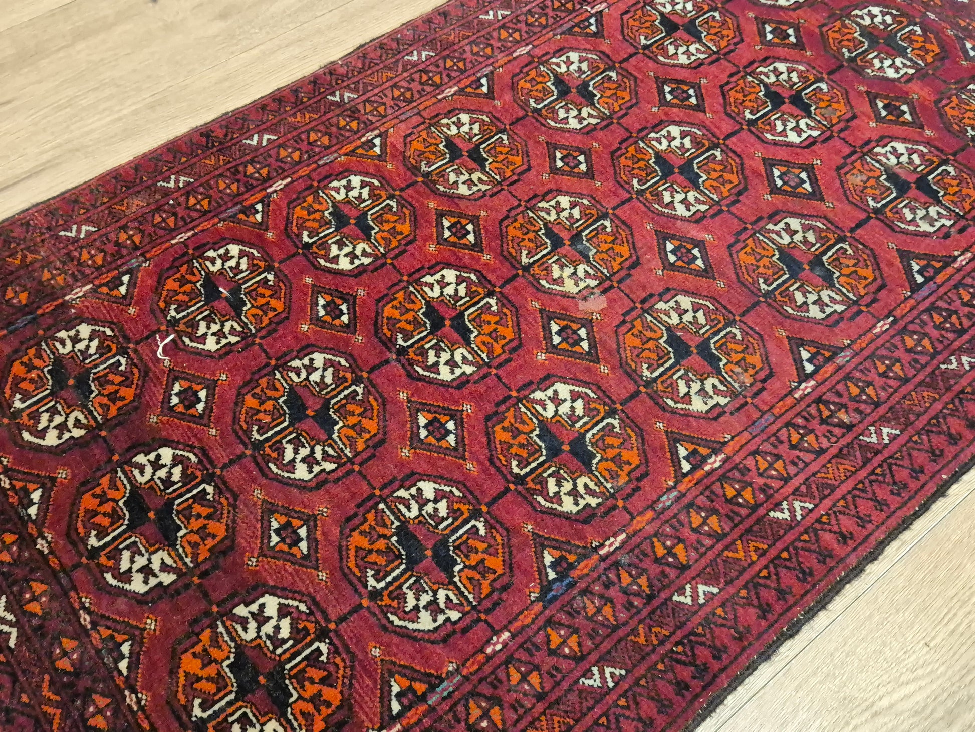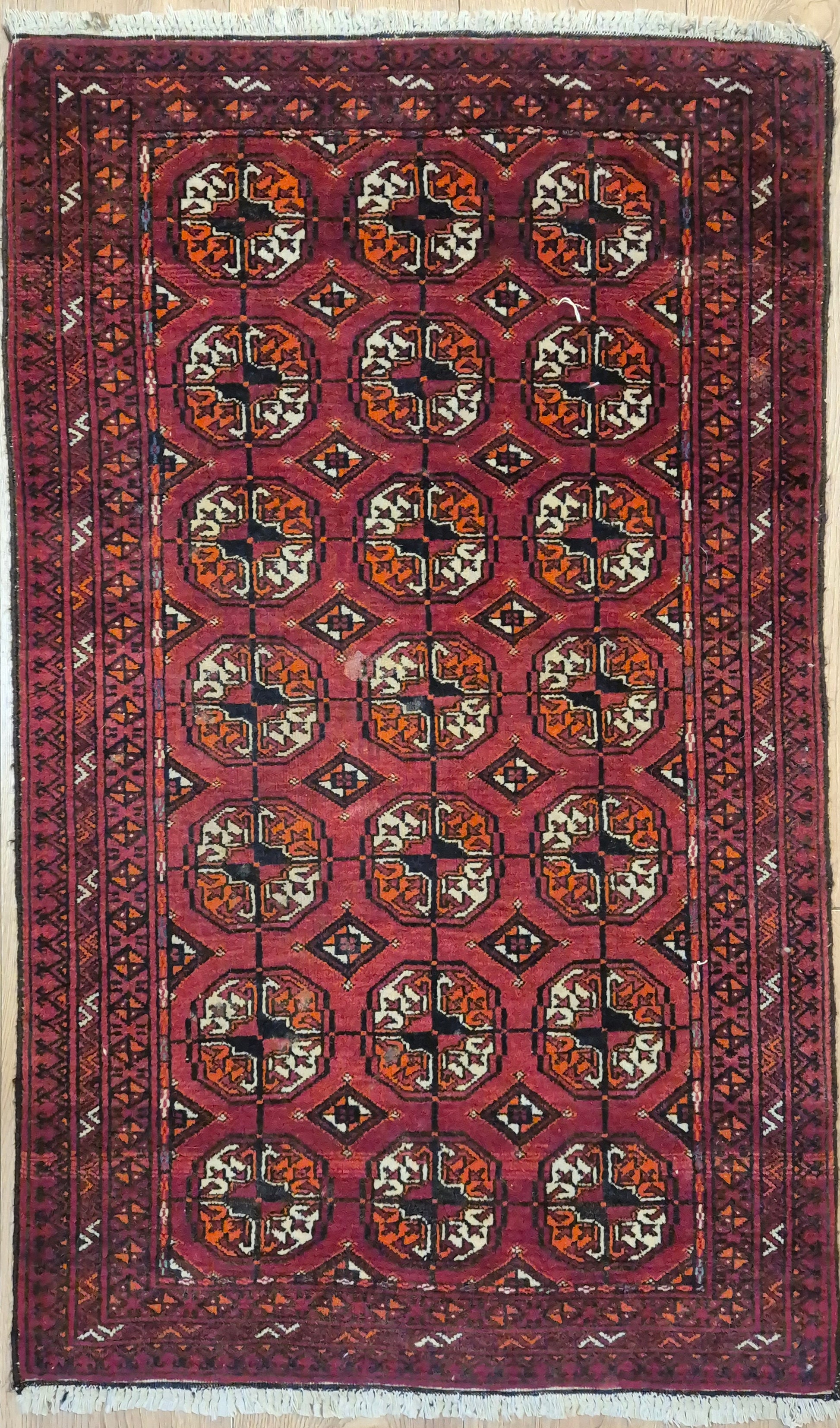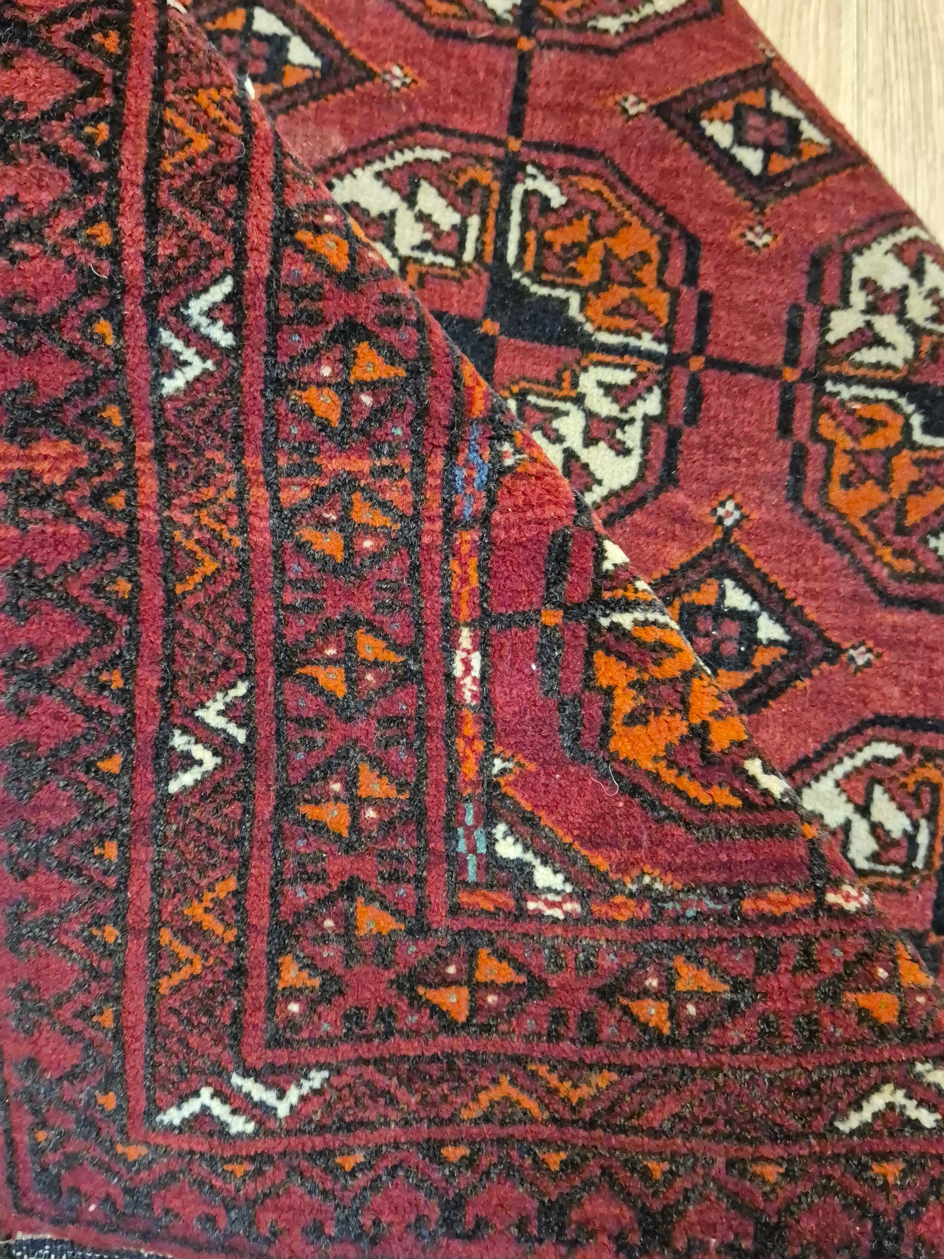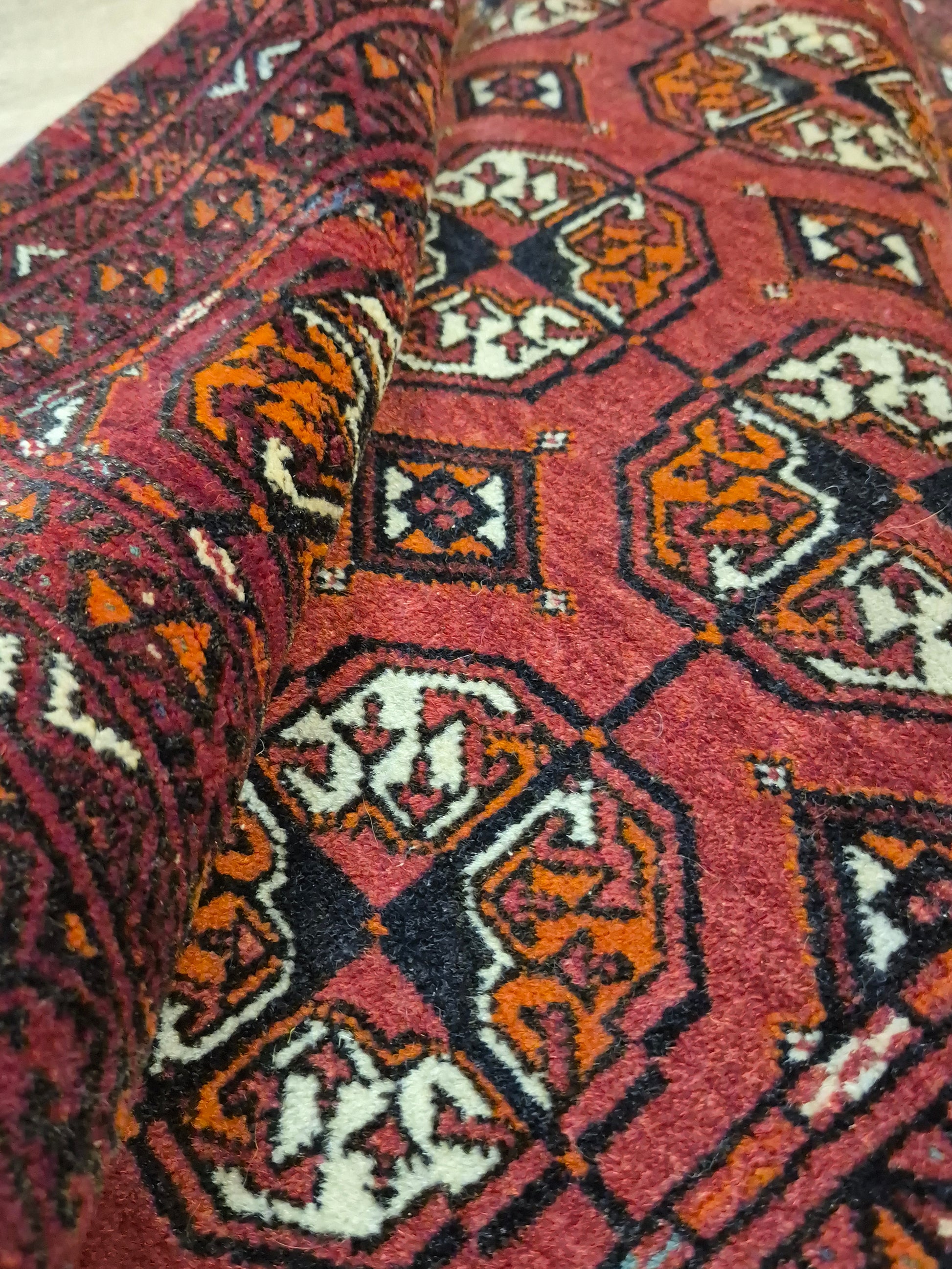 angeboten wird ein authentischer Yomut Teppich aus reiner Wolle, handgeknüpft in traditioneller Ausführung. Das charakteristische Gül-Muster ist in klarer Reihung angeordnet und von geometrischen Bordüren eingerahmt. Die kräftige Farbpalette aus Rot, Orange, Schwarz und Elfenbein verleiht diesem Nomadenstück eine ausdrucksstarke Wirkung.