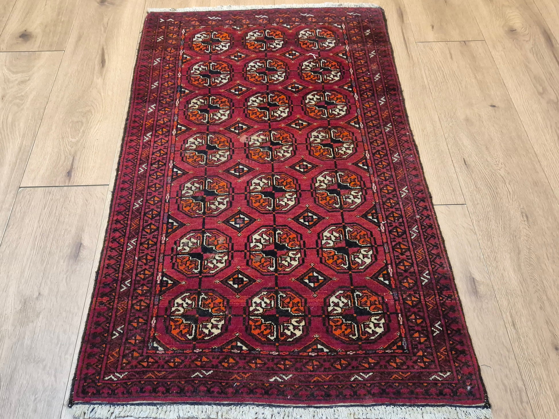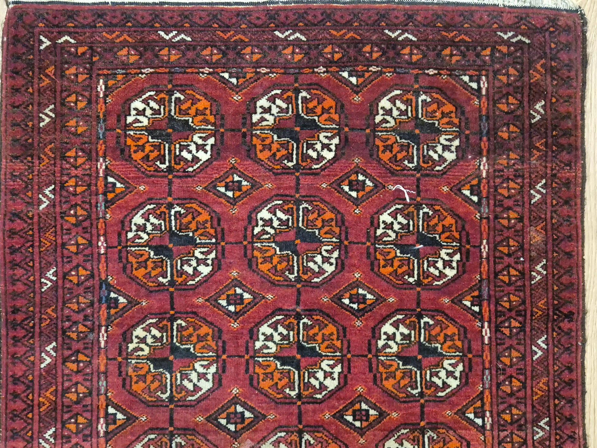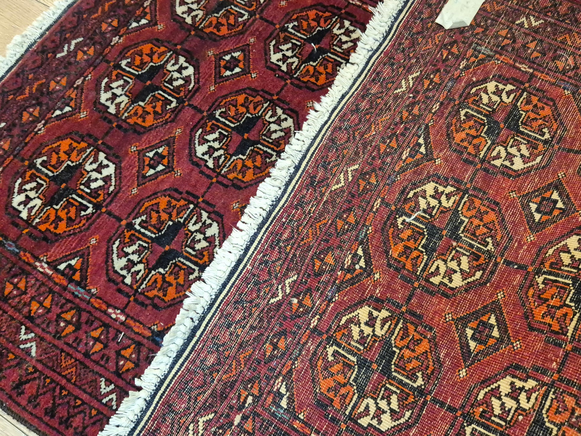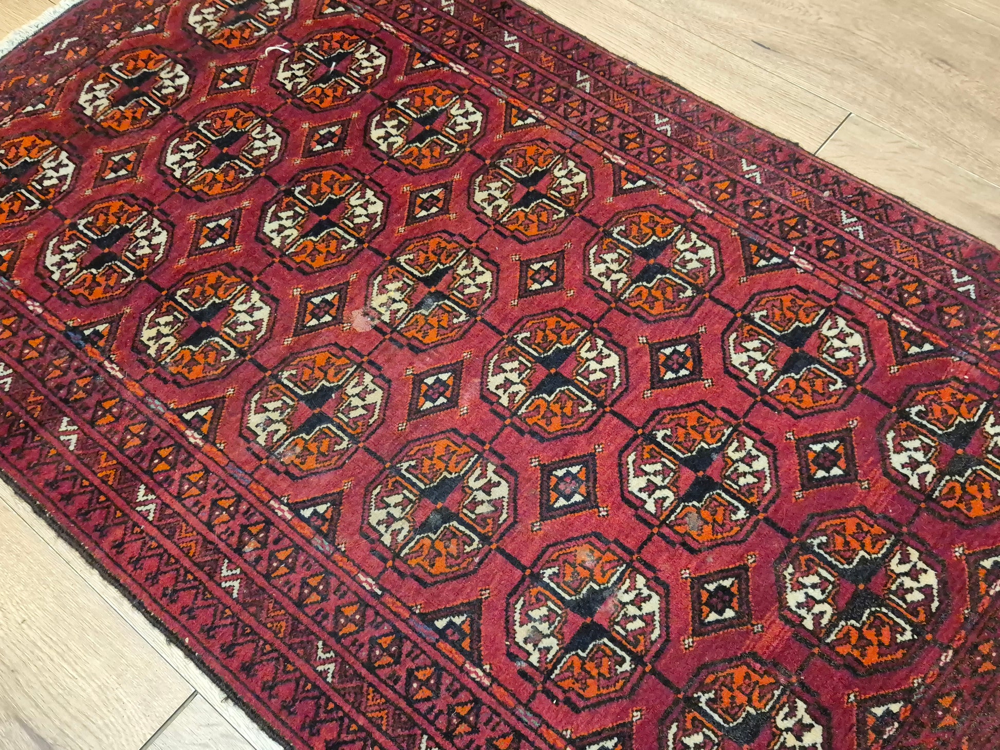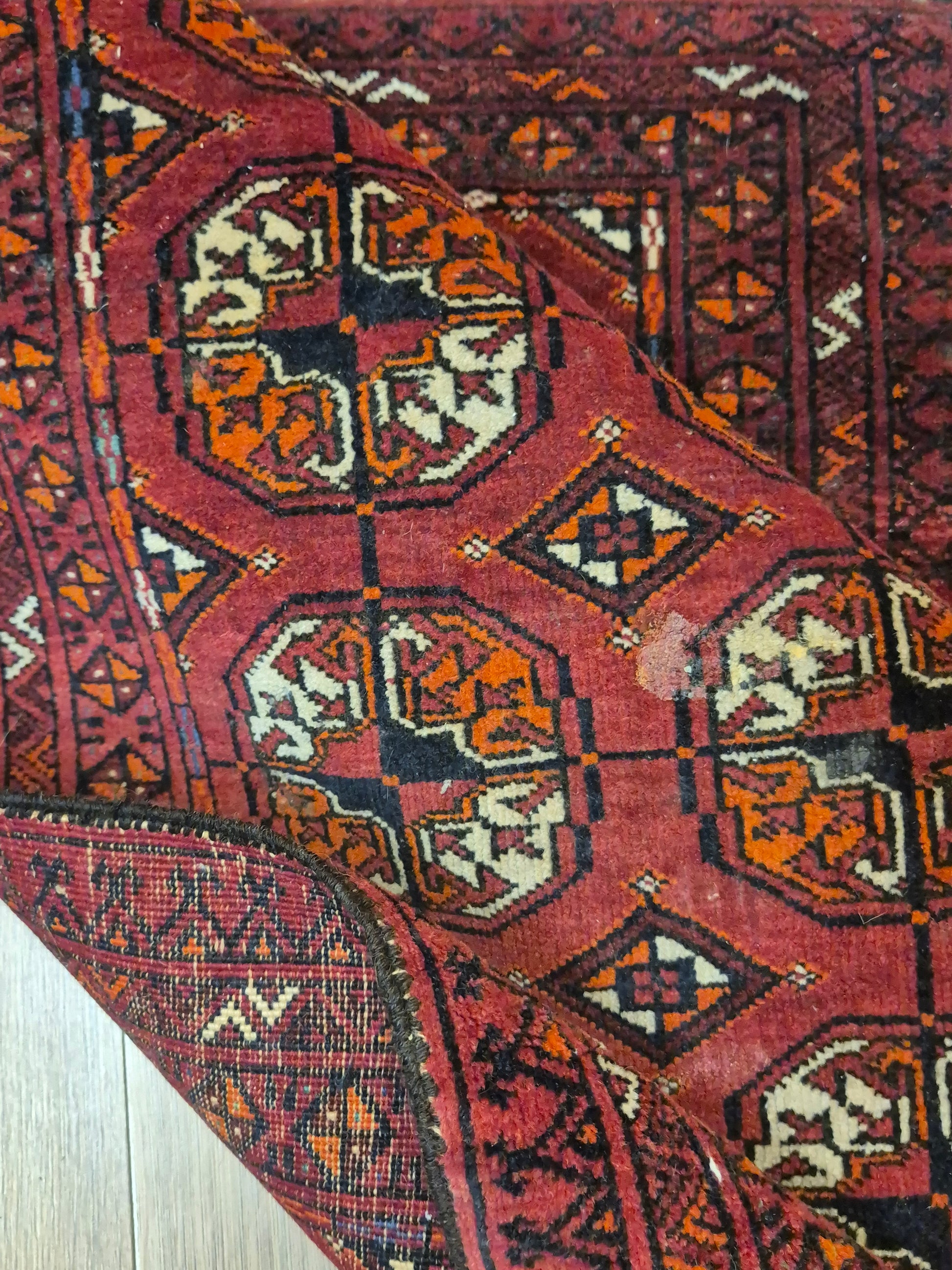 angeboten wird ein authentischer Yomut Teppich aus reiner Wolle, handgeknüpft in traditioneller Ausführung. Das charakteristische Gül-Muster ist in klarer Reihung angeordnet und von geometrischen Bordüren eingerahmt. Die kräftige Farbpalette aus Rot, Orange, Schwarz und Elfenbein verleiht diesem Nomadenstück eine ausdrucksstarke Wirkung.