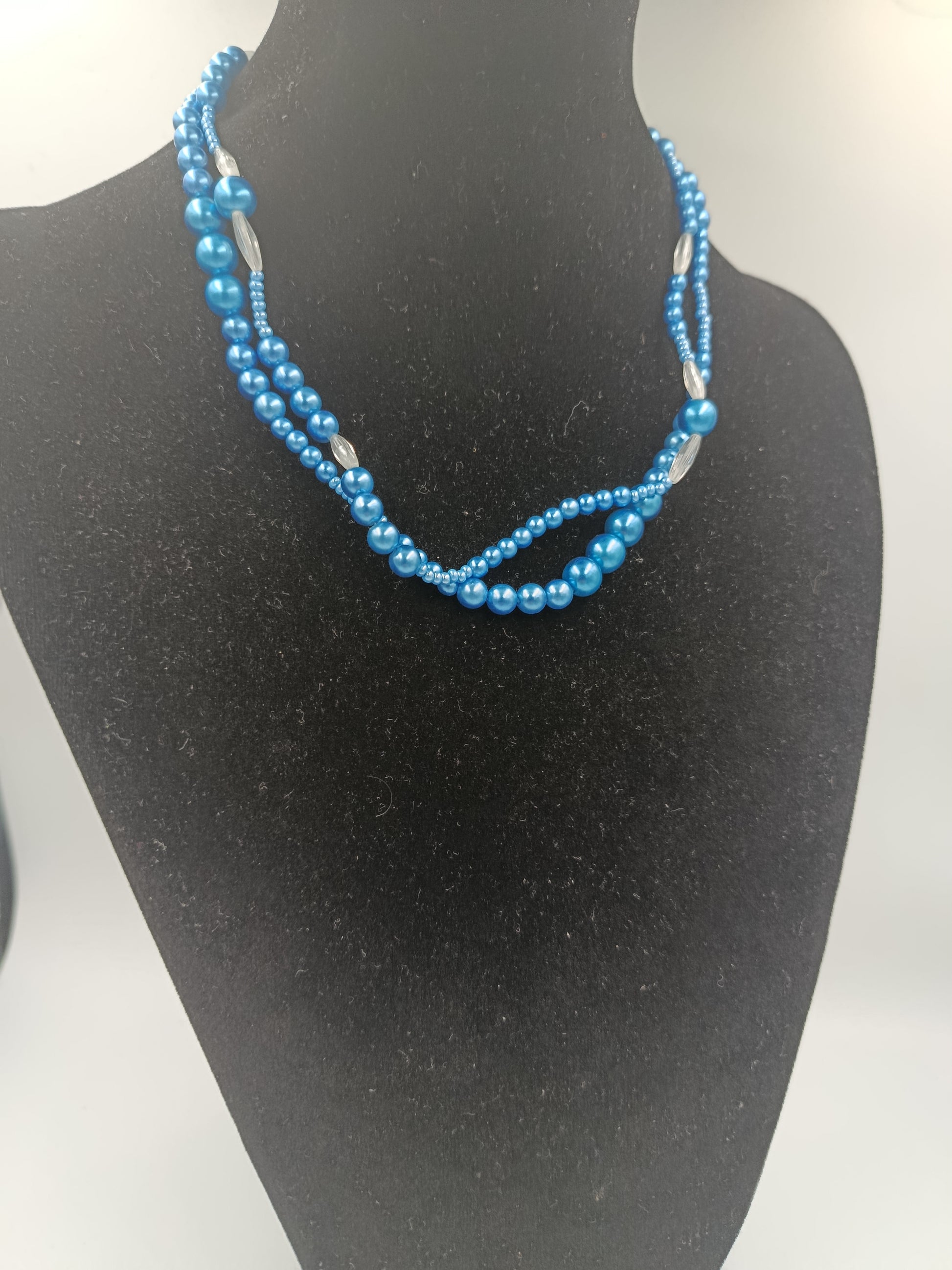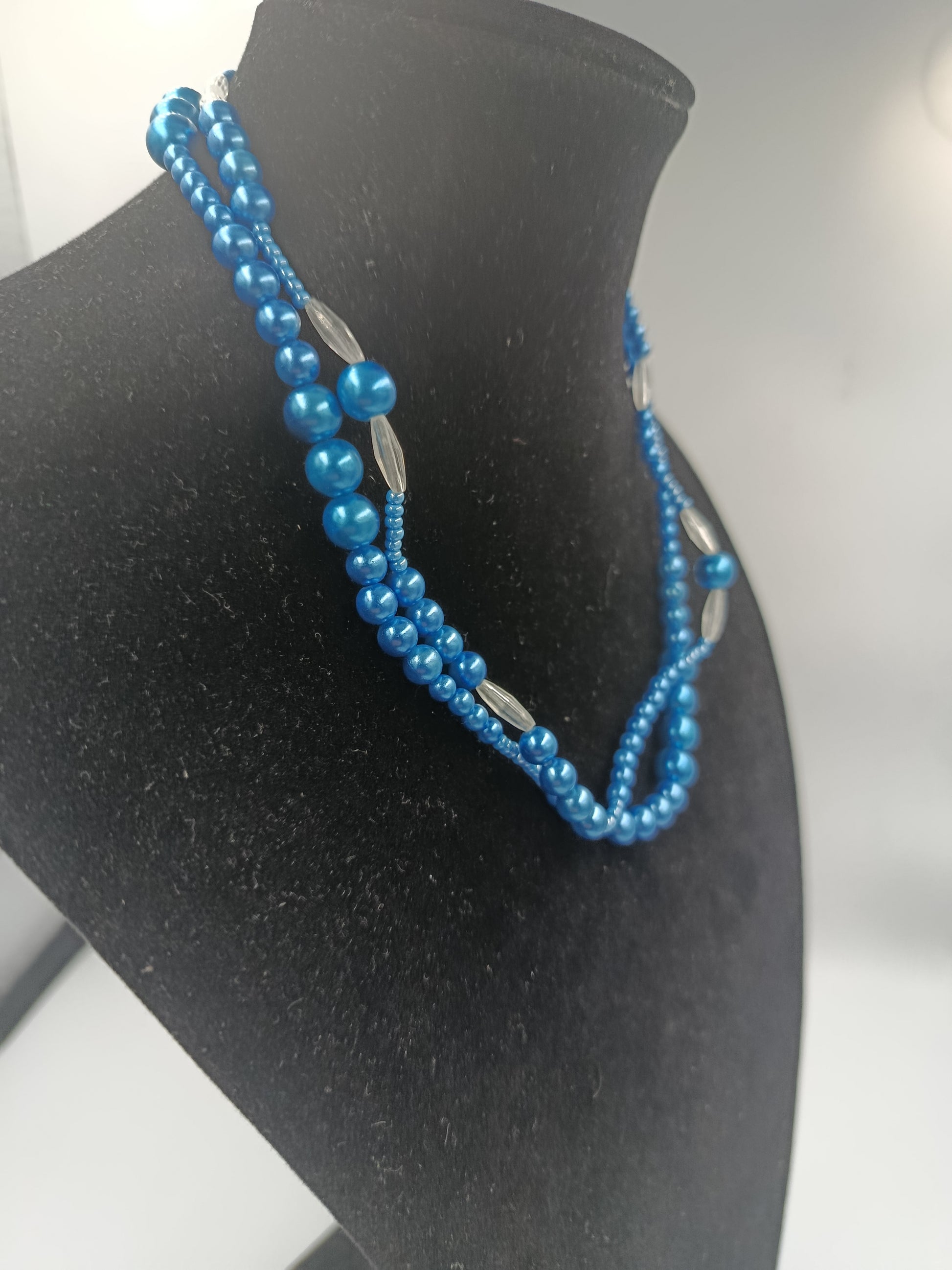 Diese bezaubernde, zweireihige Perlenkette in kräftigem Blau bringt lebendige Eleganz in jedes Outfit. Durch die Kombination von verschieden großen Glasperlen und silberfarbenen Zwischenelementen entsteht ein dynamisches Design, das zugleich klassisch und frisch wirkt. Ideal für Sammlerinnen von Vintage-Schmuck oder als stilvolles Accessoire für besondere Anlässe.