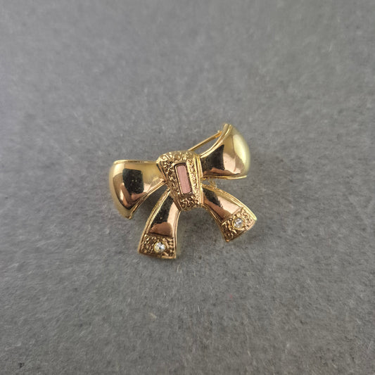 Kleine Vintage Schleifen Brosche – Goldfarben m. Strass