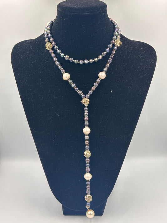 Lange Perlenkette mit Zirkonia-Steinen und Perlenanhänger
