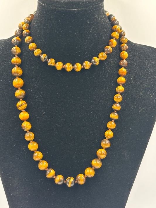Lange Tigereaugenstein-Perlenkette mit goldfarbenem Verschluss