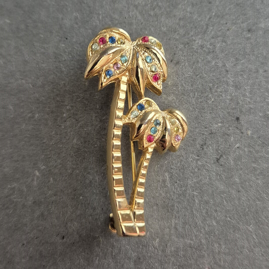 Vergoldete Palmen-Brosche mit bunten Strasssteinen – Tropischer Retro-Look