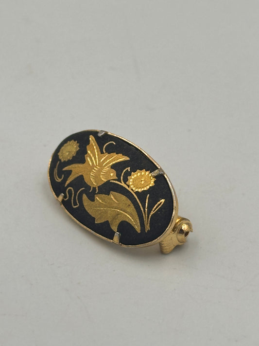 Vintage 1950s Damaszener Oval Brosche mit Vogel, Blumen und Blättern