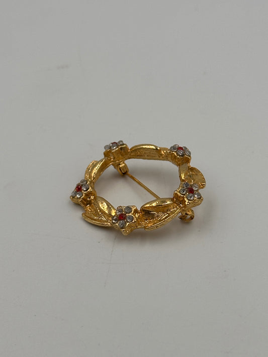 Vintage ACONDA Kranz Brosche Vergoldet mit Blumen und rotem Strass
