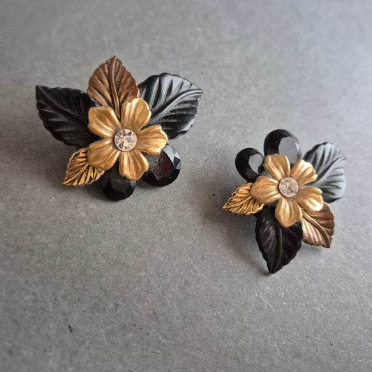 Vintage Clip-Ohrringe mit floralen Motiven – Schwarz-Goldener Retro-Charme