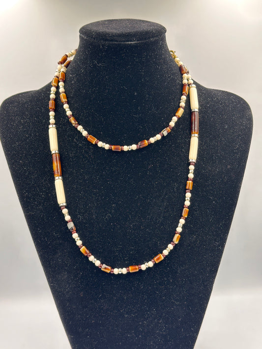 Vintage Lange Afrika Halskette Weiß-Braun mit Goldfarbenem Verschluss