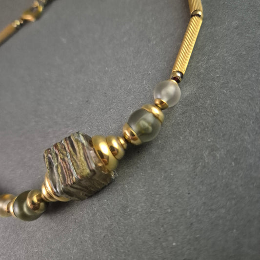 Vintage-Halskette mit goldfarbenen Röhrenelementen & Natursteinperle