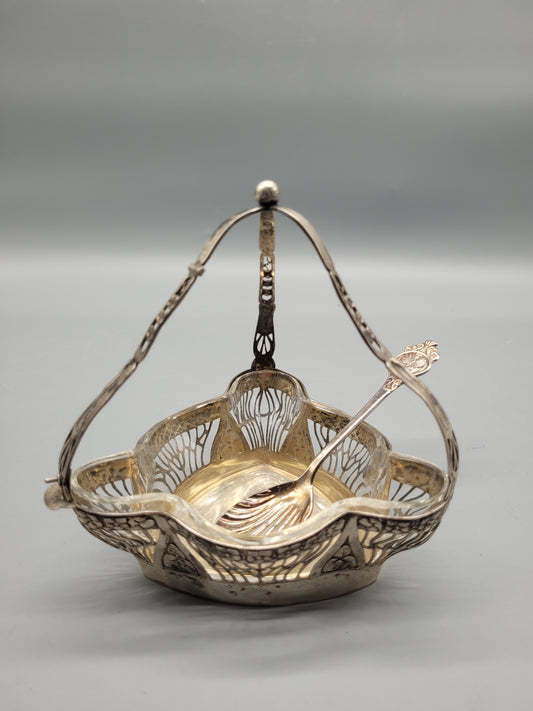 Art Nouveau Jugendstil 800er Silberschale mit Löffel und Halterung