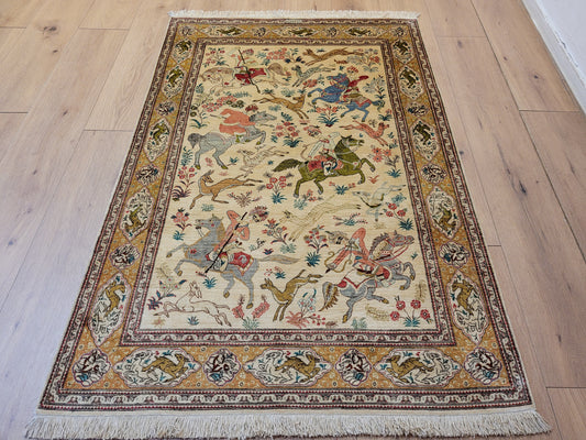 Ghom Seide auf Seide Teppich Jagdszene figürlich fein signiert