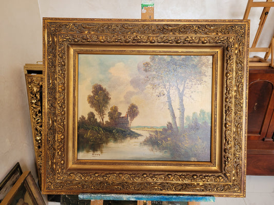 A. Ram (XX) Ölgemälde Flusslandschaft mit kleinem Haus 63x75cm