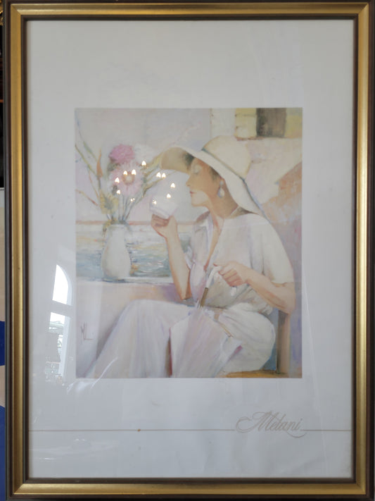Sommerliche Original Grafik (XX) Dame auf Kaffeetasse Melani 75x55cm