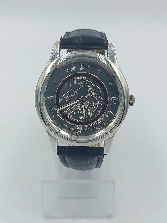 Runde Armbanduhr mit schwarzem Lederband und kunstvollem Motiv Elegant