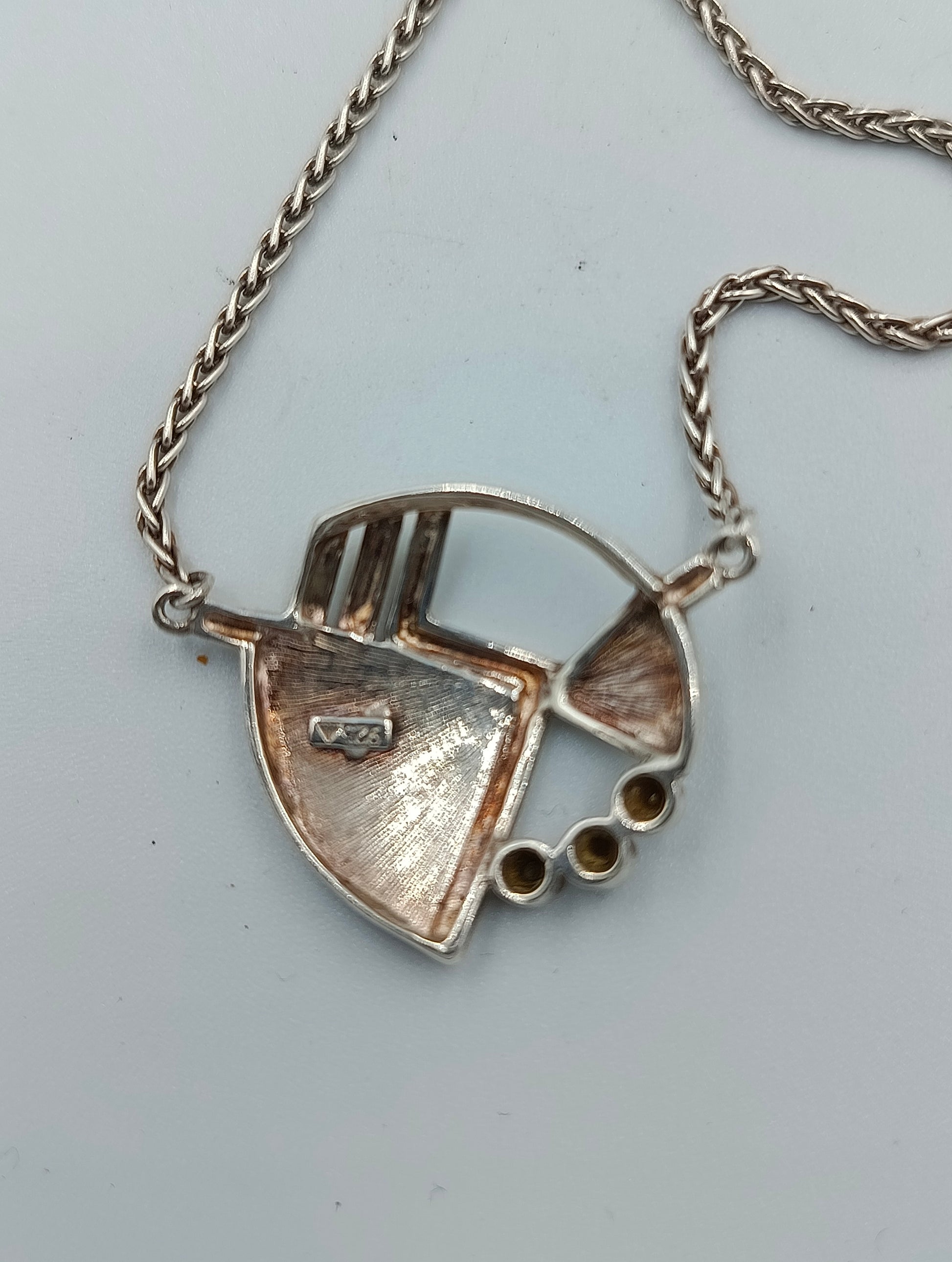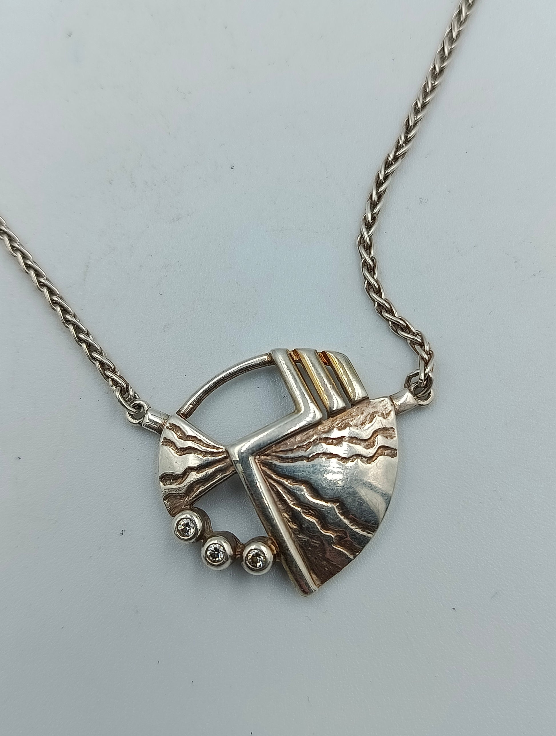 Elegante Halskette aus echtem 925er Silber mit einem außergewöhnlichen, geometrischen Anhänger. Das moderne Design mit klaren Linien und dezenten Akzenten verleiht ihr einen kunstvollen, zeitlosen Charakter. Ideal für Liebhaber individueller Schmuckstücke.