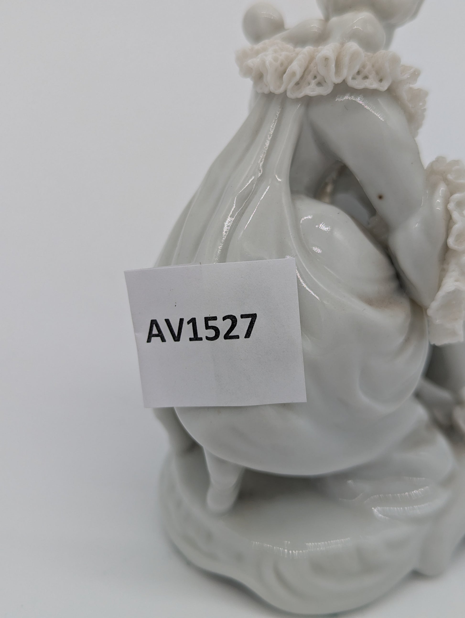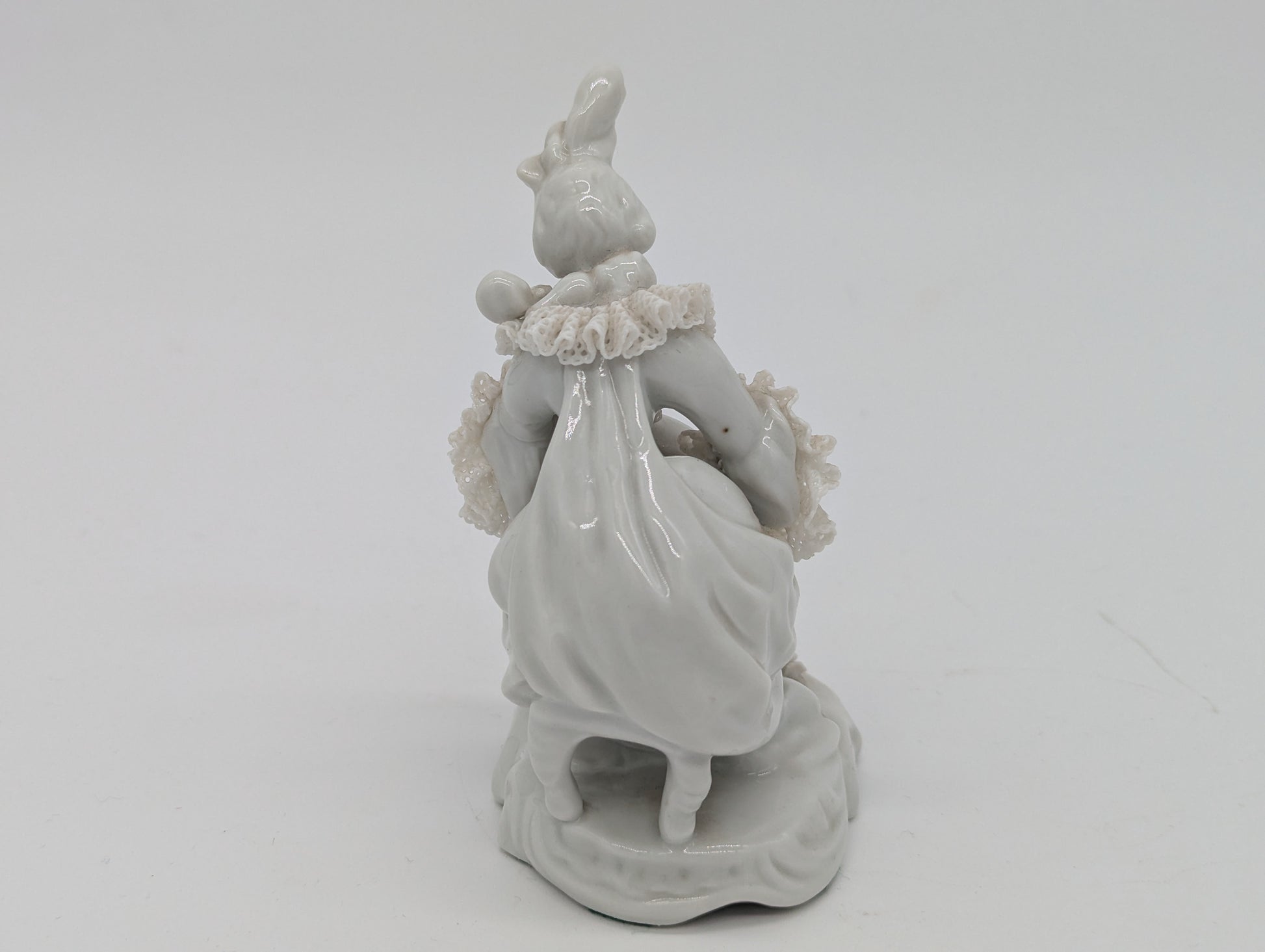 Diese elegante Aelteste Volkstedt Porzellanfigur zeigt eine sitzende Dame, die ein Cello spielt. Besonders beeindruckend ist die feine Spitzenporzellan-Arbeit an Kragen und Ärmeln – eine handwerkliche Spezialität der Thüringer Porzellankunst. Das Stück überzeugt durch feine Modellierung, harmonische Proportionen und meisterliche Detailarbeit.