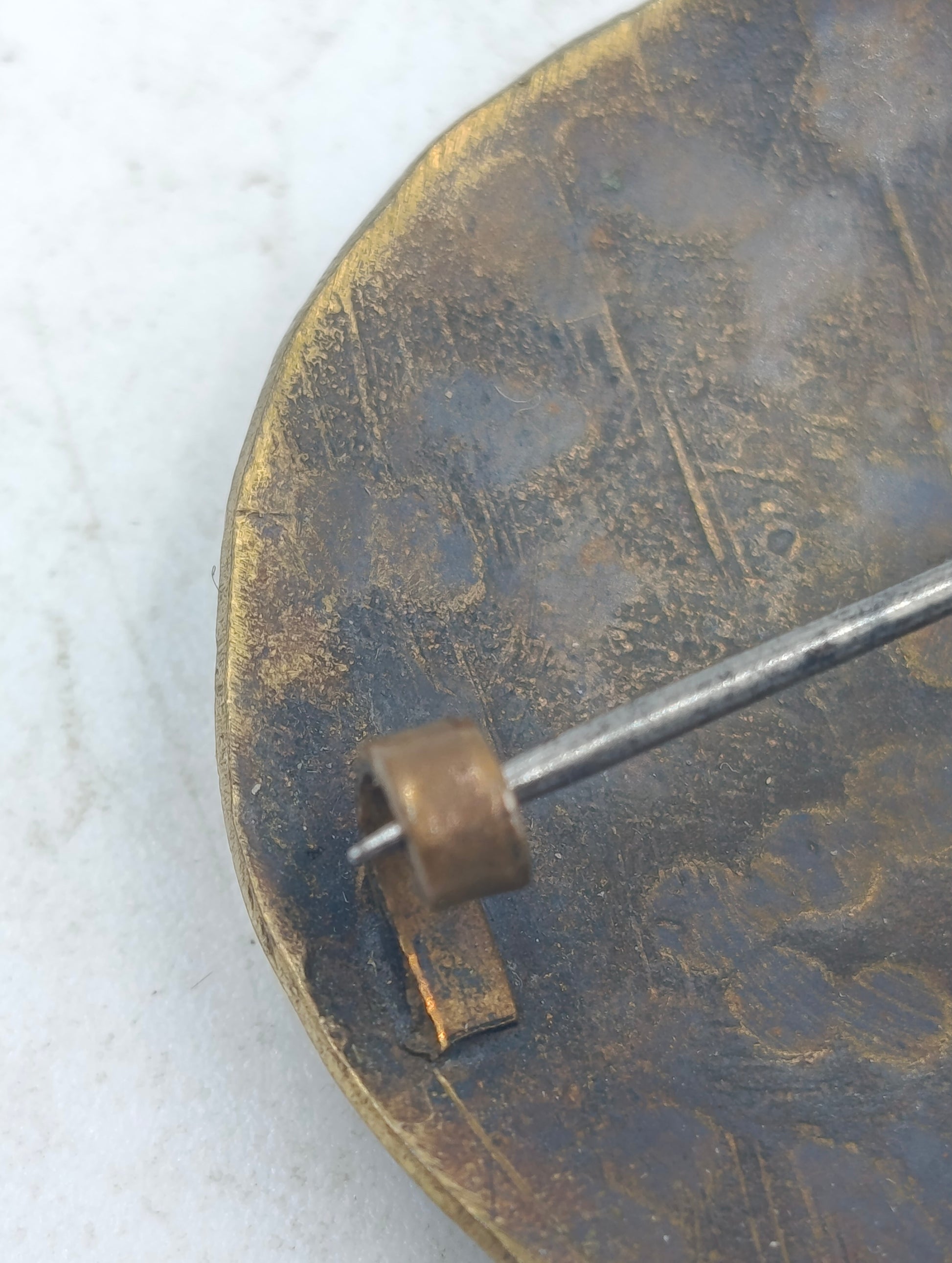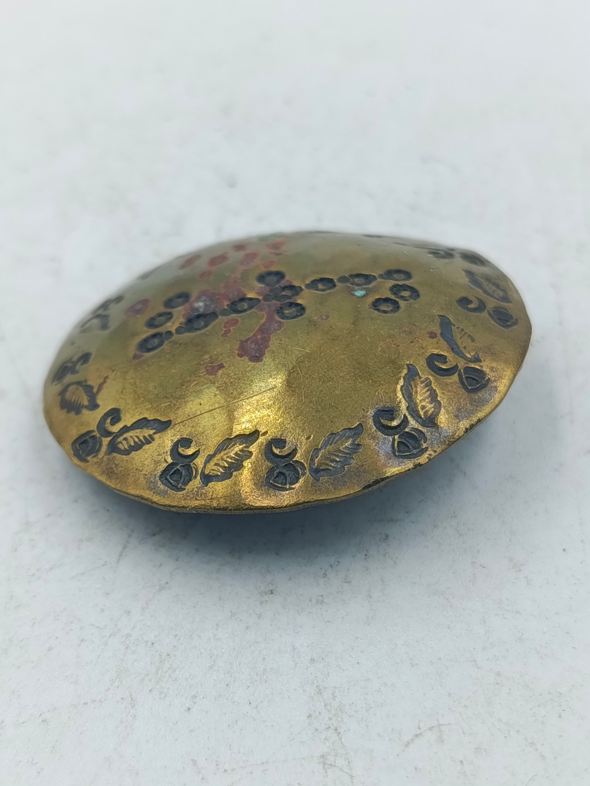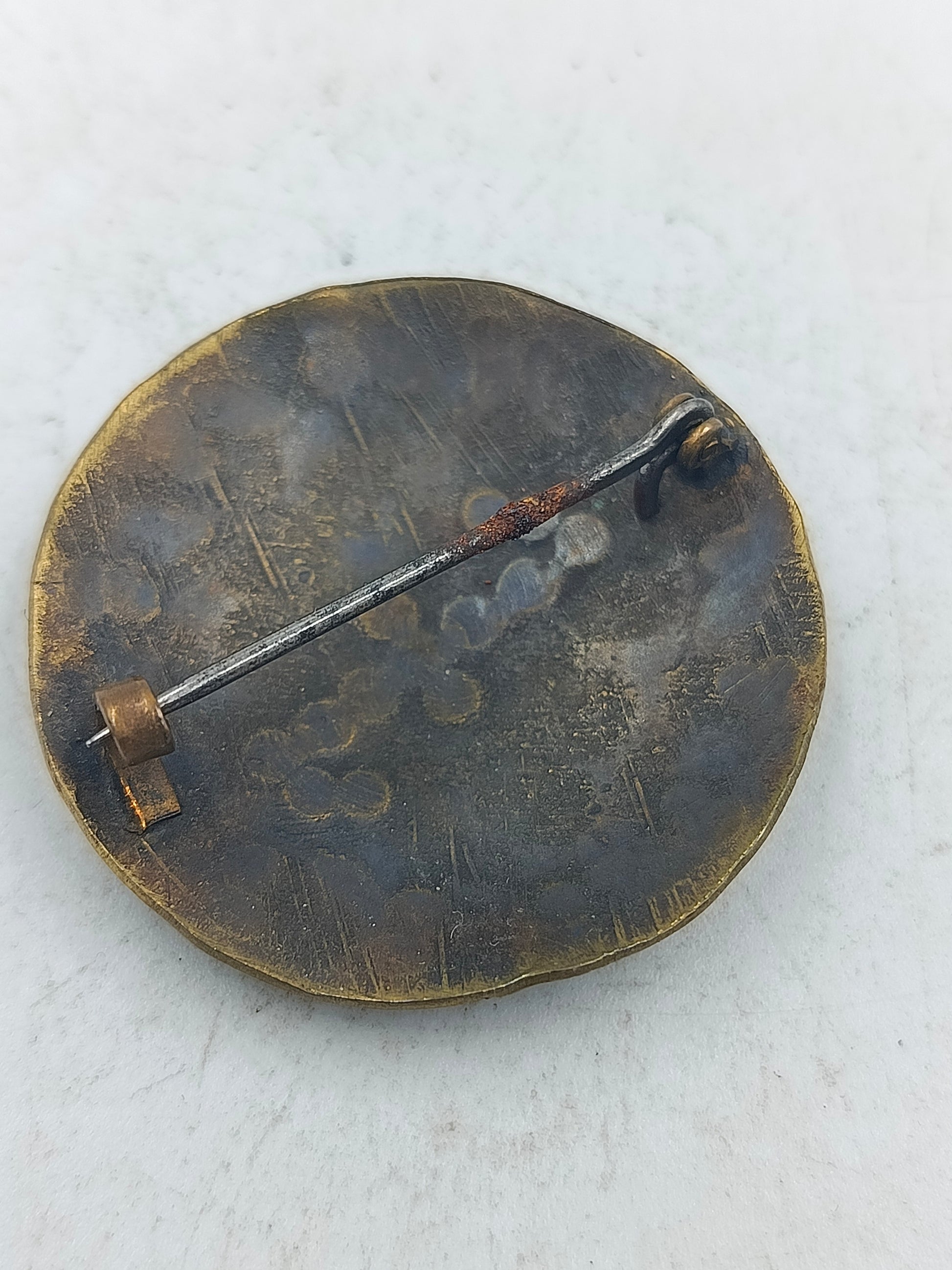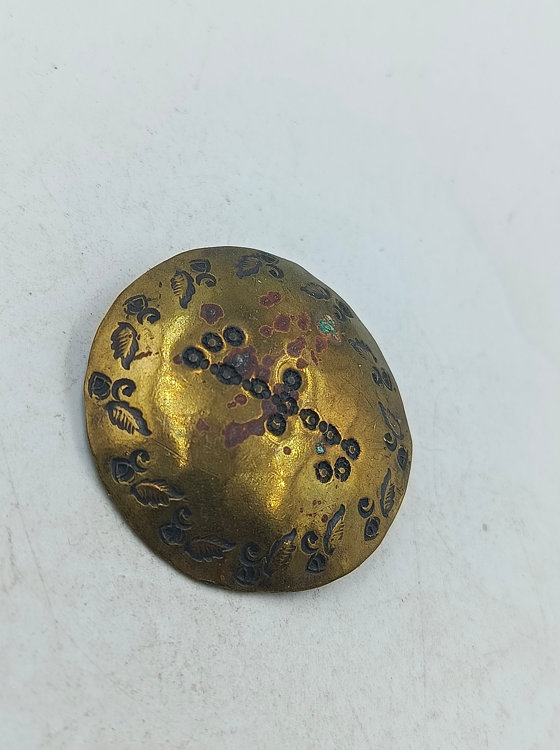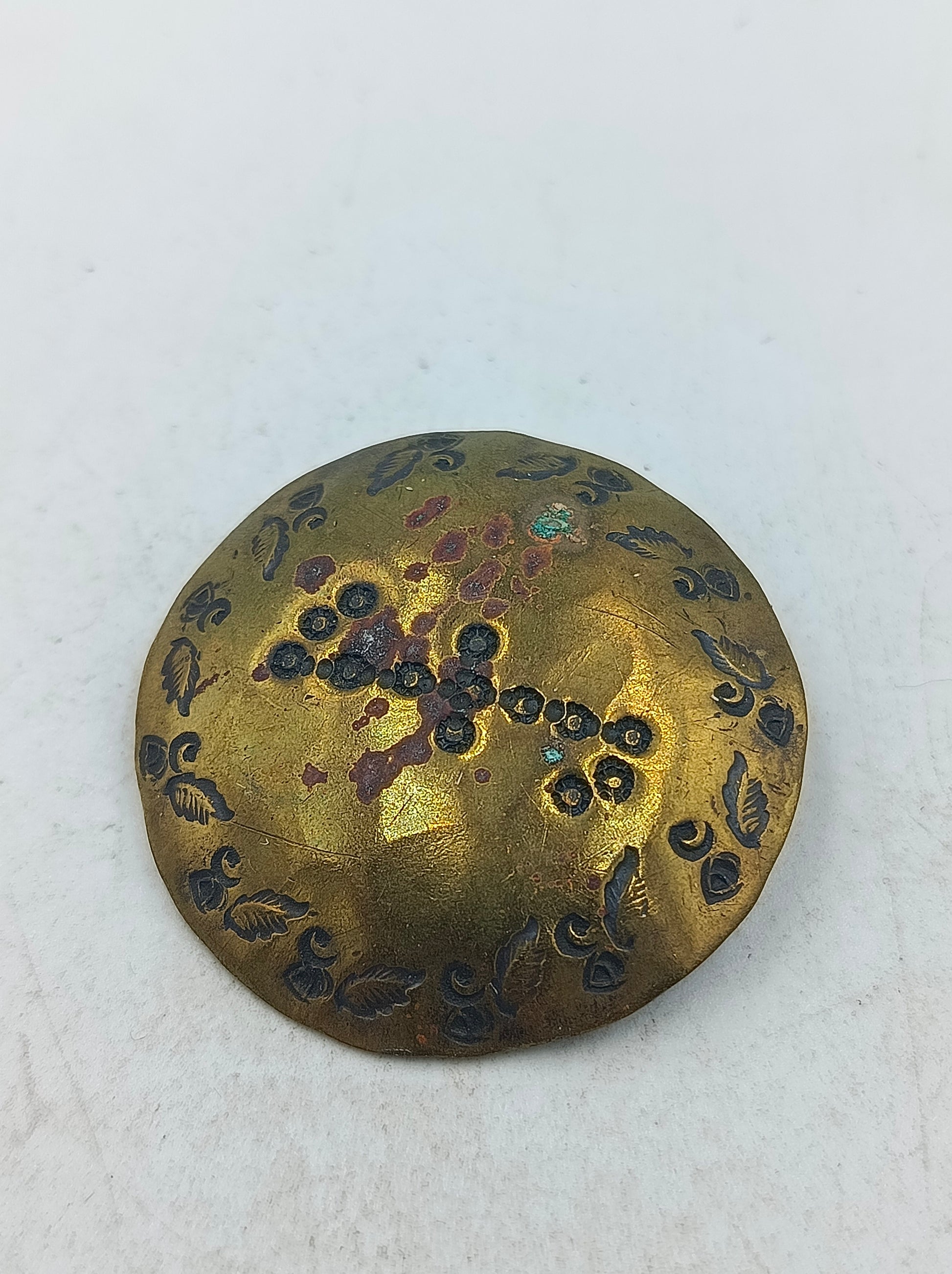 Diese runde Brosche zeigt ein fein gearbeitetes florales Muster mit dunklen und rötlichen Akzenten auf warmem goldfarbenem Grund. Die Oberfläche wirkt leicht patiniert und verleiht dem Schmuckstück einen authentischen antiken Charakter. Durch den stabilen Nadelverschluss auf der Rückseite lässt sich die Brosche sicher an Kleidung oder Tüchern befestigen und eignet sich ideal als dekoratives Sammlerstück oder stilvolles Accessoire.
