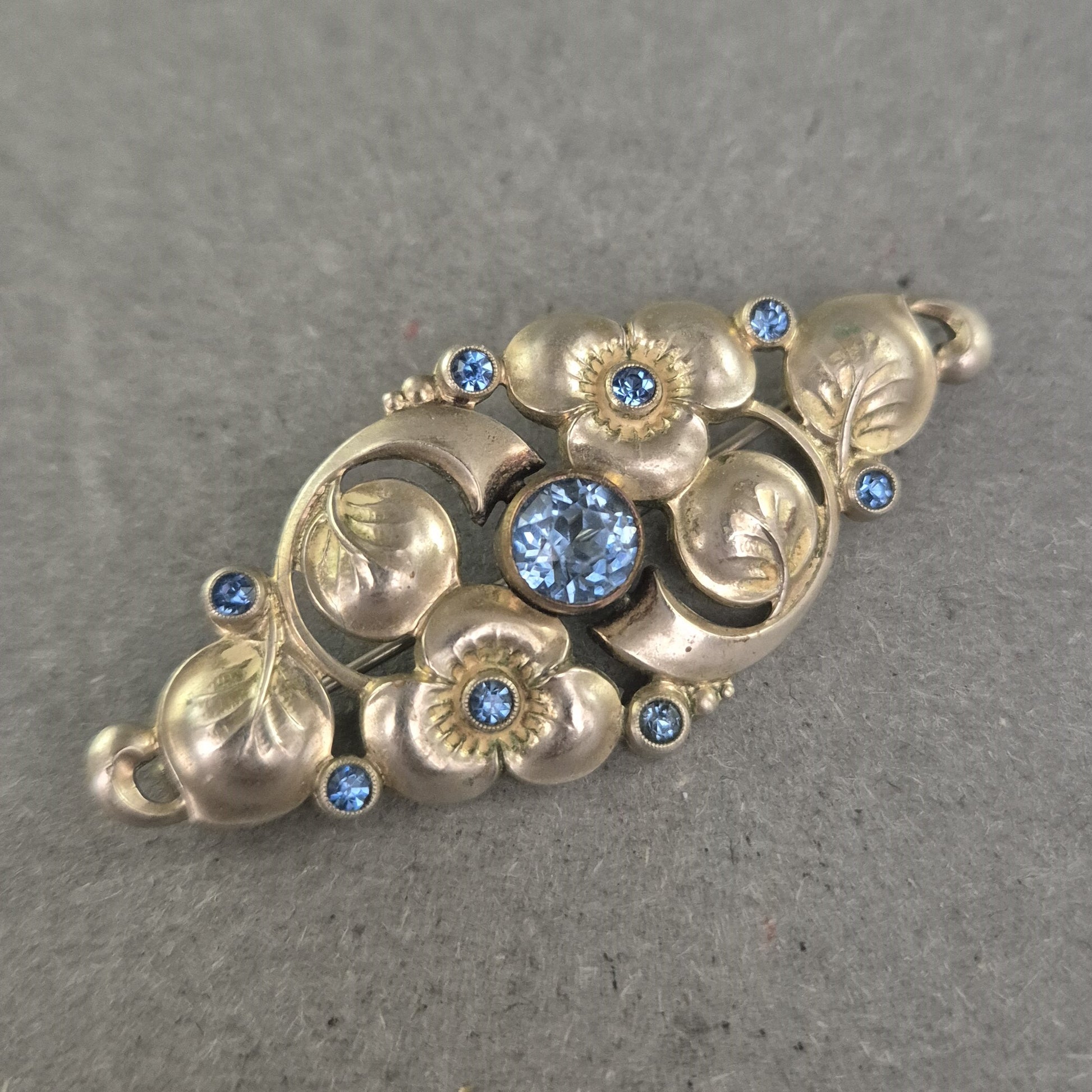 Antike florale Brosche mit blauen Strasssteinen – Eleganz im Jugendstil