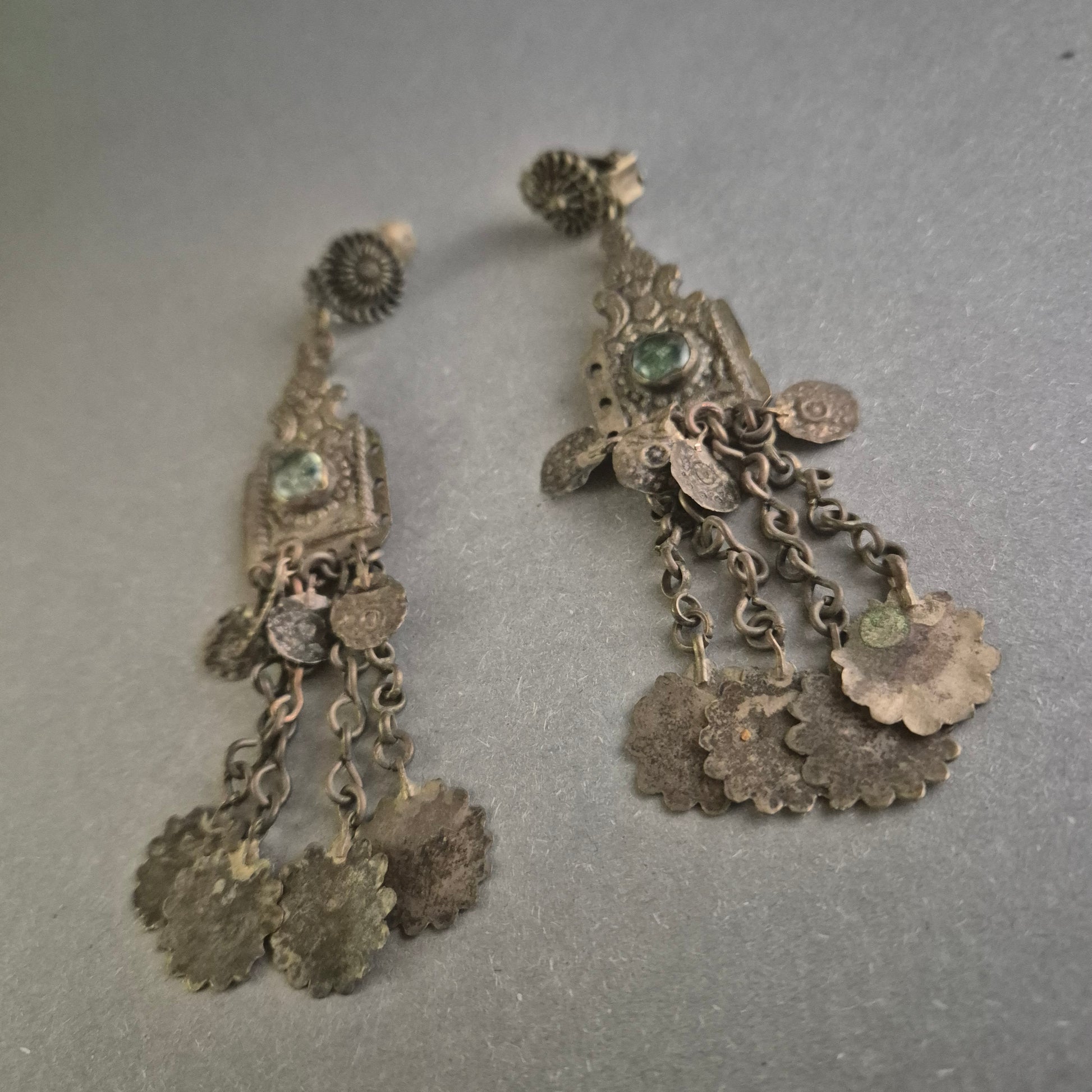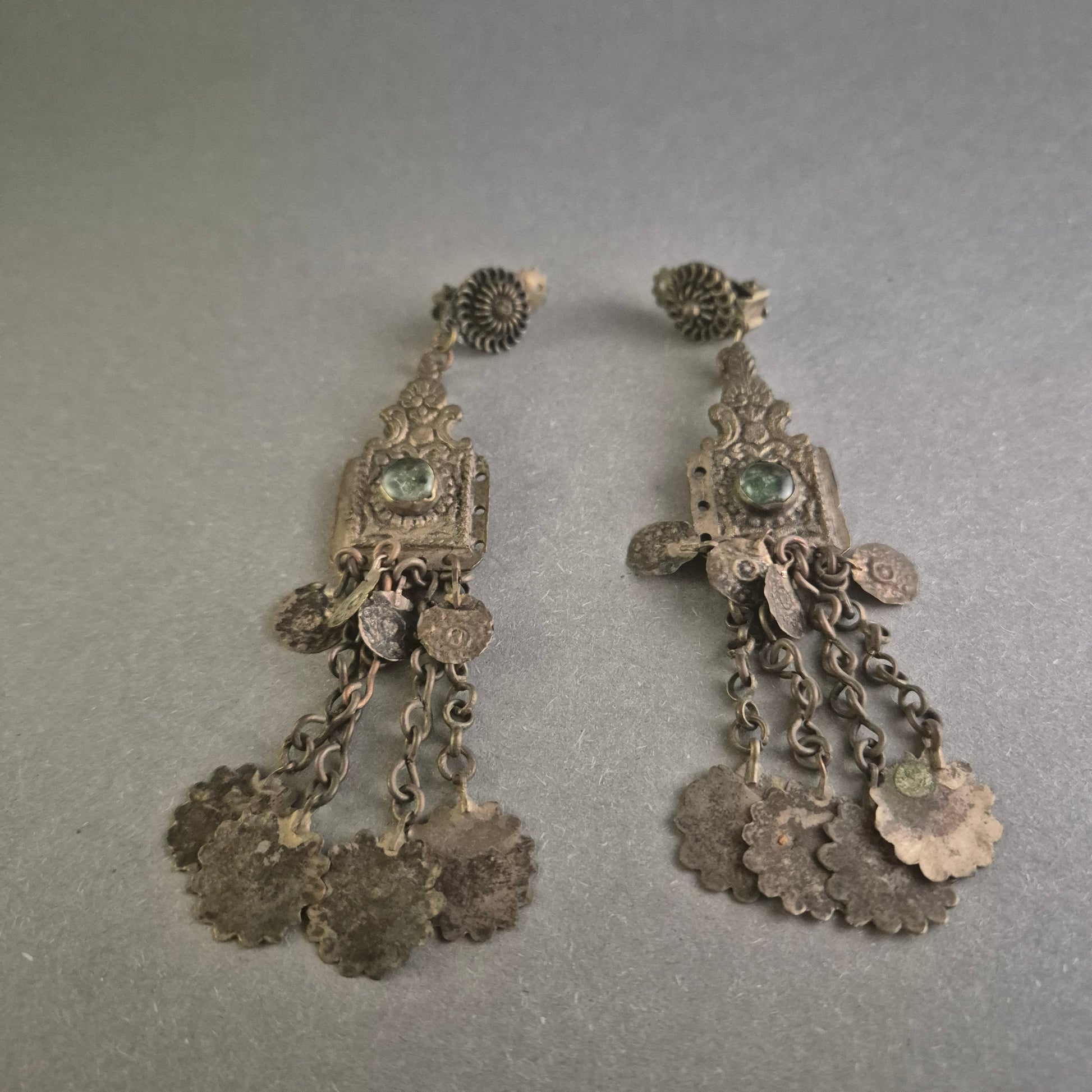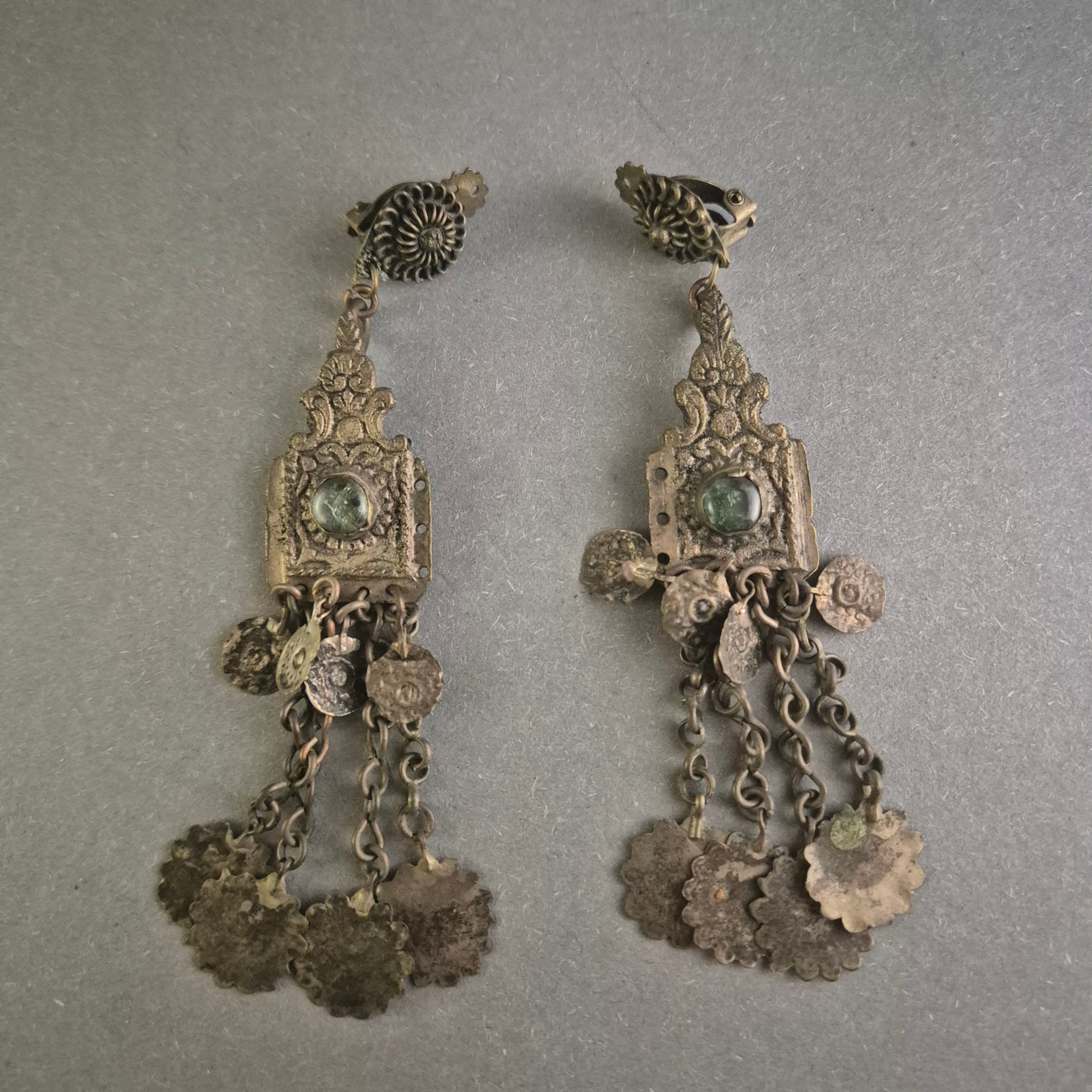 Diese außergewöhnlichen antiken Ohrringe stammen aus Marokko und bestechen durch ihr kunstvolles Design mit filigranen Münzelementen und grün schimmernden Steinen. Das orientalisch angehauchte Muster und die detaillierten Anhänger verleihen den Ohrringen einen geheimnisvollen und eleganten Charme. Ein wahrer Hingucker für Liebhaber historischer Schmuckstücke und marokkanischer Handwerkskunst.