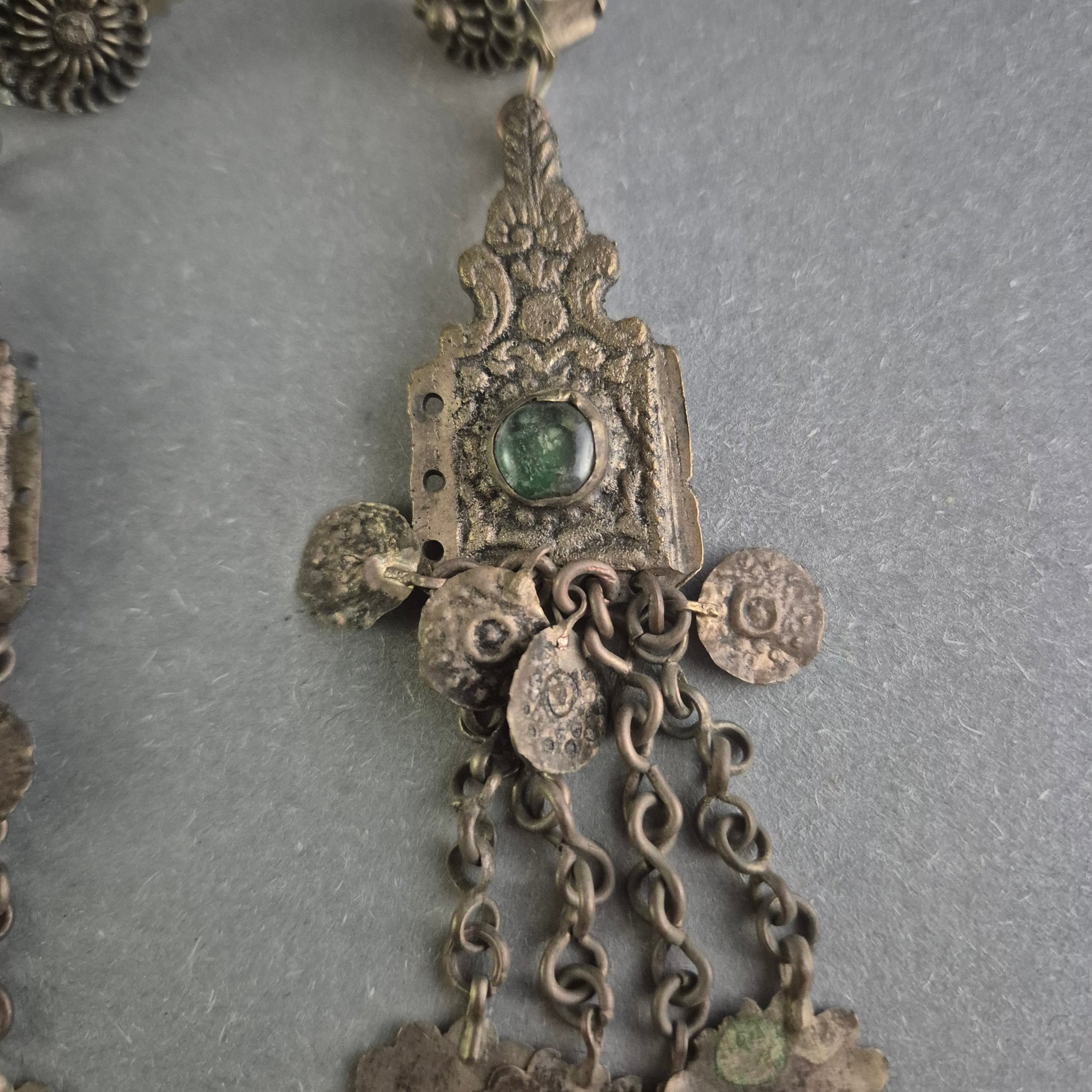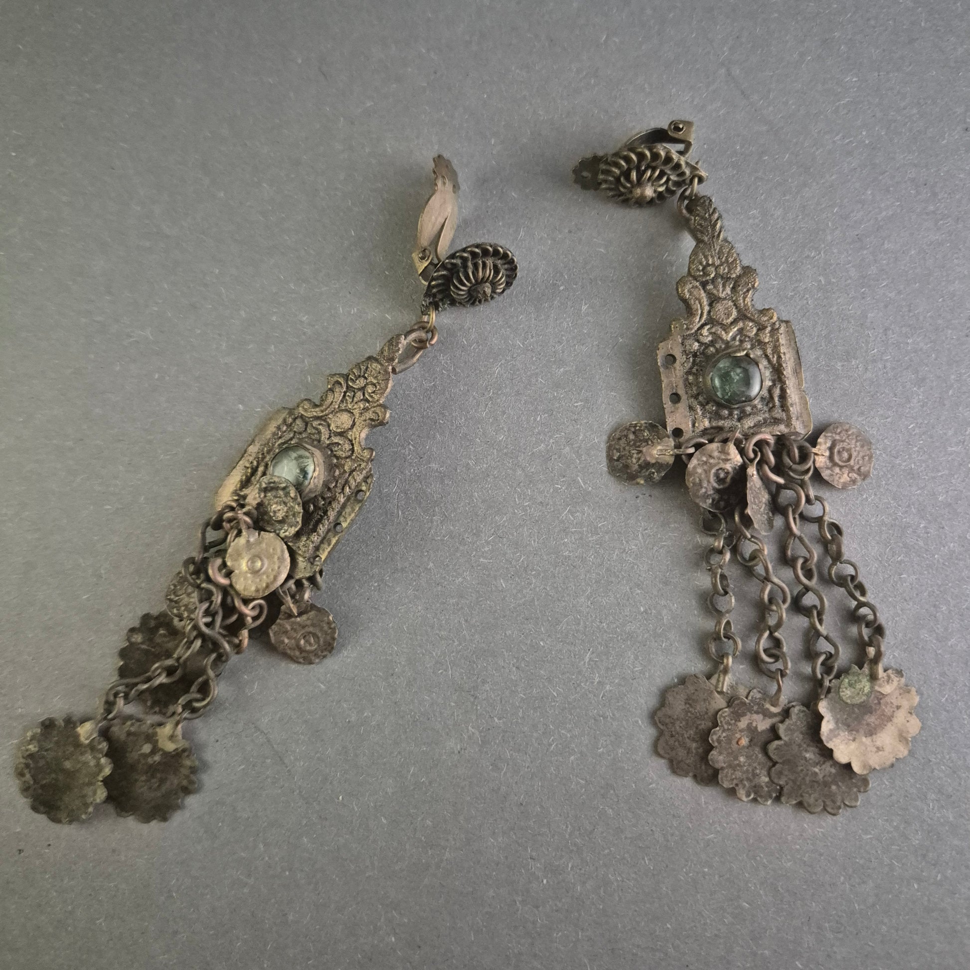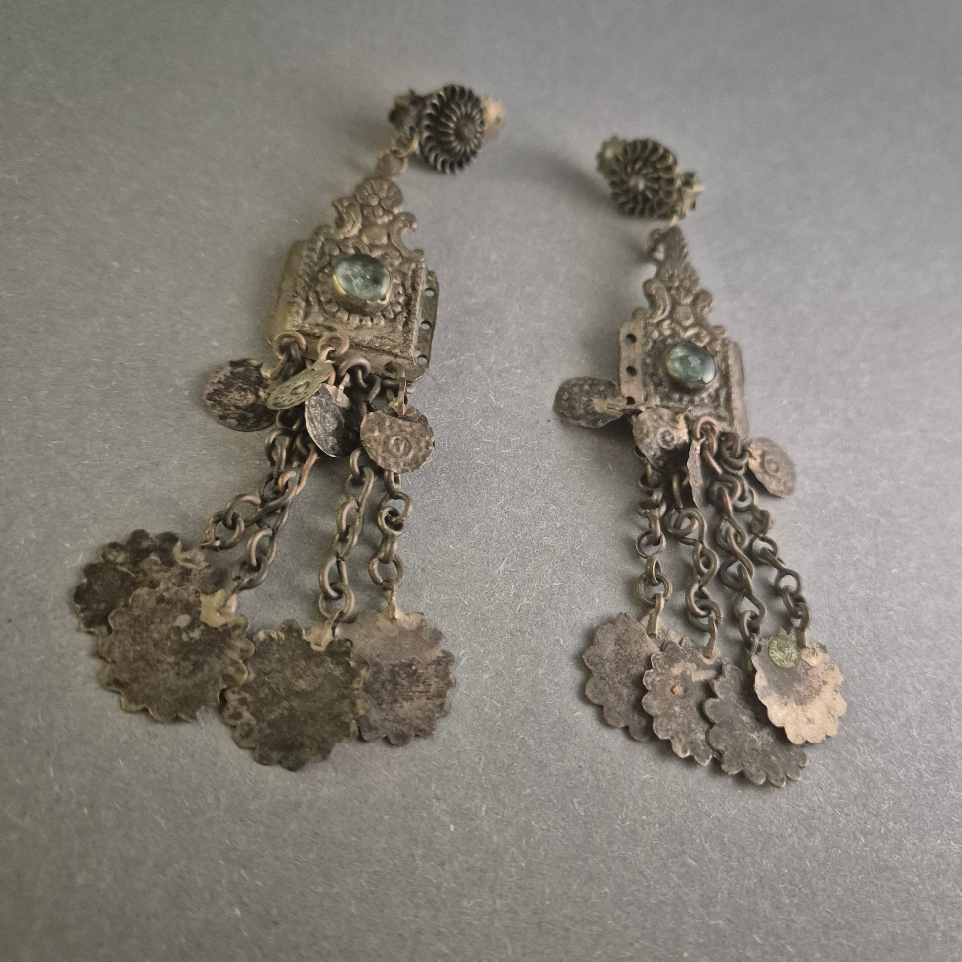 Diese außergewöhnlichen antiken Ohrringe stammen aus Marokko und bestechen durch ihr kunstvolles Design mit filigranen Münzelementen und grün schimmernden Steinen. Das orientalisch angehauchte Muster und die detaillierten Anhänger verleihen den Ohrringen einen geheimnisvollen und eleganten Charme. Ein wahrer Hingucker für Liebhaber historischer Schmuckstücke und marokkanischer Handwerkskunst.