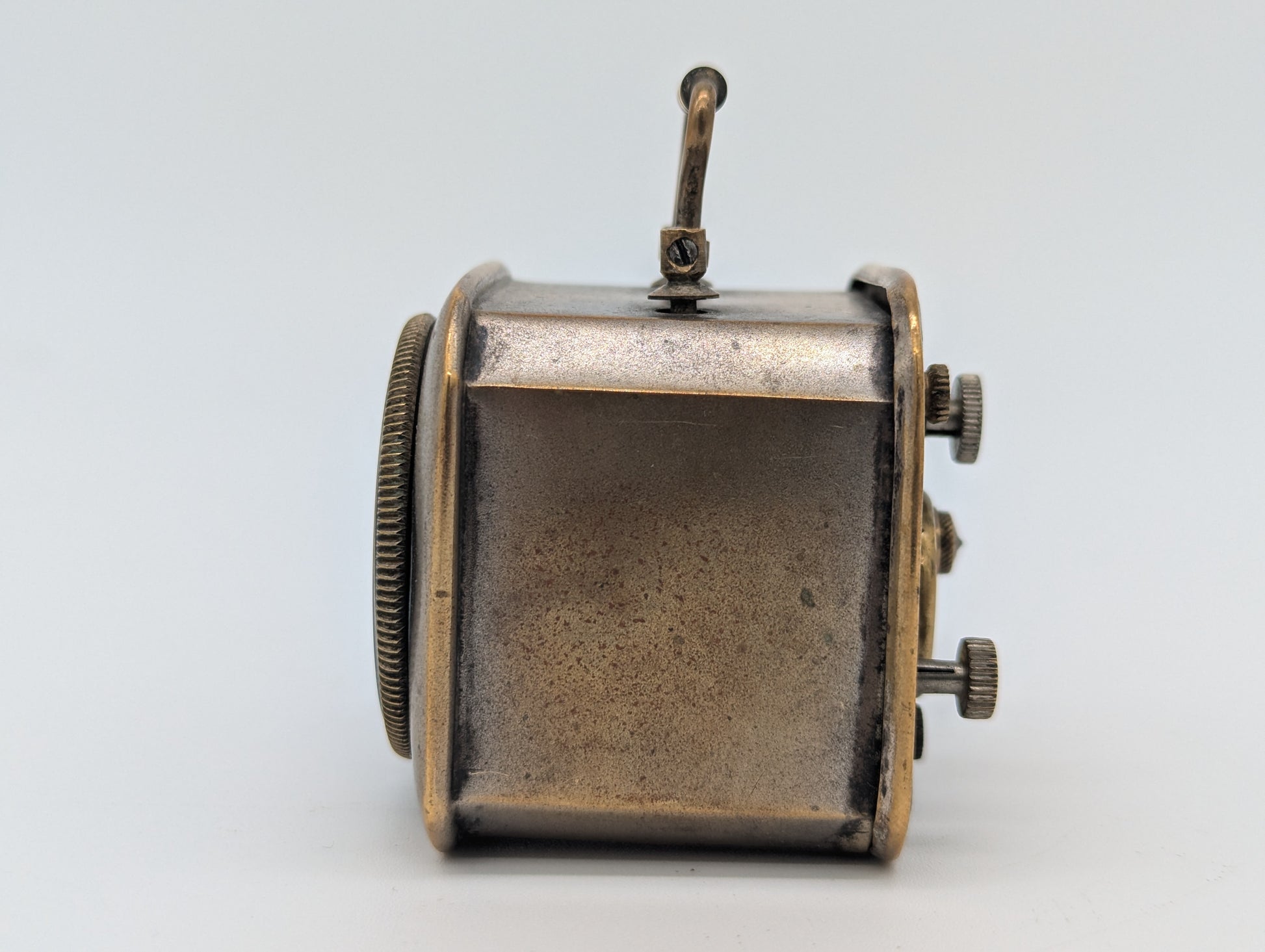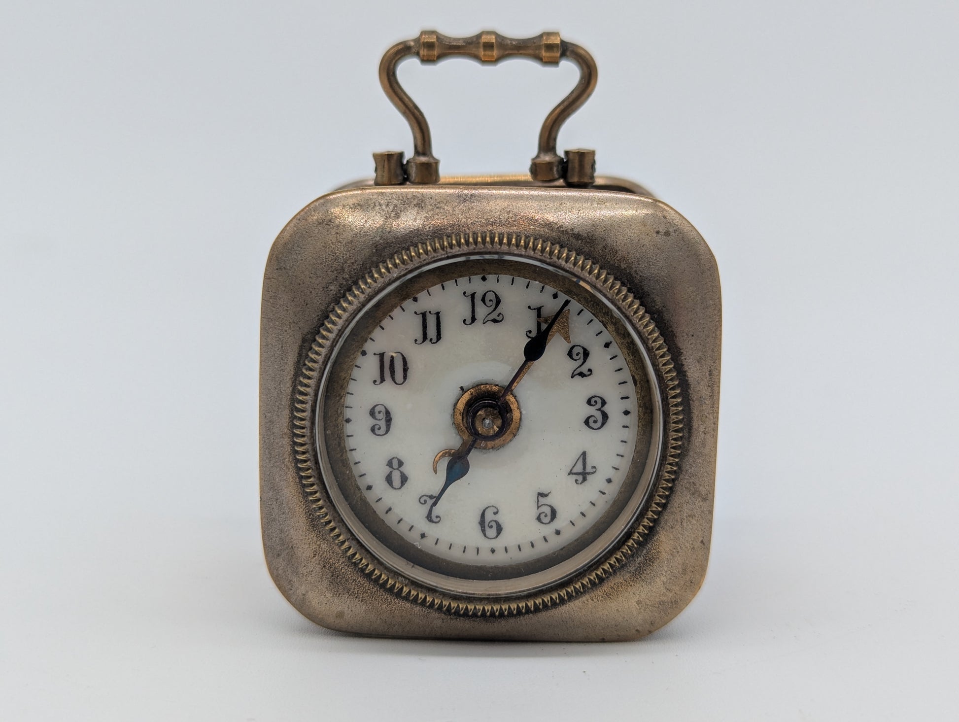 Dieser französische Miniatur Reisewecker überzeugt mit seinem charmanten Vintage-Design und kompaktem Format. Das quadratische Gehäuse ist aus Metall gefertigt und zeigt eine schöne Messingpatina, die dem Stück einen authentischen, antiken Charakter verleiht.