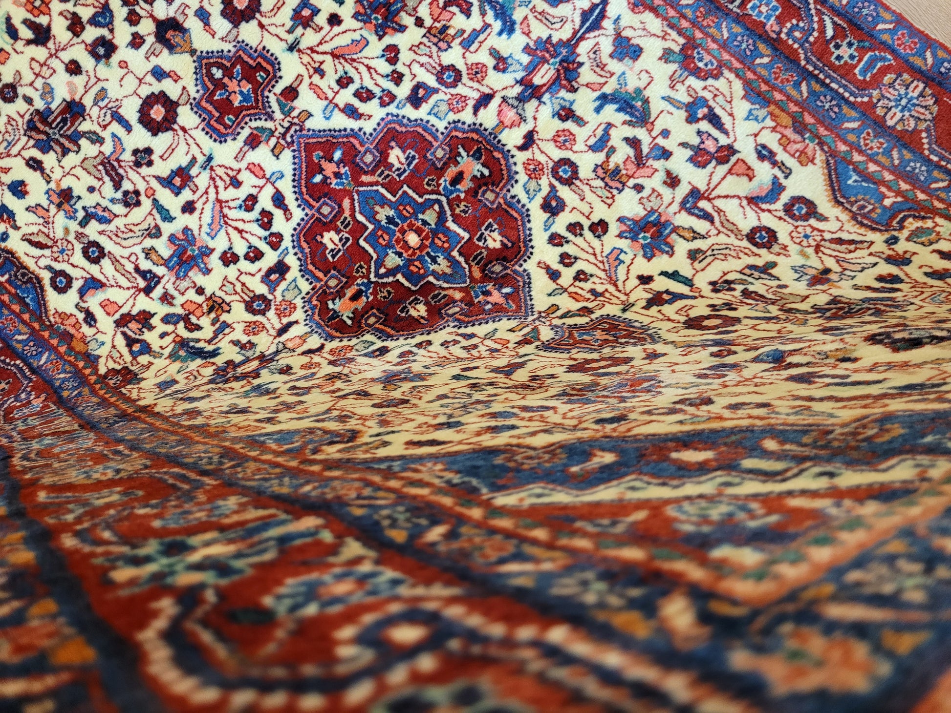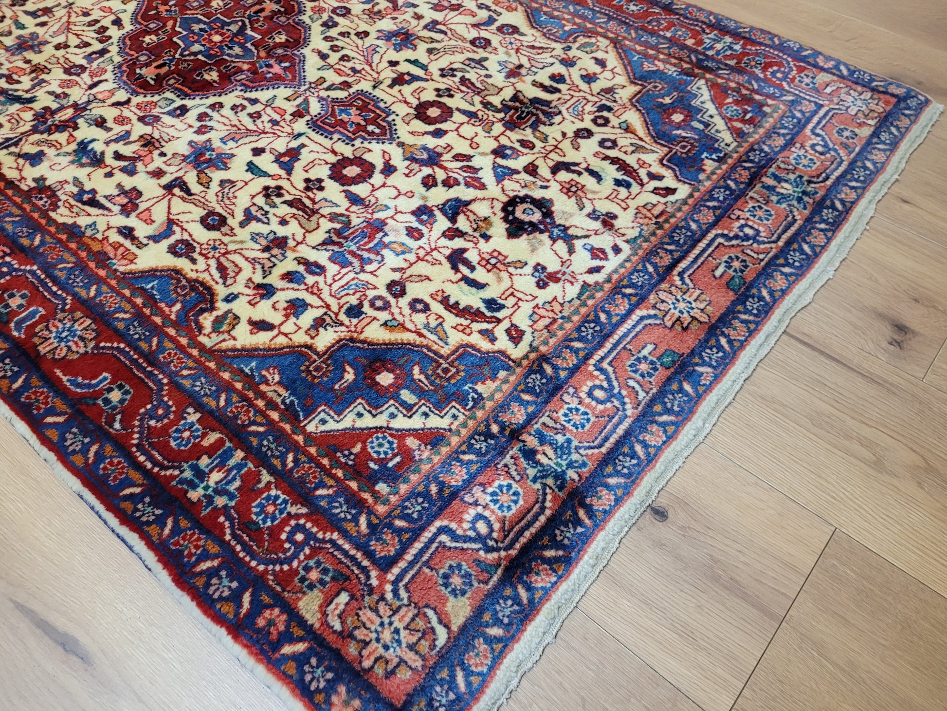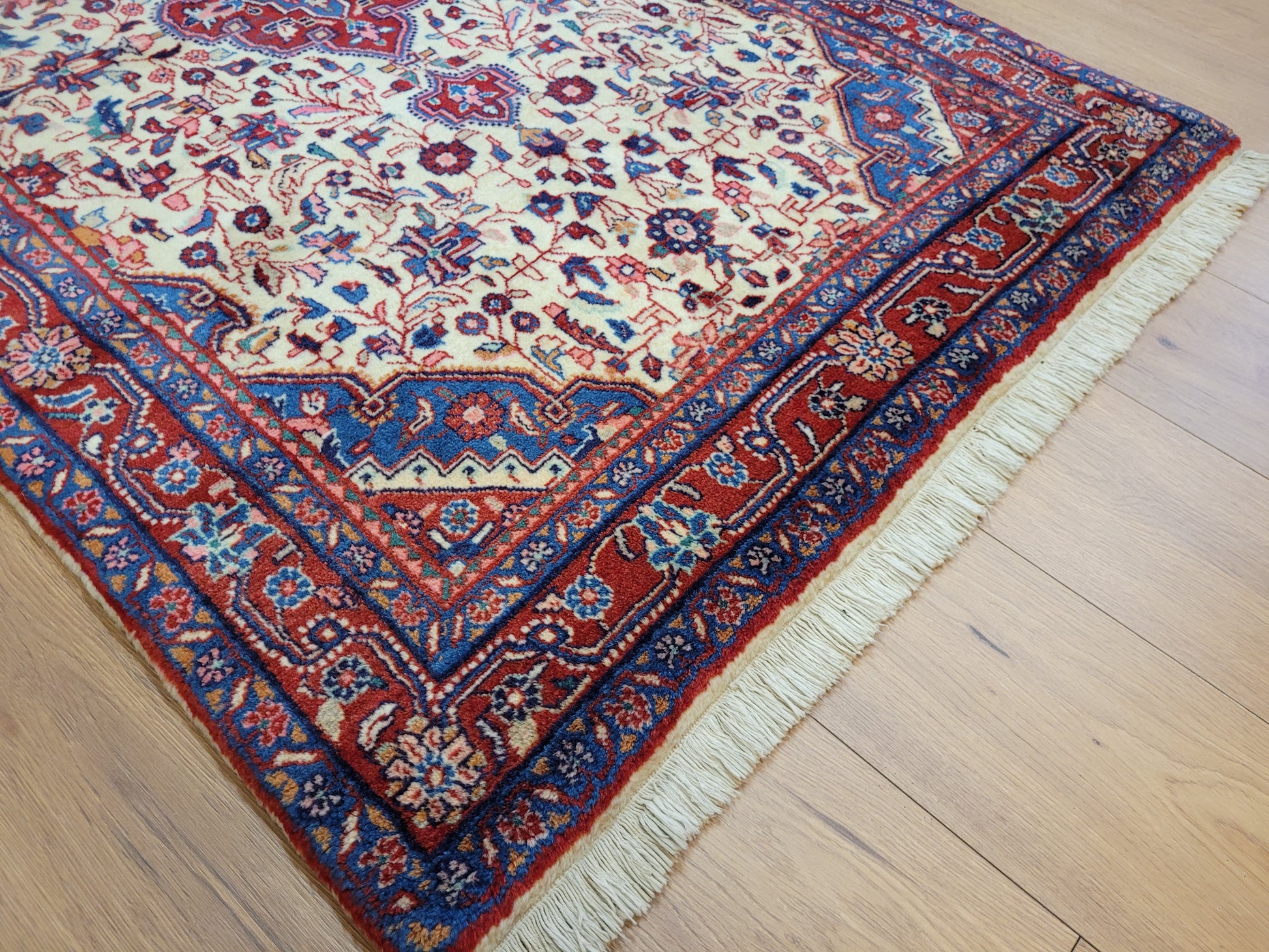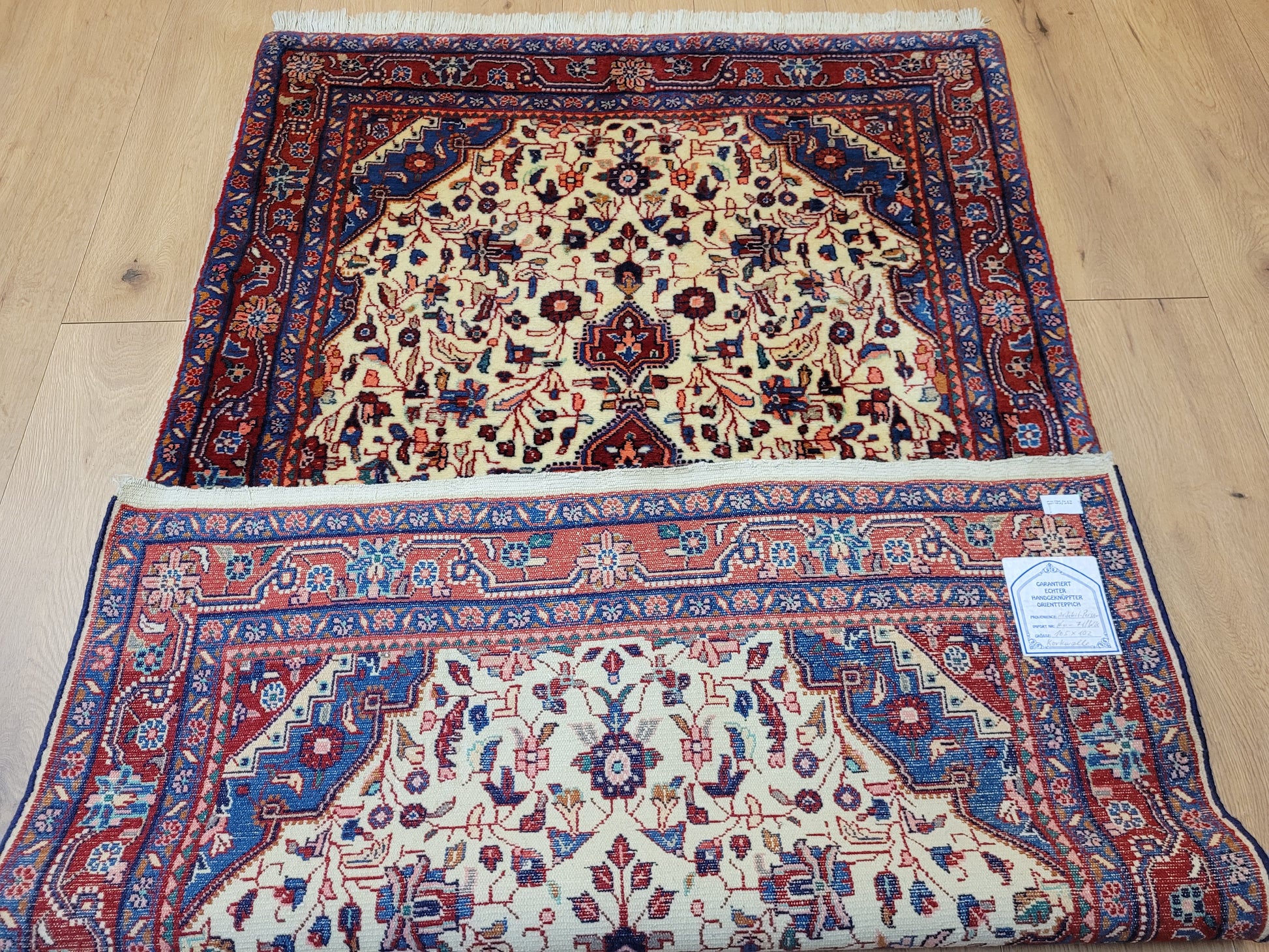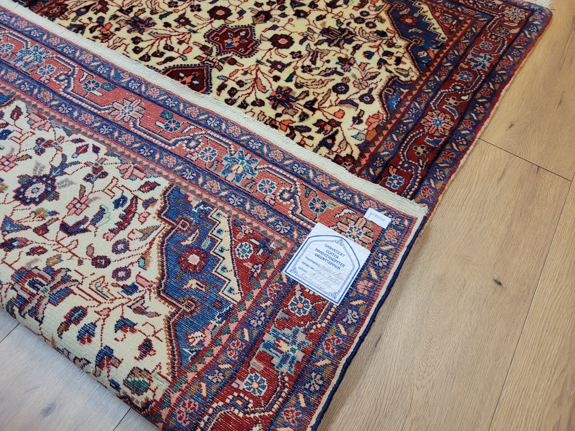 angeboten wird ein klassischer Ardebil Teppich aus feiner Korkwolle, handgeknüpft mit kunstvoller Ausarbeitung. Das zentrale Medaillon in Rot ist von einem hellen Fondfeld umgeben, das mit filigranen Blütenranken, Palmetten und geschwungenen Arabesken gefüllt ist. In den Ecken heben sich blau gestaltete Kartuschen ab, die dem Gesamtbild Tiefe verleihen. Die mehrfarbige Bordüre mit floralen Ornamenten rundet die Komposition stilvoll ab.