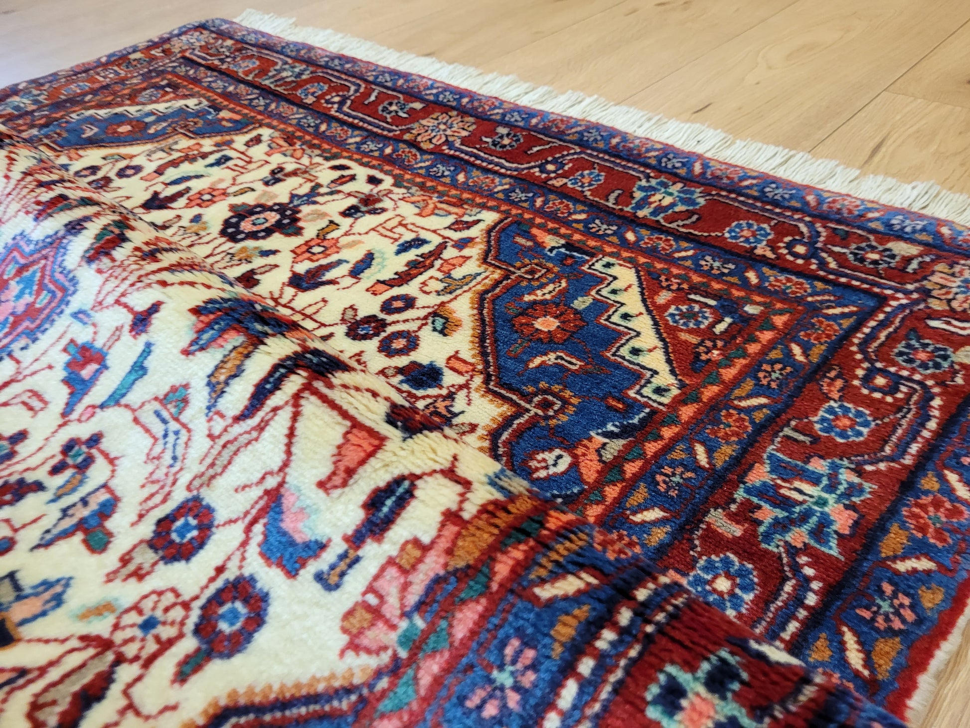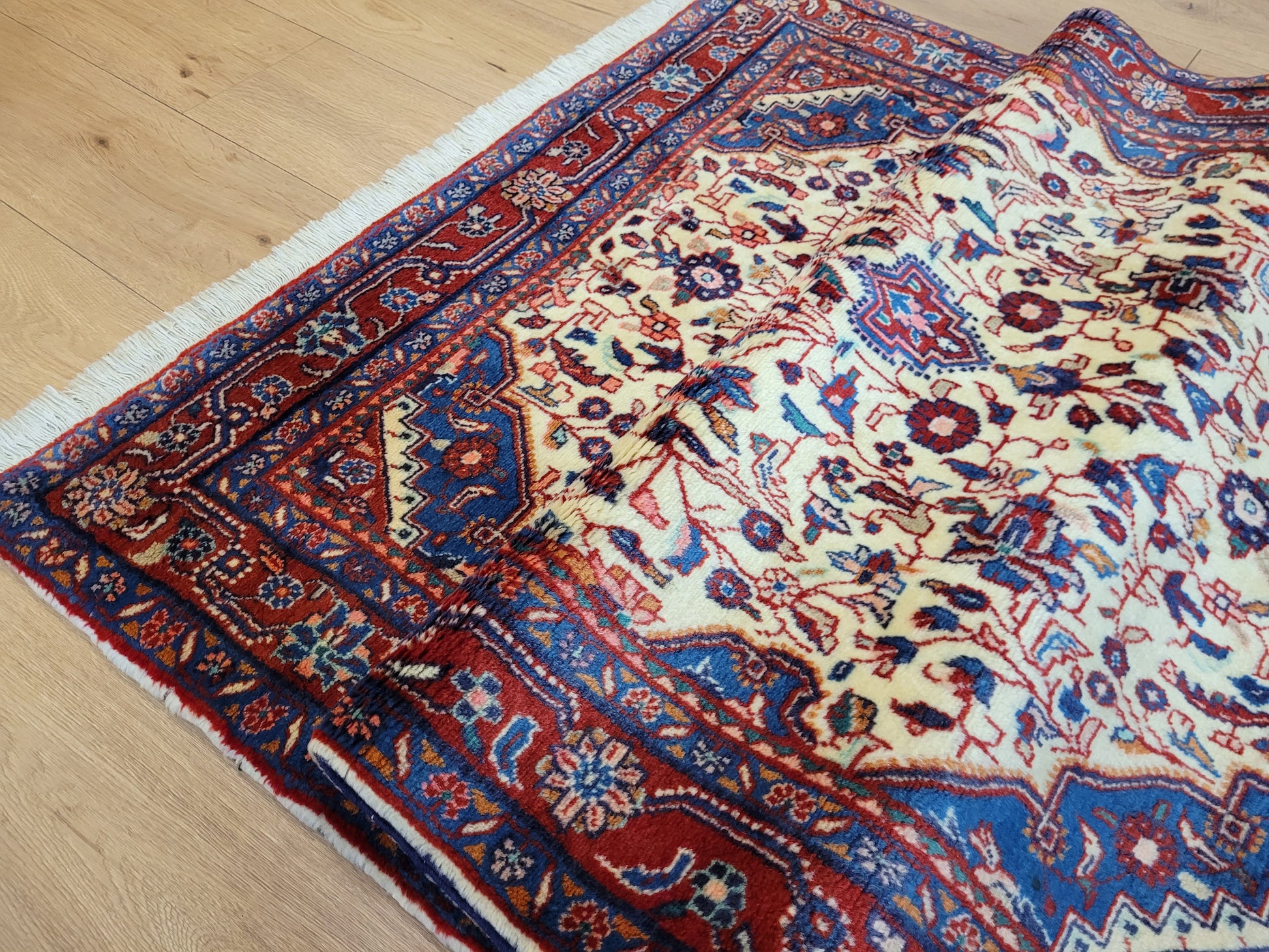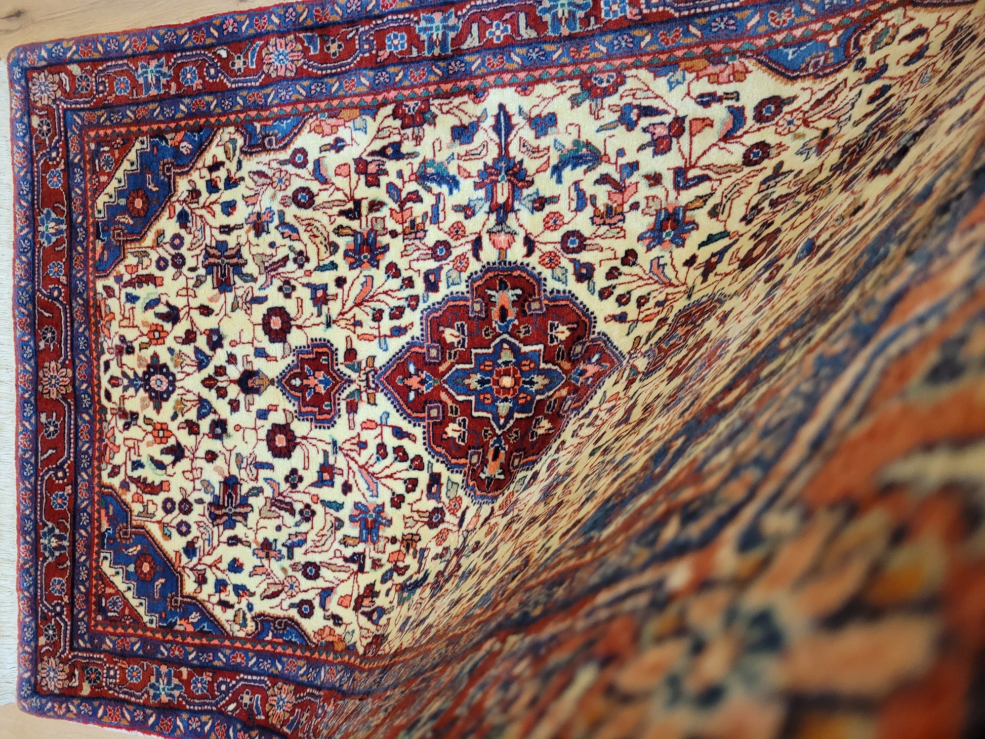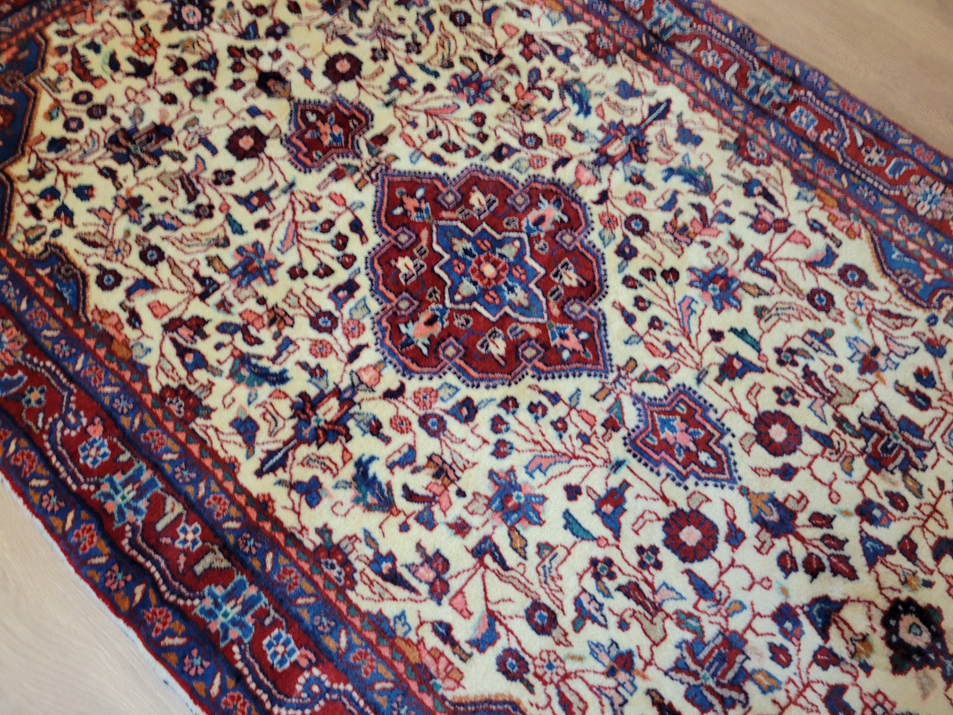 angeboten wird ein klassischer Ardebil Teppich aus feiner Korkwolle, handgeknüpft mit kunstvoller Ausarbeitung. Das zentrale Medaillon in Rot ist von einem hellen Fondfeld umgeben, das mit filigranen Blütenranken, Palmetten und geschwungenen Arabesken gefüllt ist. In den Ecken heben sich blau gestaltete Kartuschen ab, die dem Gesamtbild Tiefe verleihen. Die mehrfarbige Bordüre mit floralen Ornamenten rundet die Komposition stilvoll ab.
