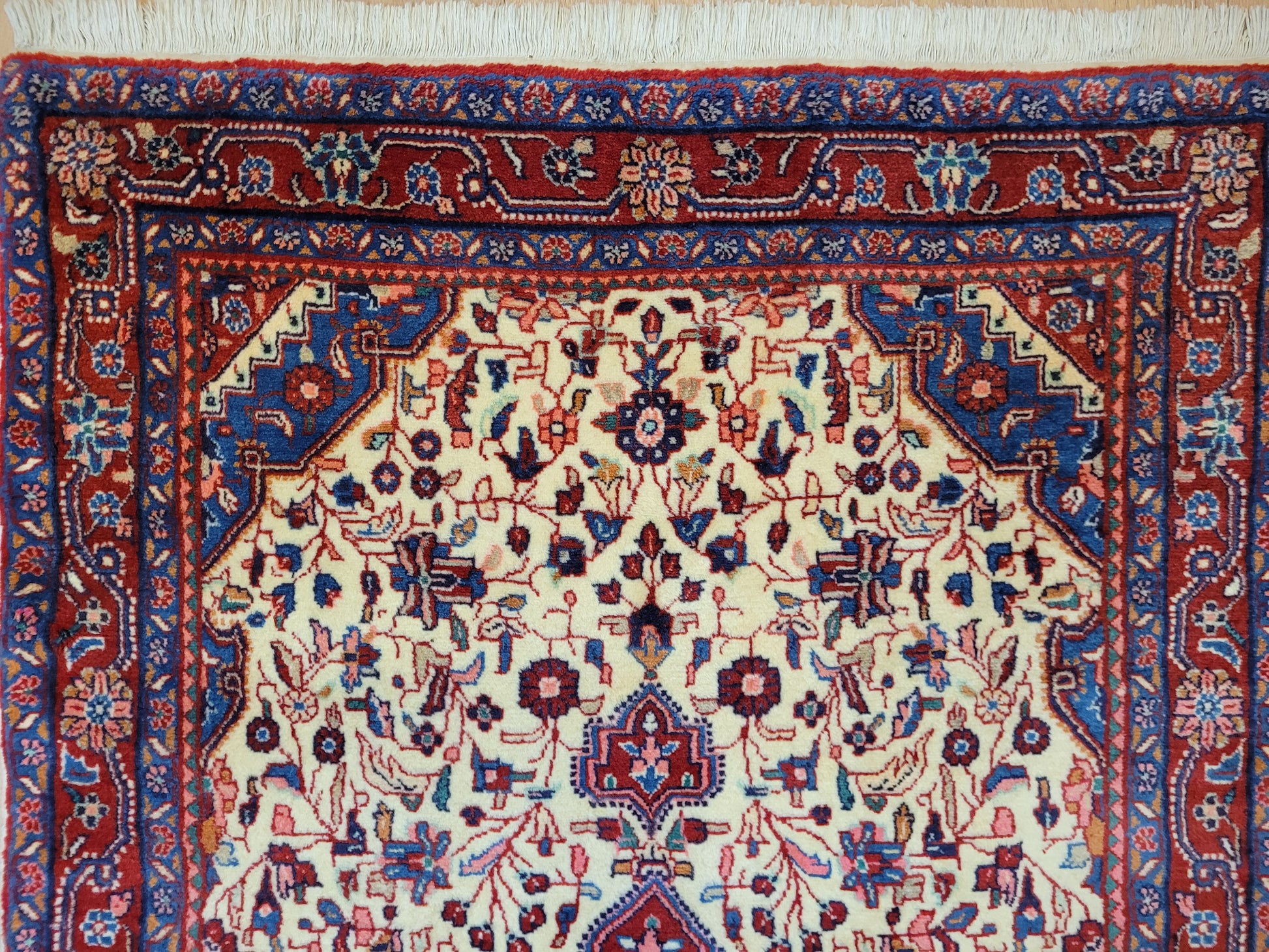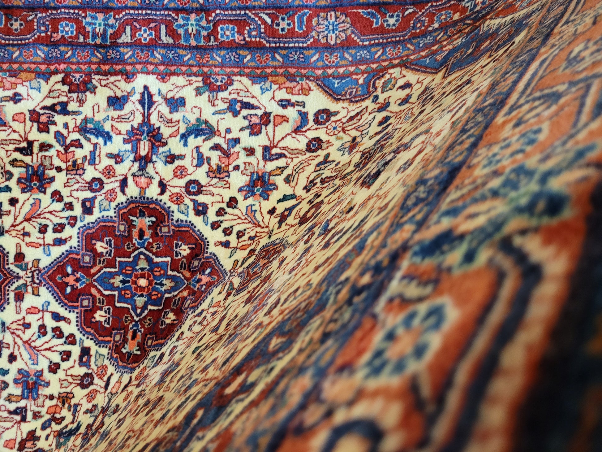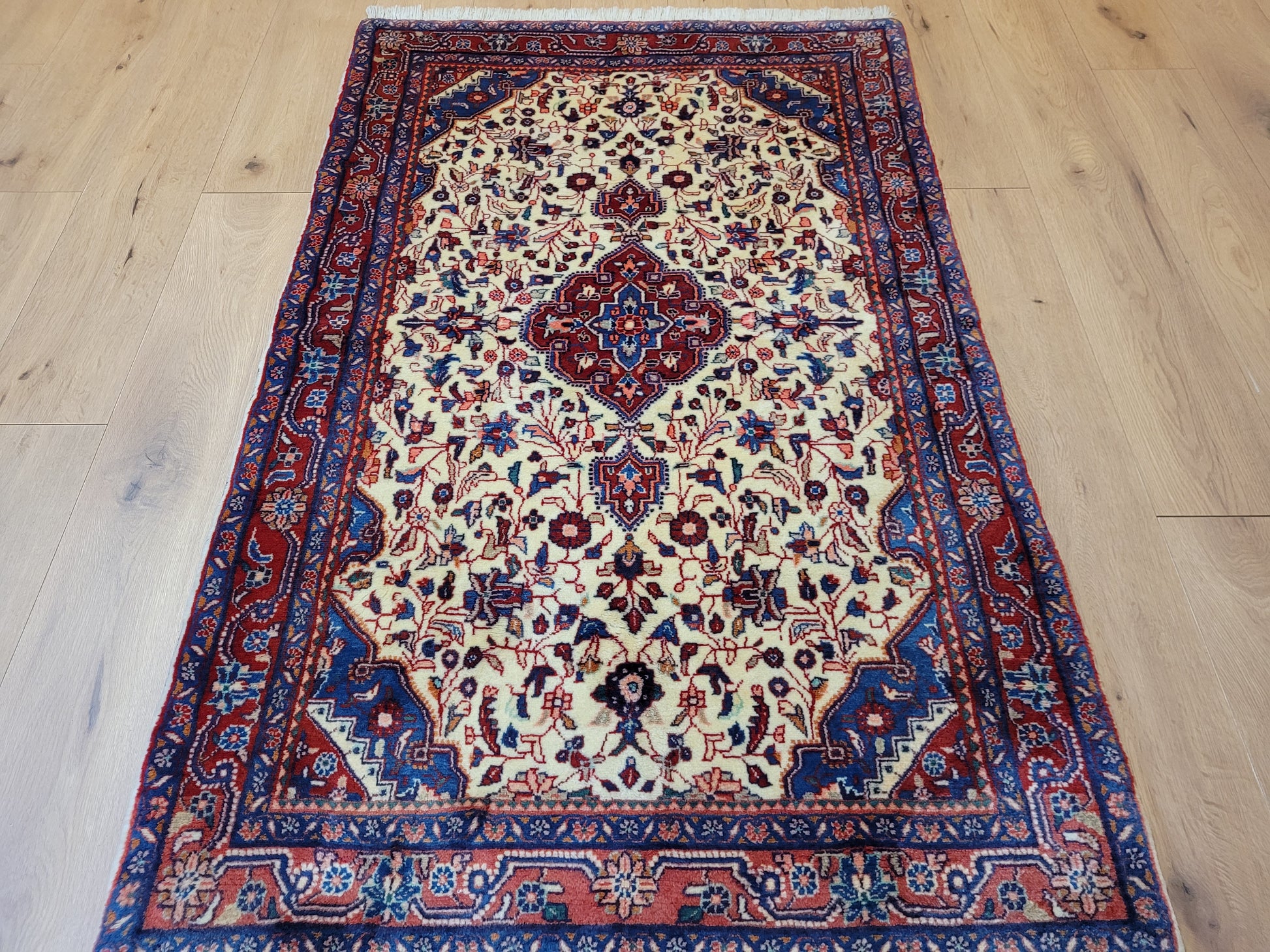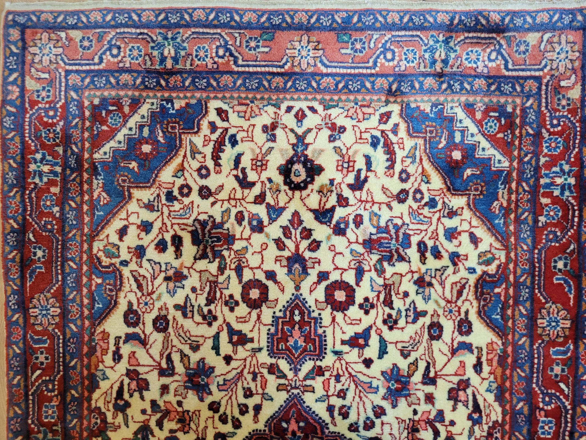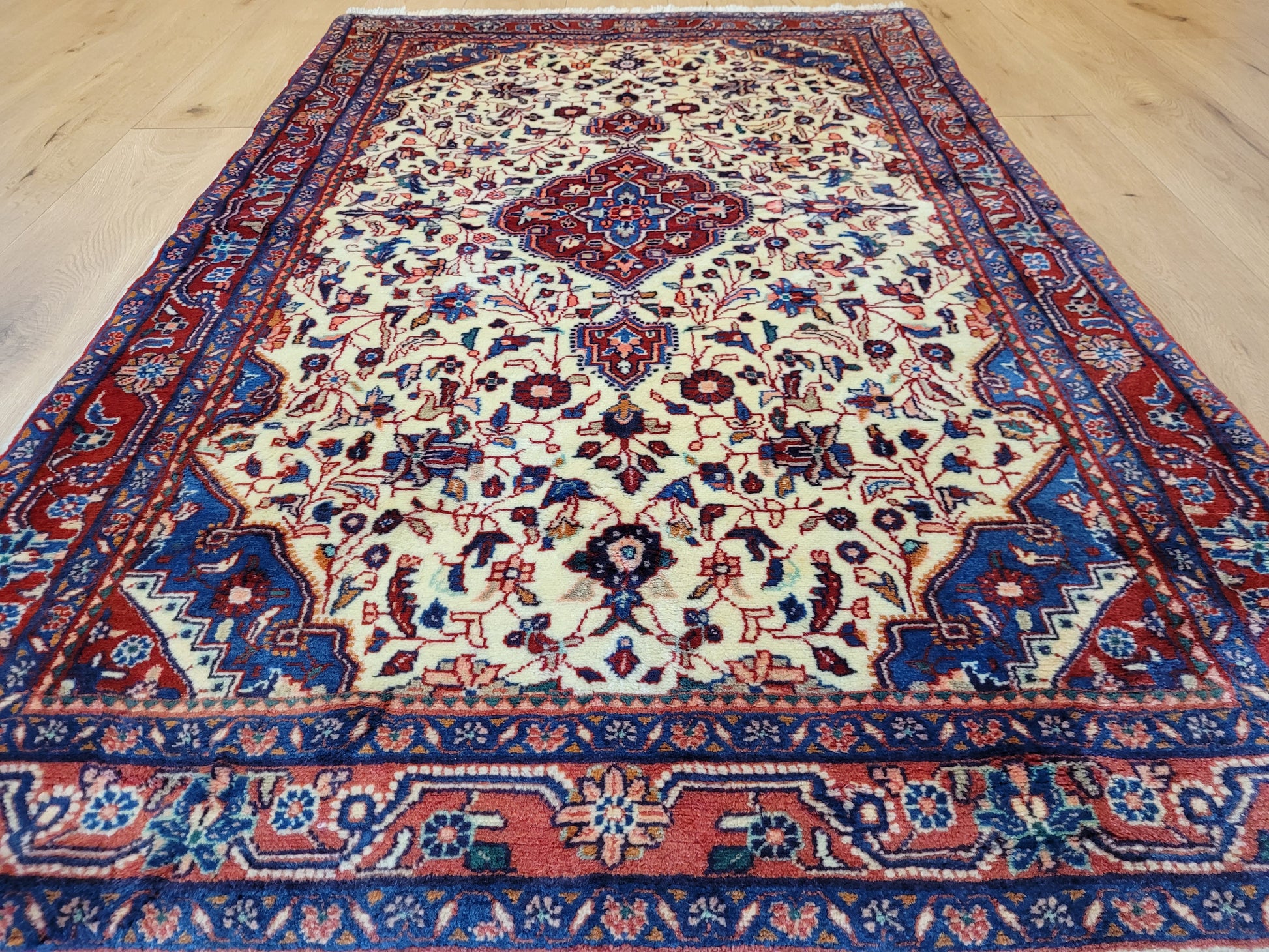 angeboten wird ein klassischer Ardebil Teppich aus feiner Korkwolle, handgeknüpft mit kunstvoller Ausarbeitung. Das zentrale Medaillon in Rot ist von einem hellen Fondfeld umgeben, das mit filigranen Blütenranken, Palmetten und geschwungenen Arabesken gefüllt ist. In den Ecken heben sich blau gestaltete Kartuschen ab, die dem Gesamtbild Tiefe verleihen. Die mehrfarbige Bordüre mit floralen Ornamenten rundet die Komposition stilvoll ab.