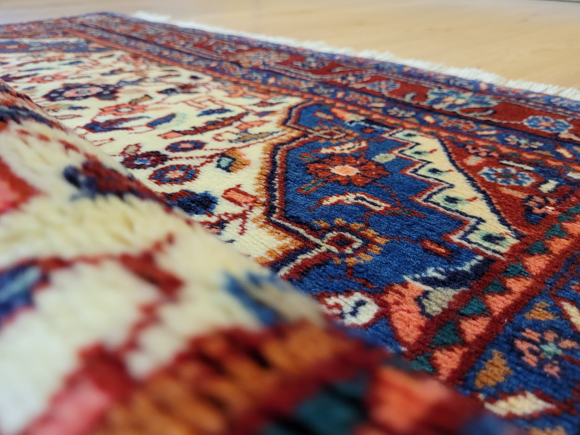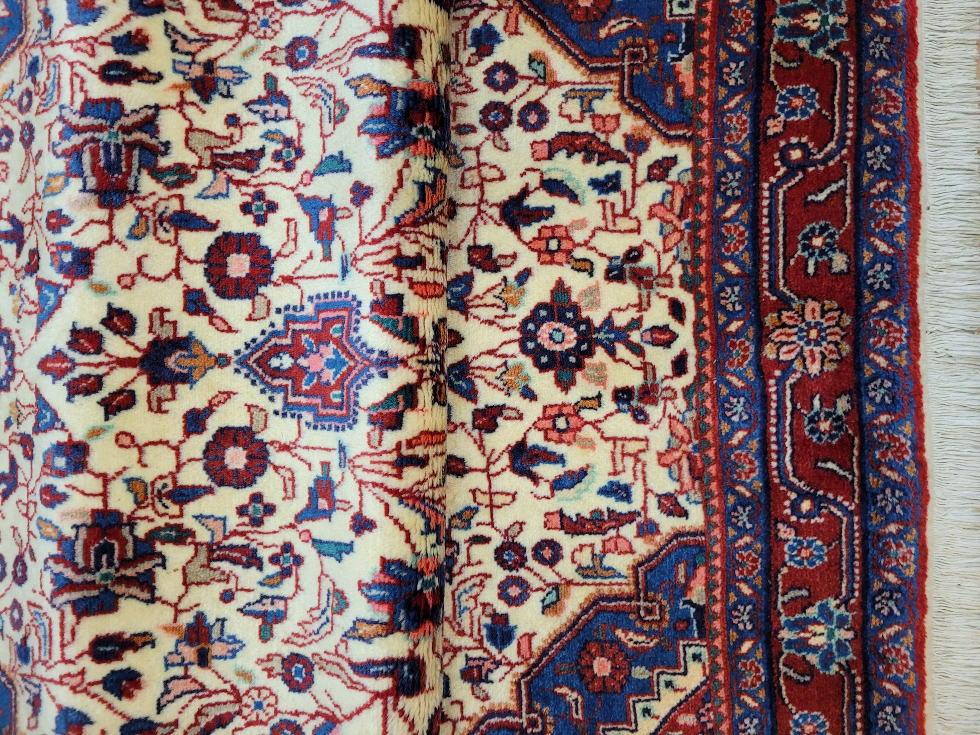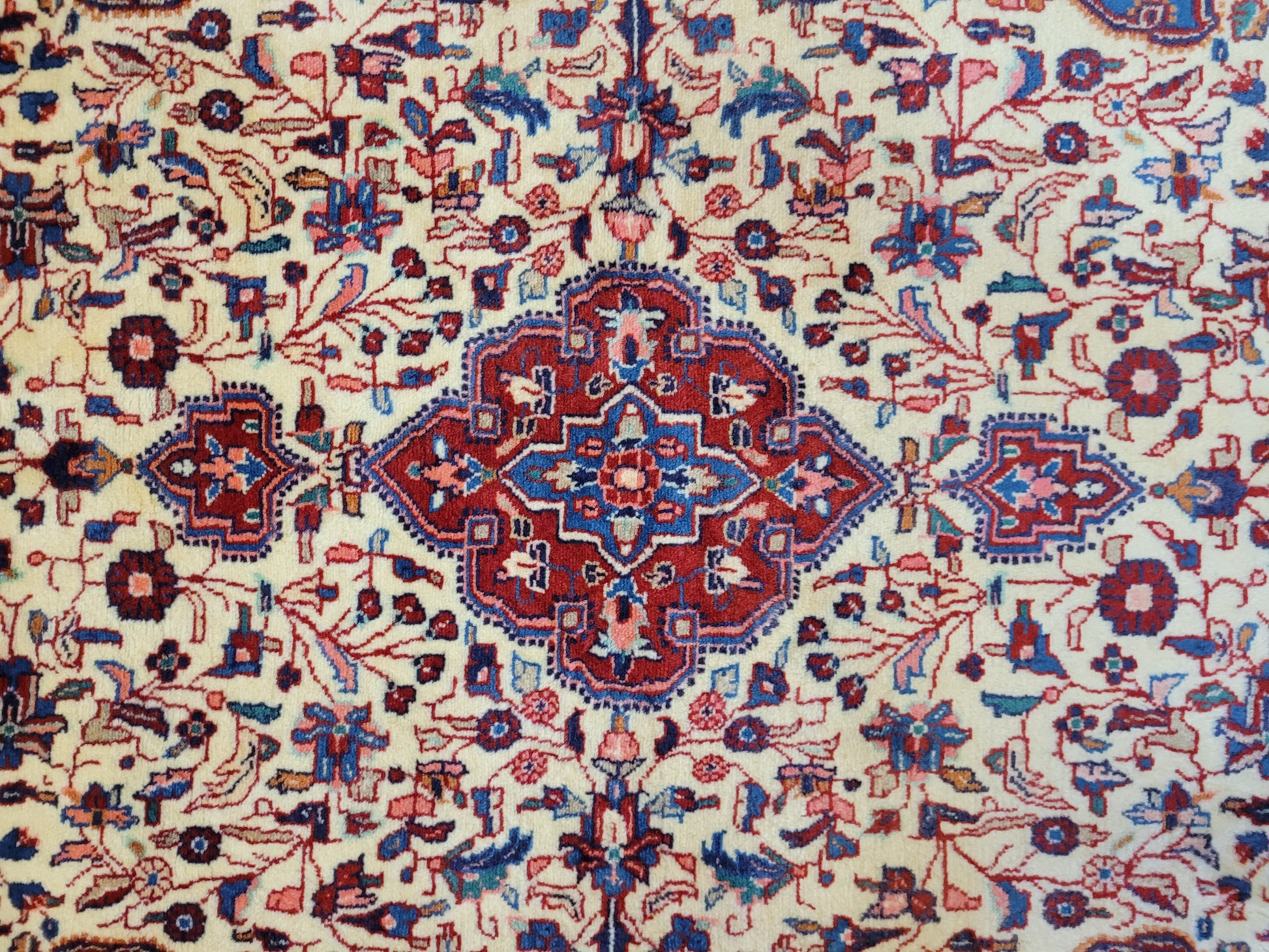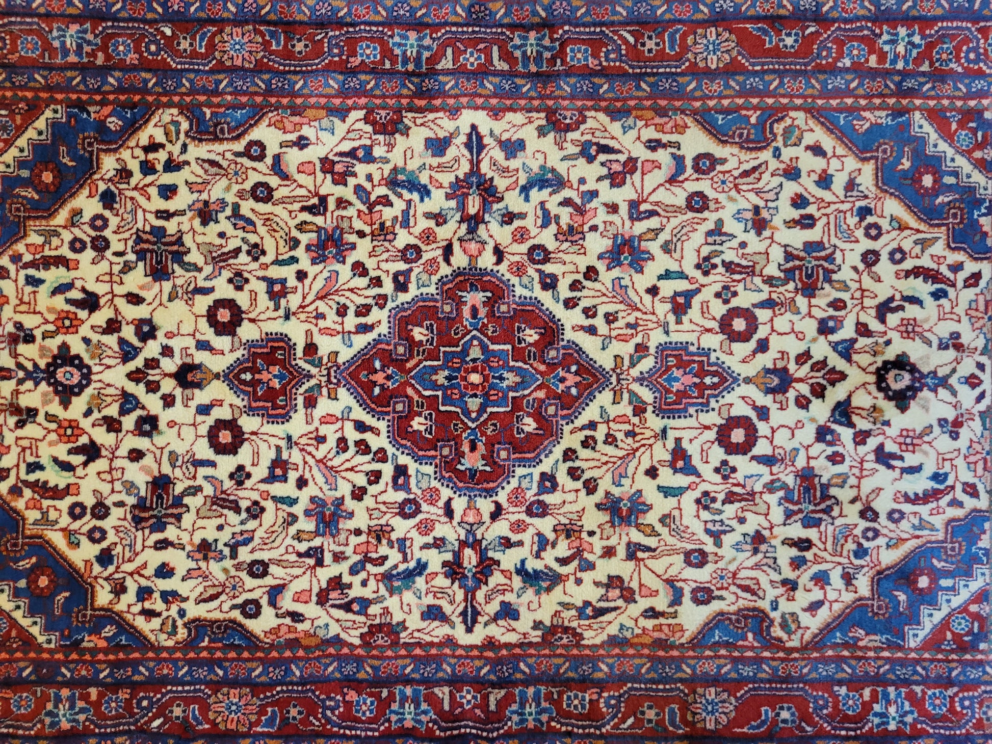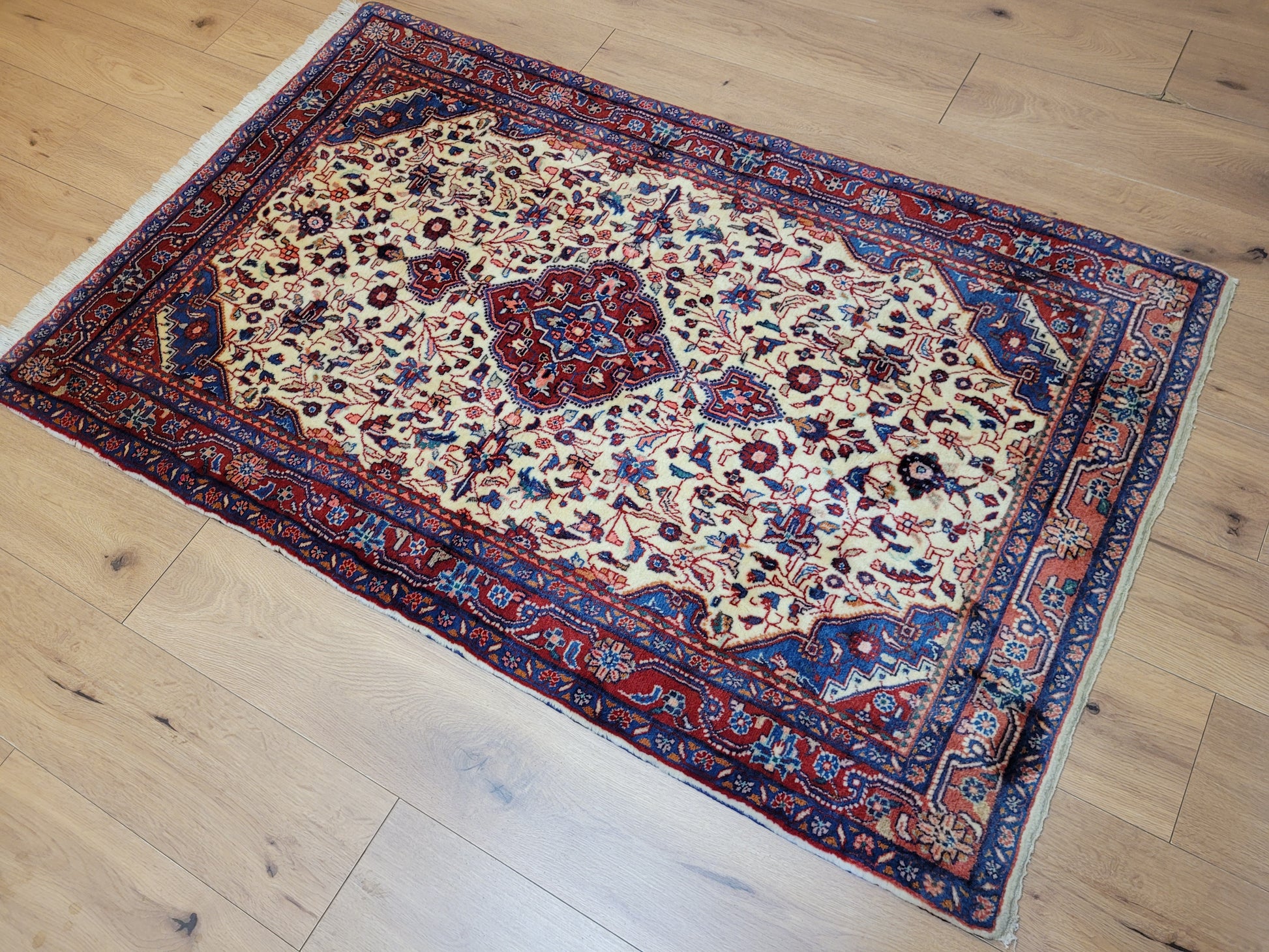 angeboten wird ein klassischer Ardebil Teppich aus feiner Korkwolle, handgeknüpft mit kunstvoller Ausarbeitung. Das zentrale Medaillon in Rot ist von einem hellen Fondfeld umgeben, das mit filigranen Blütenranken, Palmetten und geschwungenen Arabesken gefüllt ist. In den Ecken heben sich blau gestaltete Kartuschen ab, die dem Gesamtbild Tiefe verleihen. Die mehrfarbige Bordüre mit floralen Ornamenten rundet die Komposition stilvoll ab.