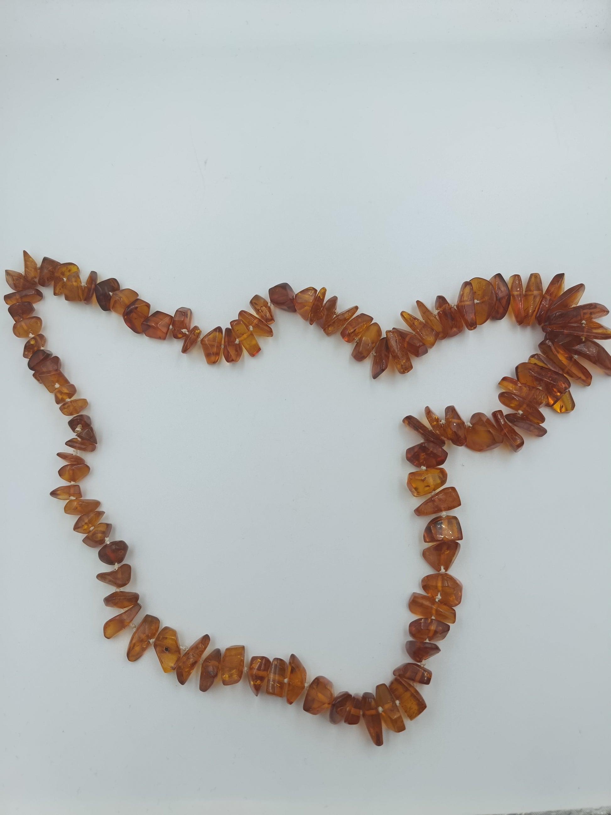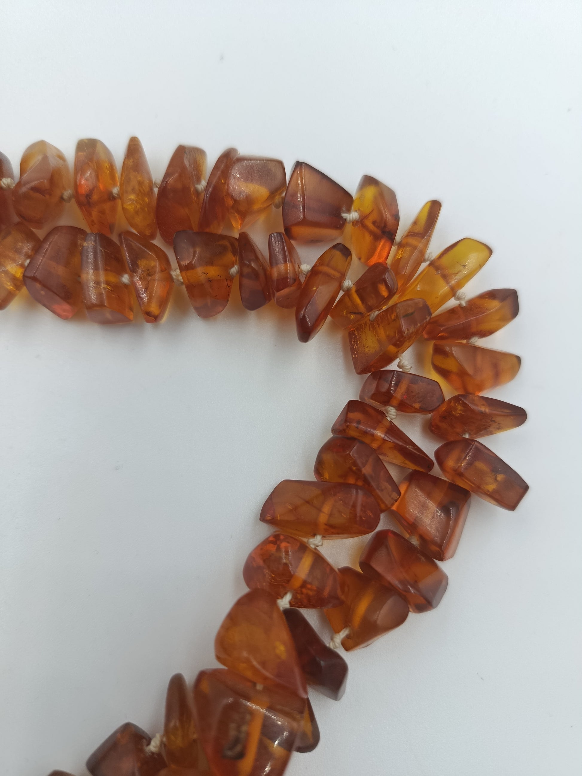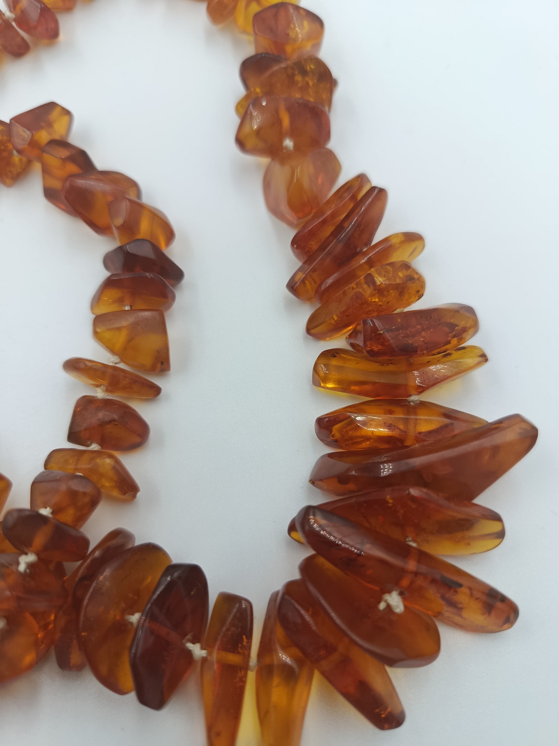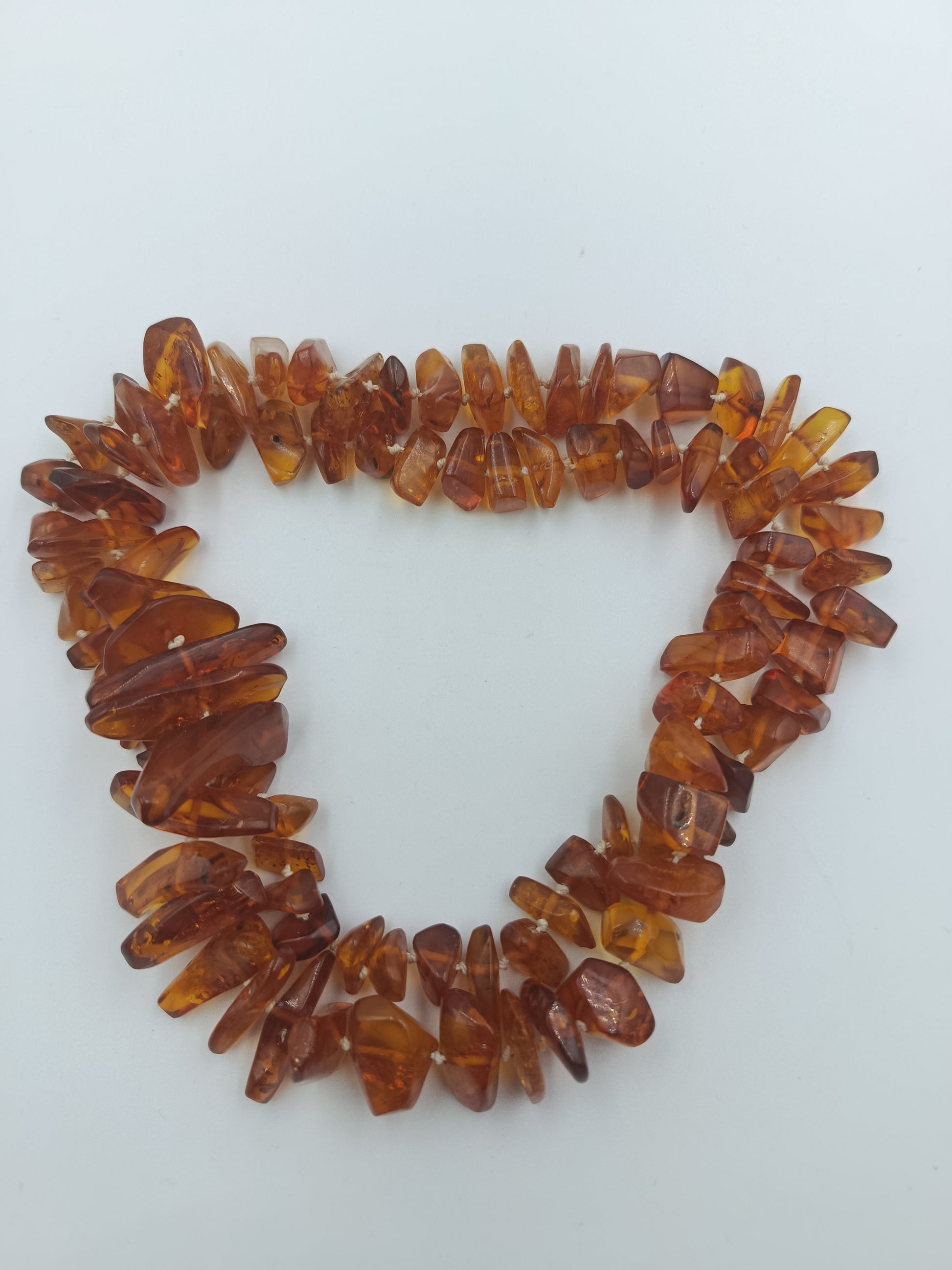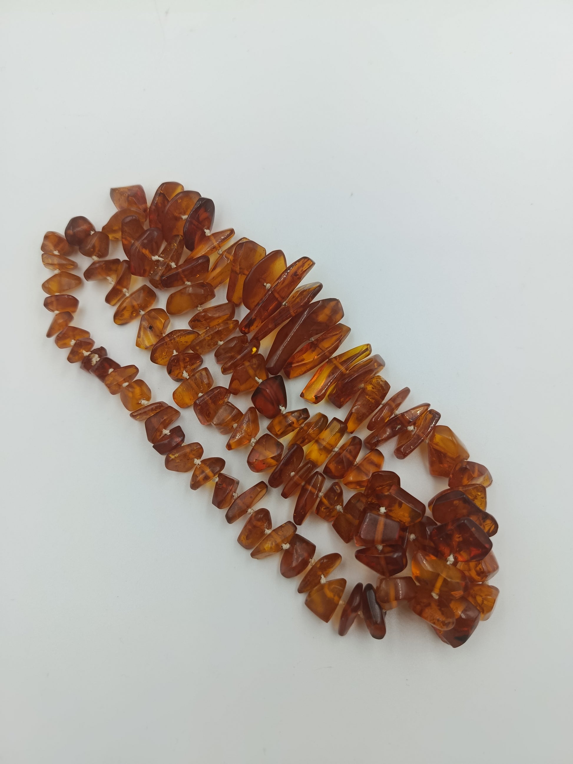 Warme, honigfarbene Bernstein-Splitterkette mit einem natürlichen, lebendigen Look. Die Kette besteht aus unterschiedlich großen, polierten Bernsteinsplittern, die das Licht wunderschön reflektieren. Sie ist doppelt so lang gearbeitet und kann daher auch als kurze Doppelkette getragen werden.