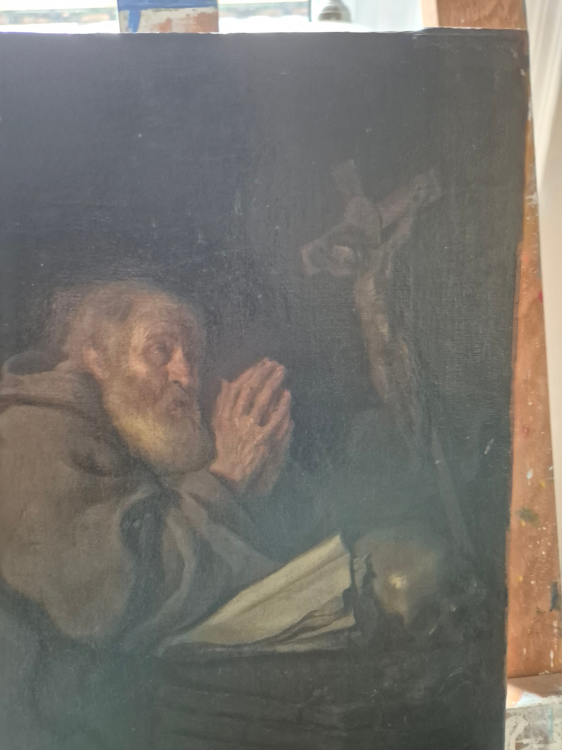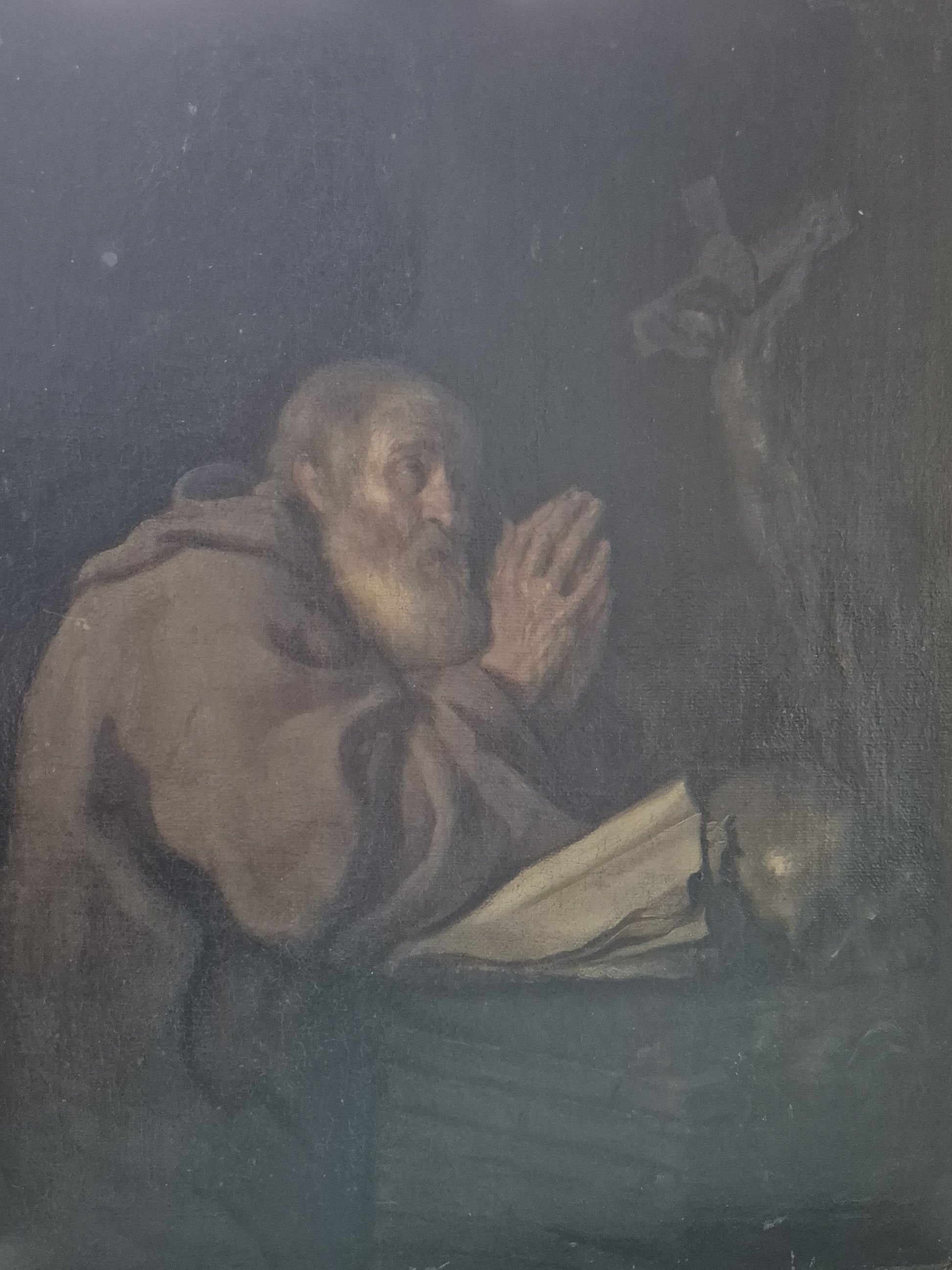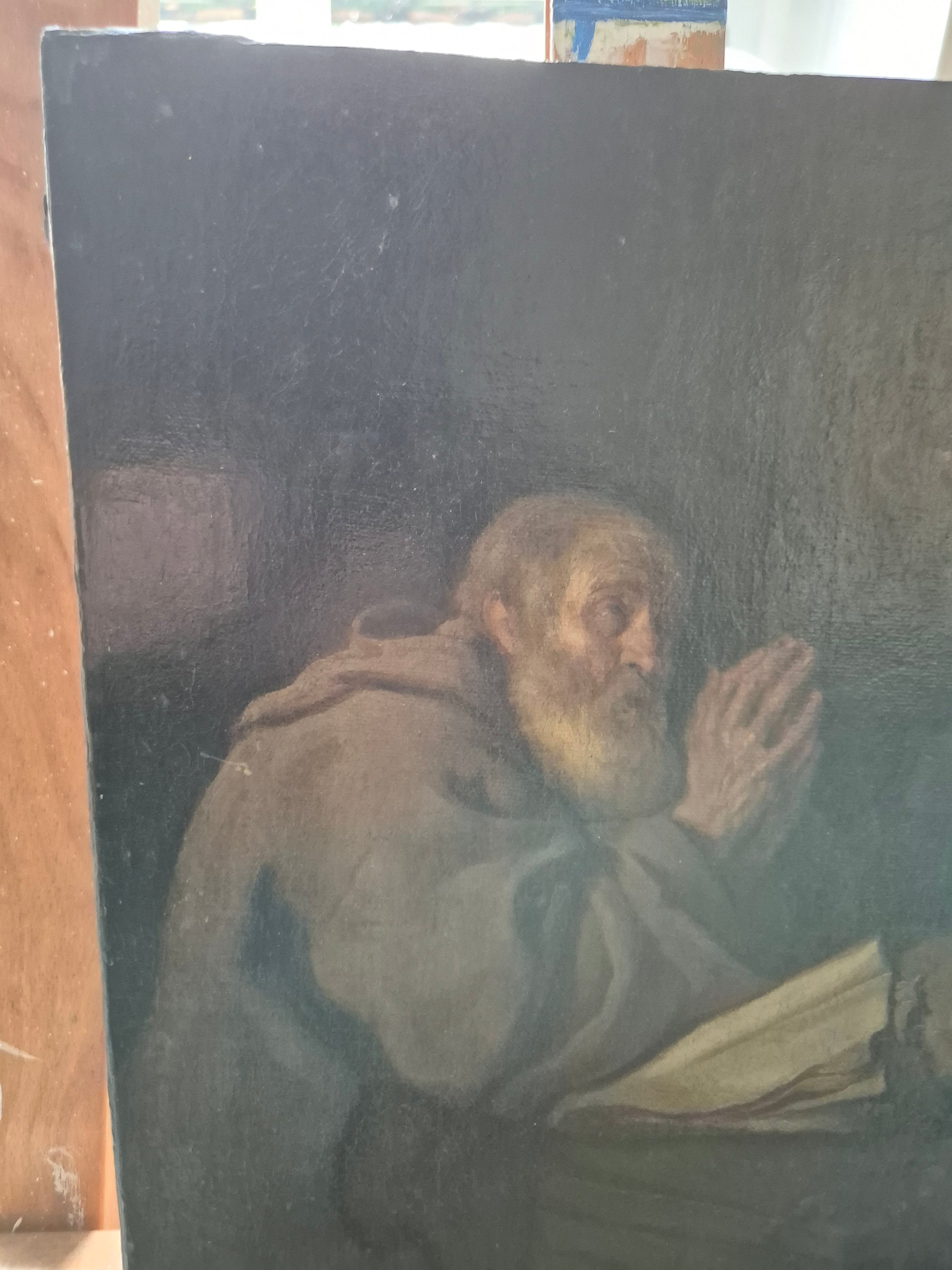 angeboten wird ein antikes Ölgemälde auf Leinwand mit einer ausdrucksstarken Darstellung eines betenden Mönchs vor einem Kruzifix. Die meisterhafte Lichtführung und die feinen Details verleihen dem Werk eine besondere Tiefe.
