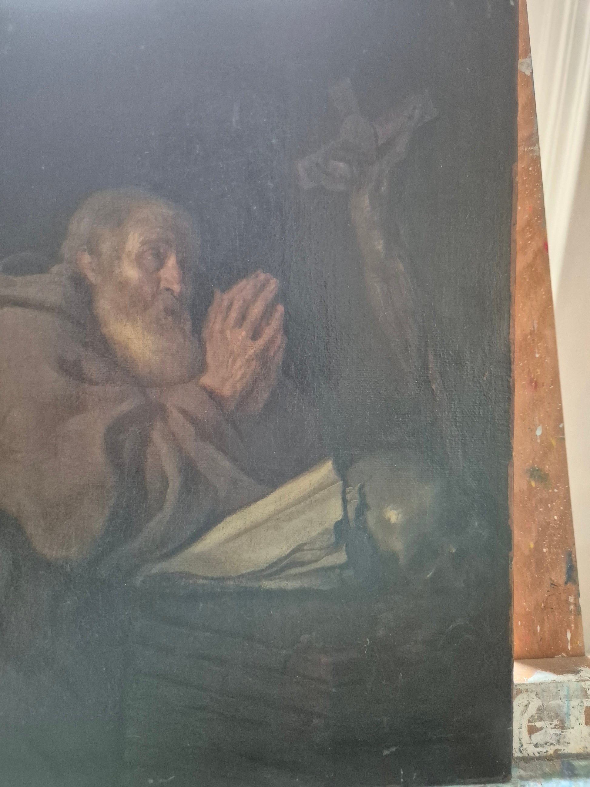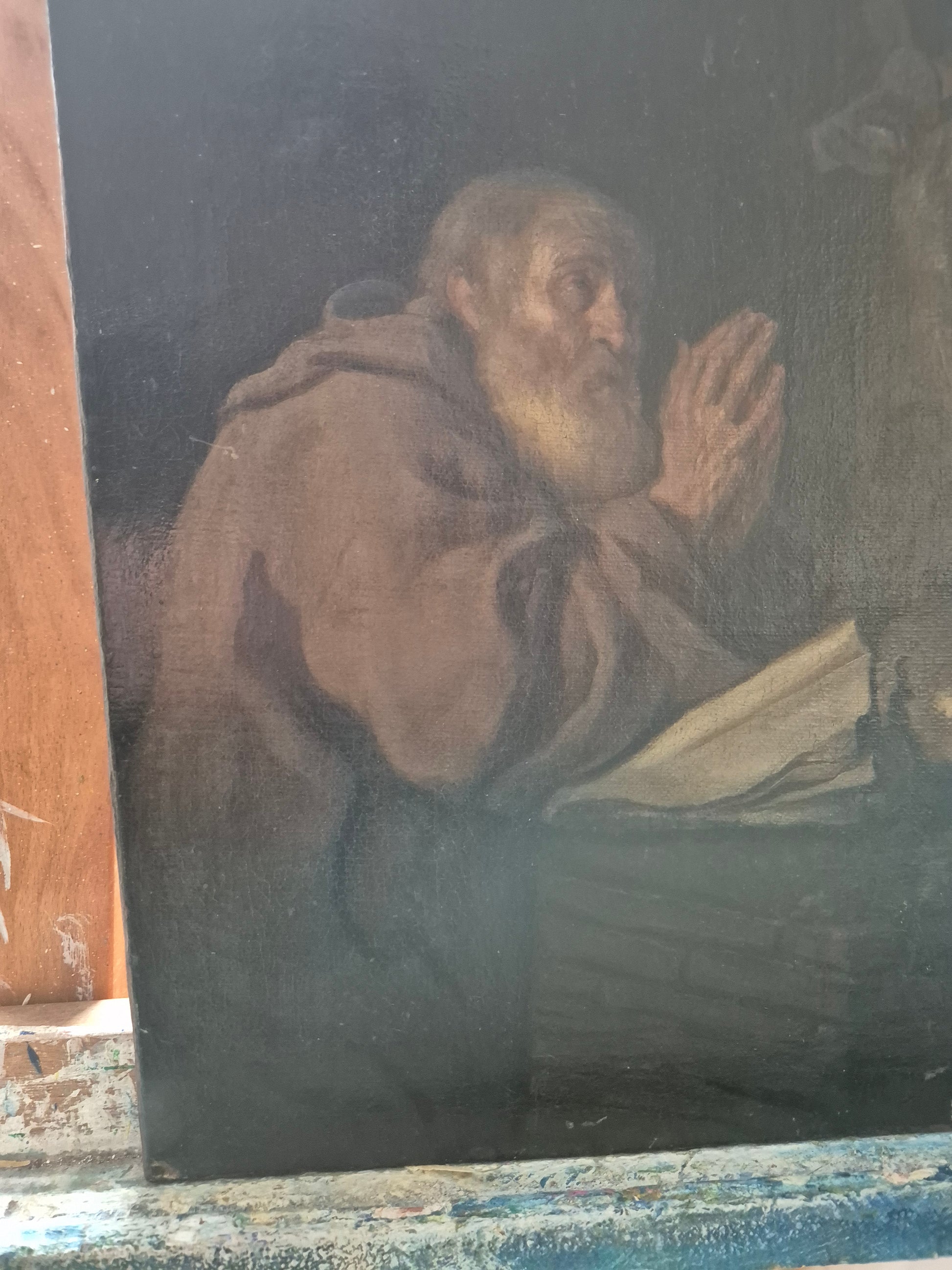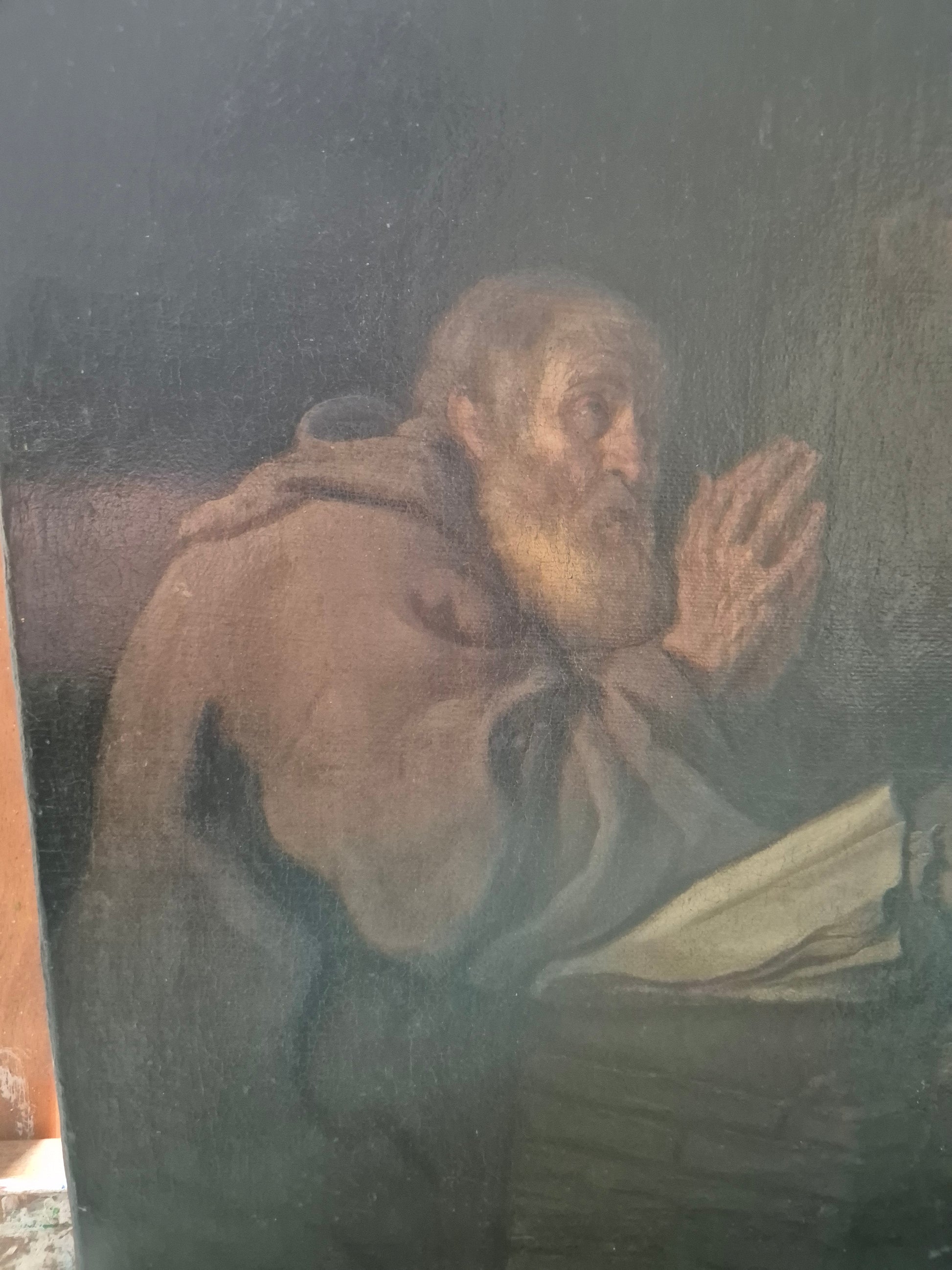 angeboten wird ein antikes Ölgemälde auf Leinwand mit einer ausdrucksstarken Darstellung eines betenden Mönchs vor einem Kruzifix. Die meisterhafte Lichtführung und die feinen Details verleihen dem Werk eine besondere Tiefe.