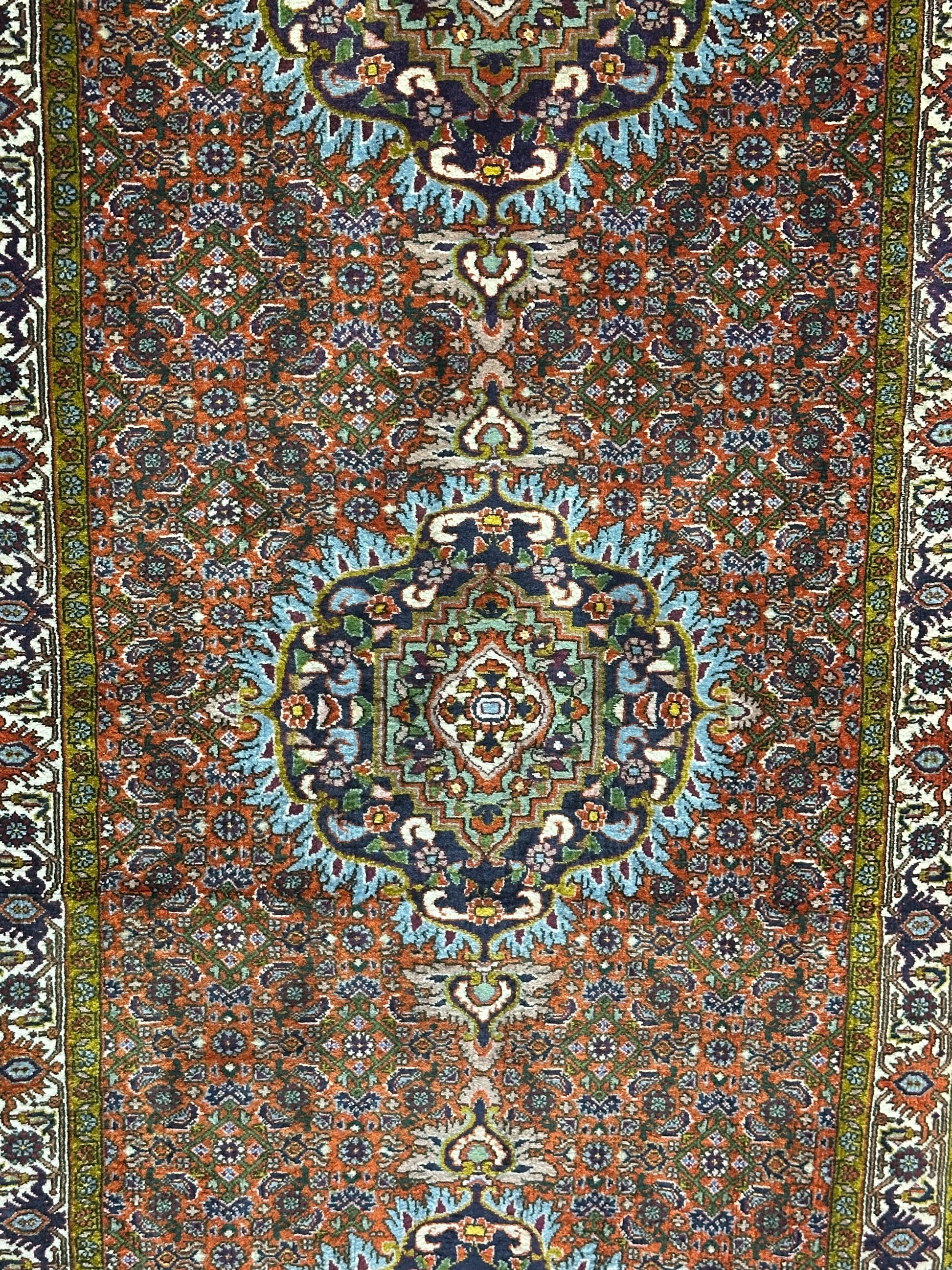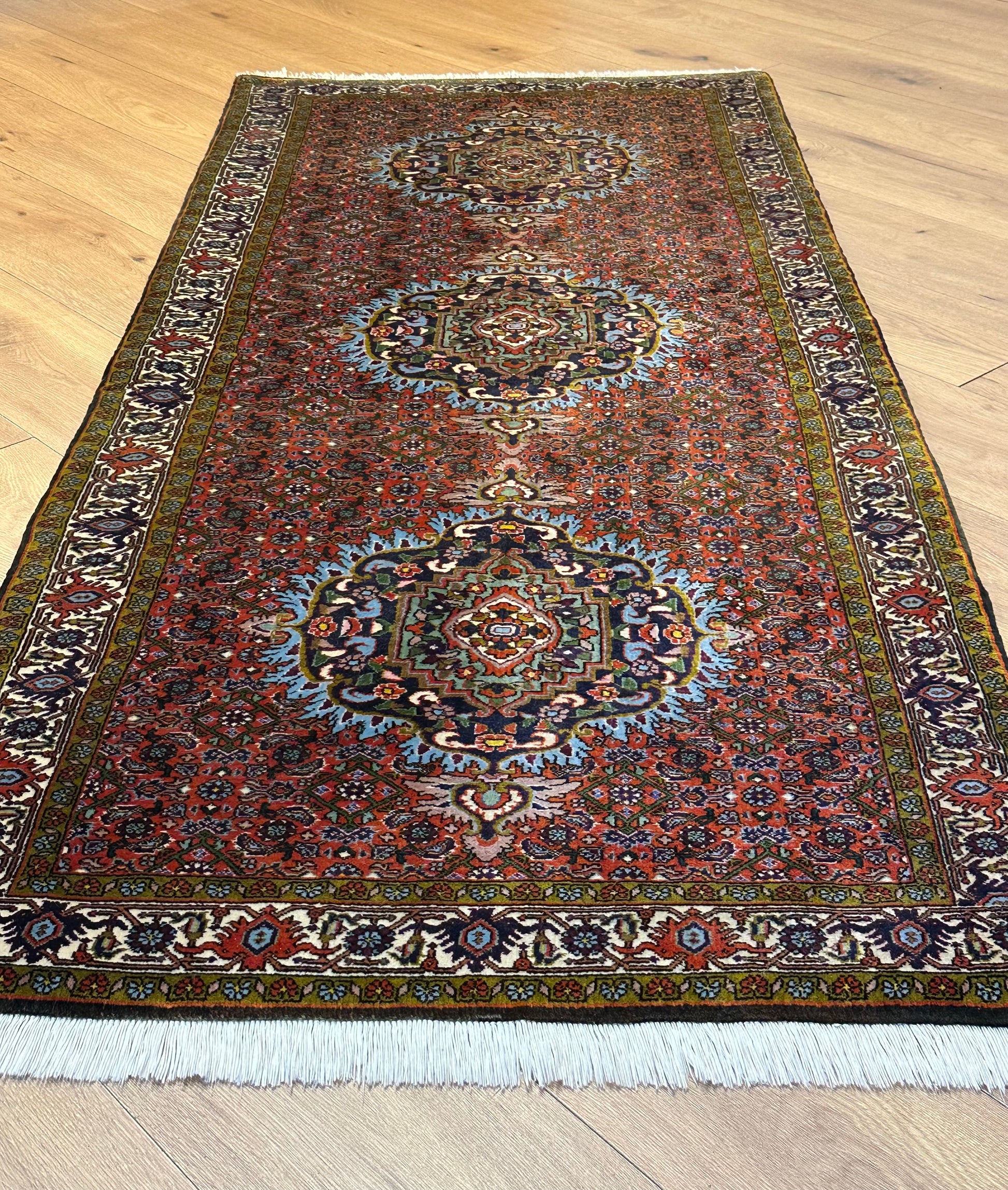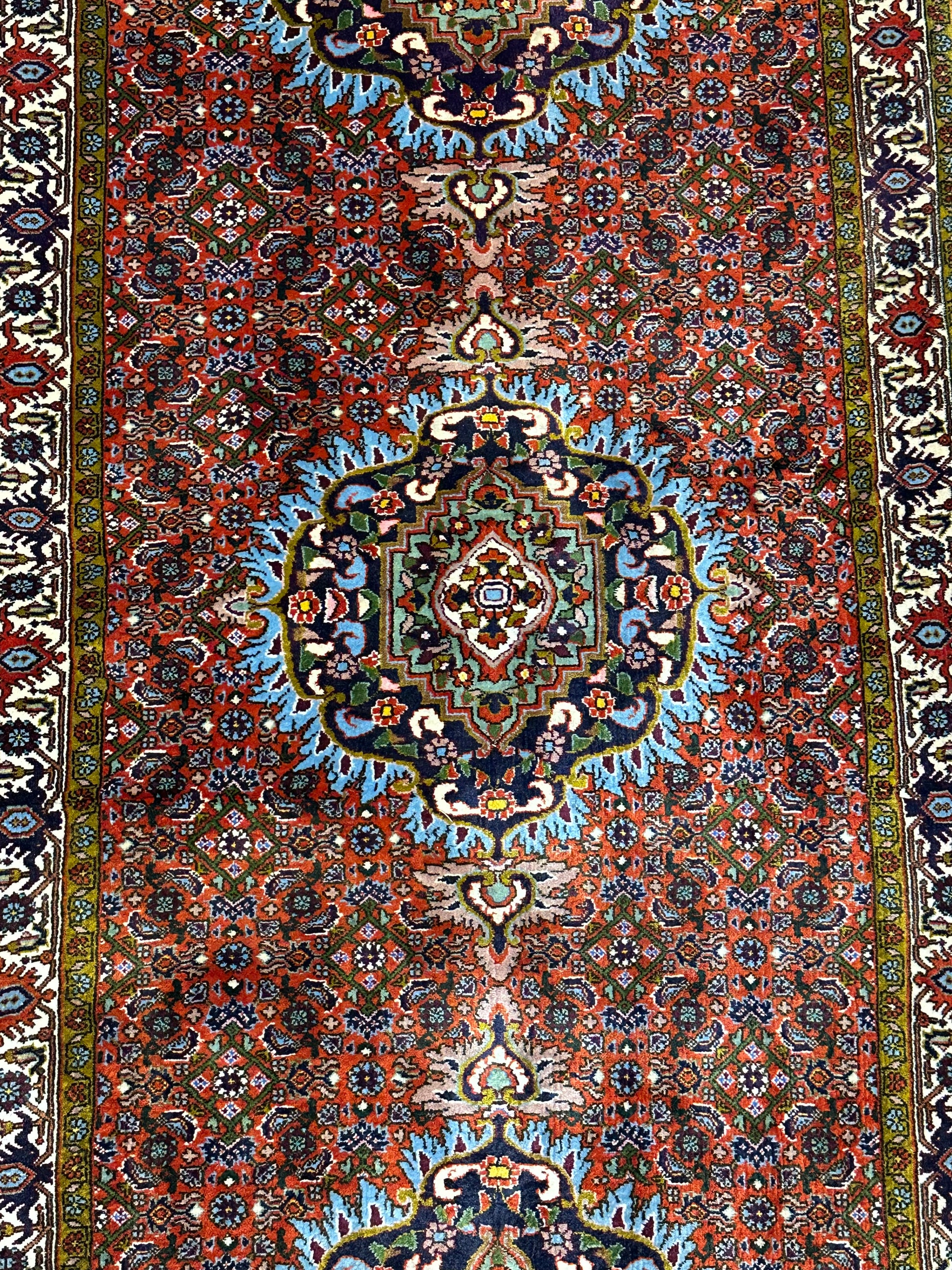 angeboten wird ein exquisiter Bidjar Teppich aus feiner Korkwolle, handgeknüpft in dichter und strapazierfähiger Qualität. Das Design besticht durch drei markante Zentralmedaillons auf einem reich verzierten, rötlichen Fond mit filigranem Herati-Muster. Die kontrastierende Bordüre in Elfenbein und Olivgrün mit kunstvollen Blüten- und Rankenmotiven verleiht dem Teppich eine ausgewogene Eleganz.