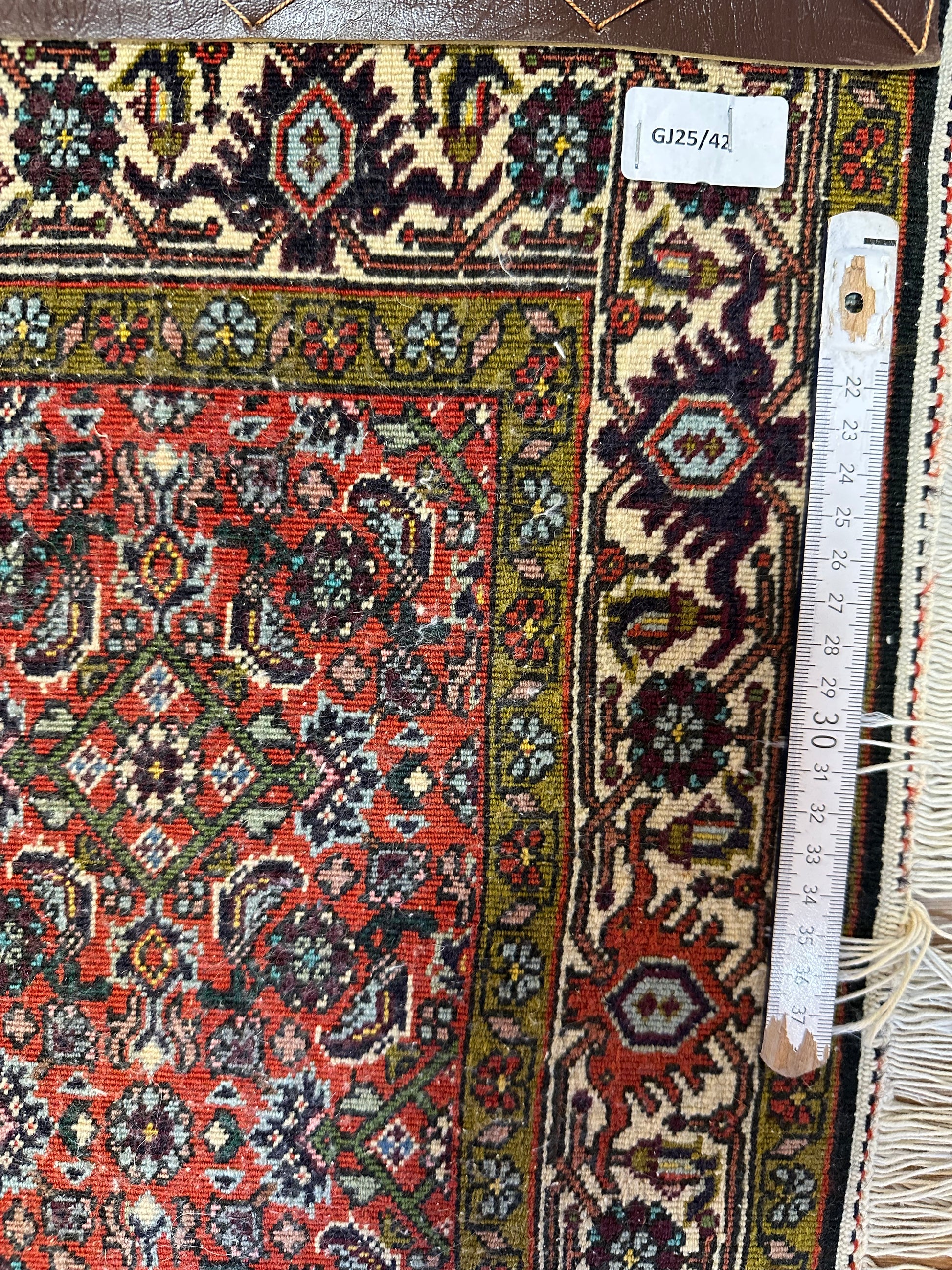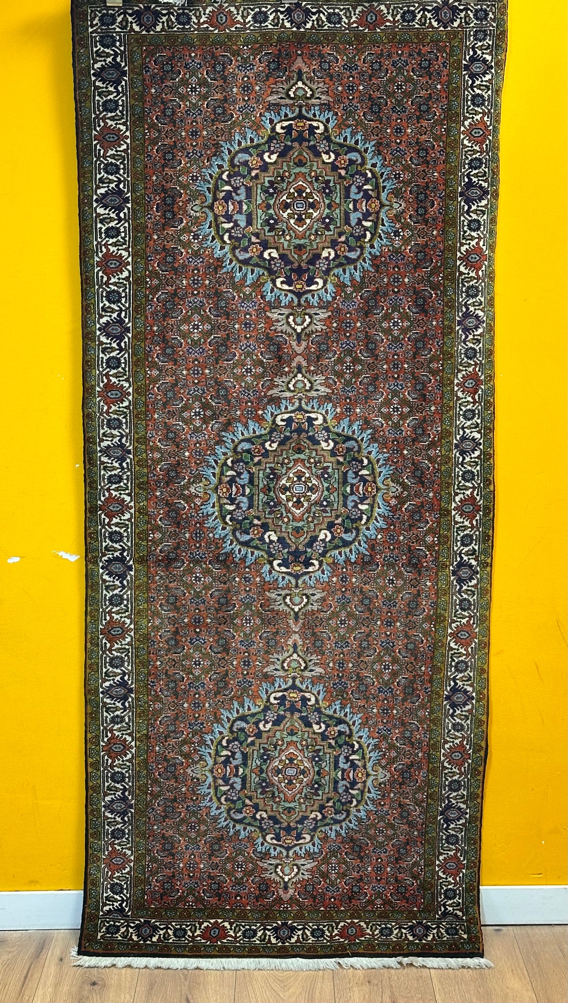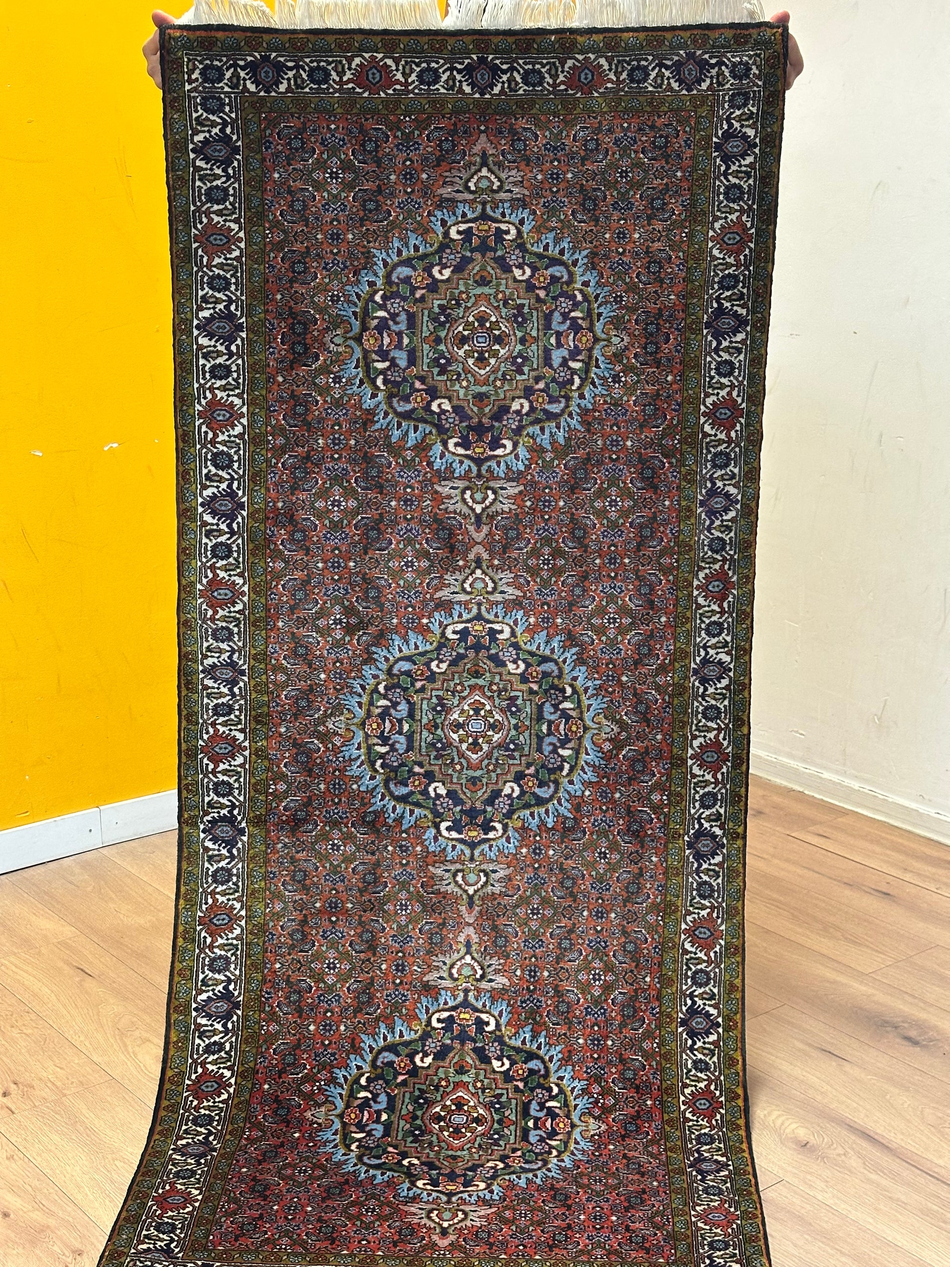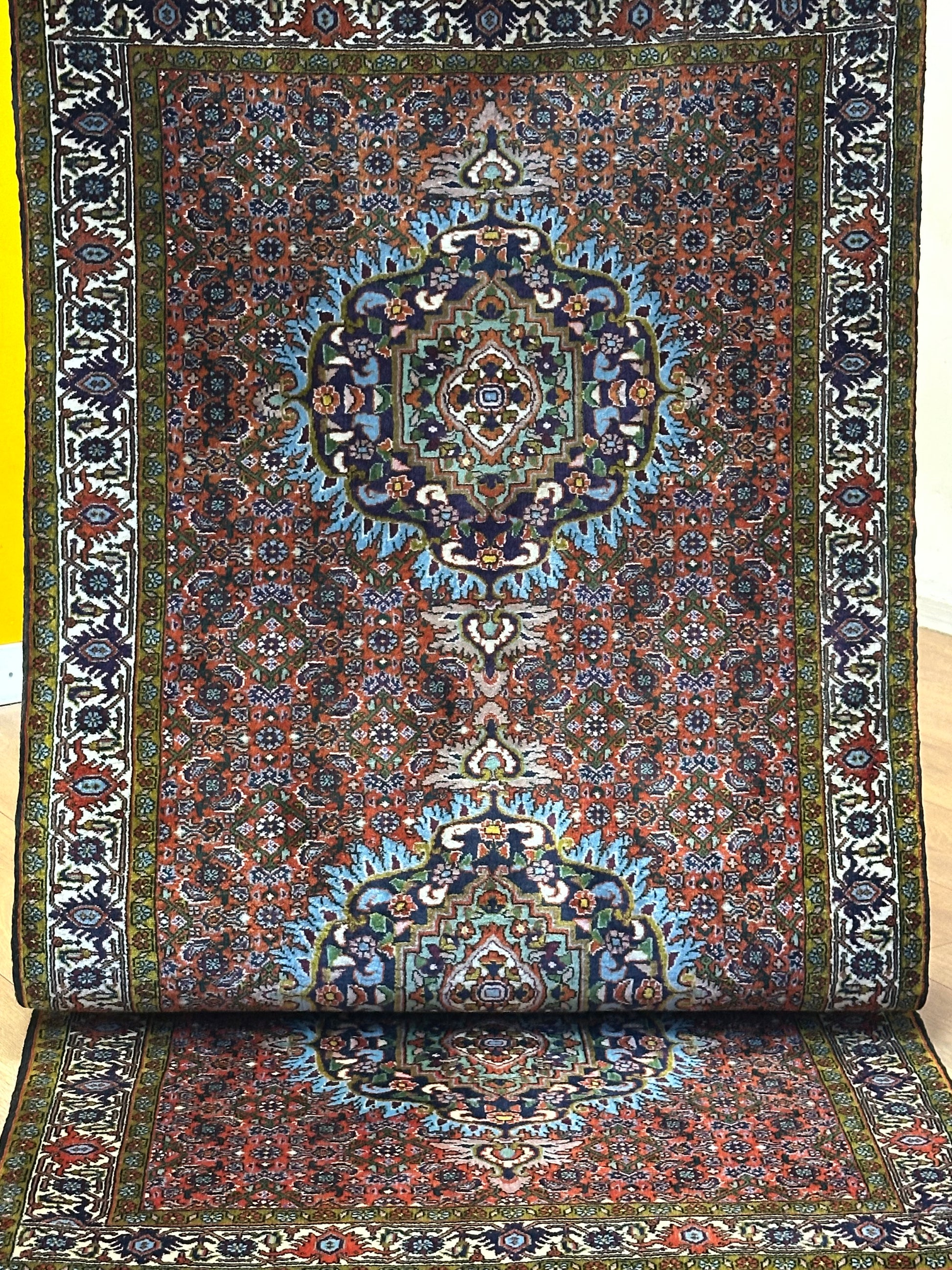 angeboten wird ein exquisiter Bidjar Teppich aus feiner Korkwolle, handgeknüpft in dichter und strapazierfähiger Qualität. Das Design besticht durch drei markante Zentralmedaillons auf einem reich verzierten, rötlichen Fond mit filigranem Herati-Muster. Die kontrastierende Bordüre in Elfenbein und Olivgrün mit kunstvollen Blüten- und Rankenmotiven verleiht dem Teppich eine ausgewogene Eleganz.
