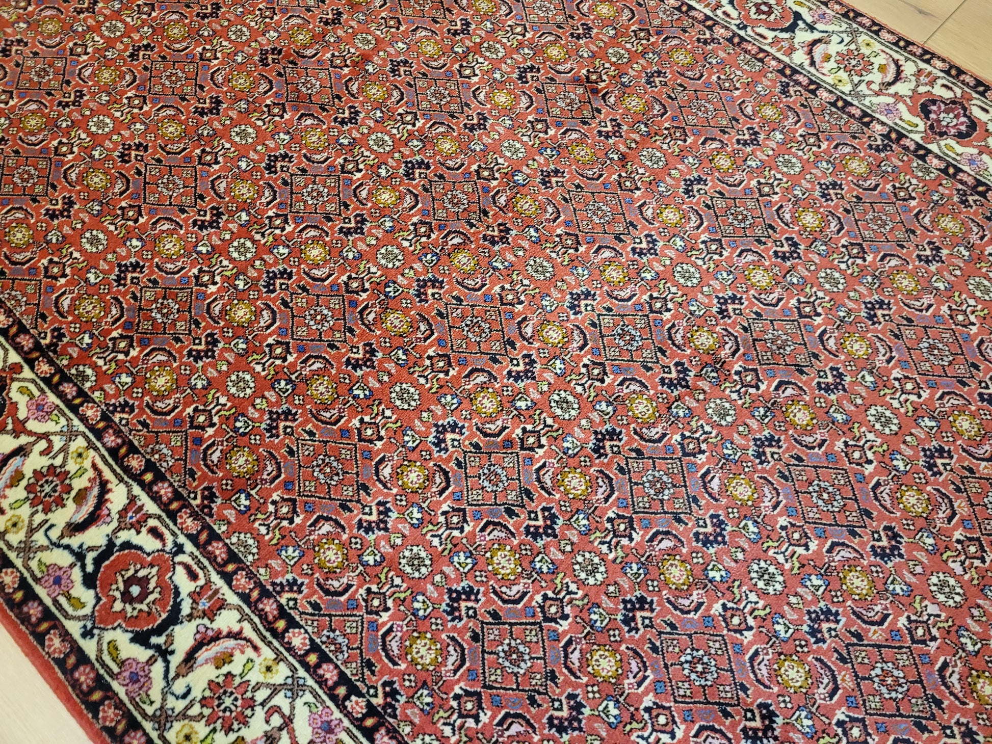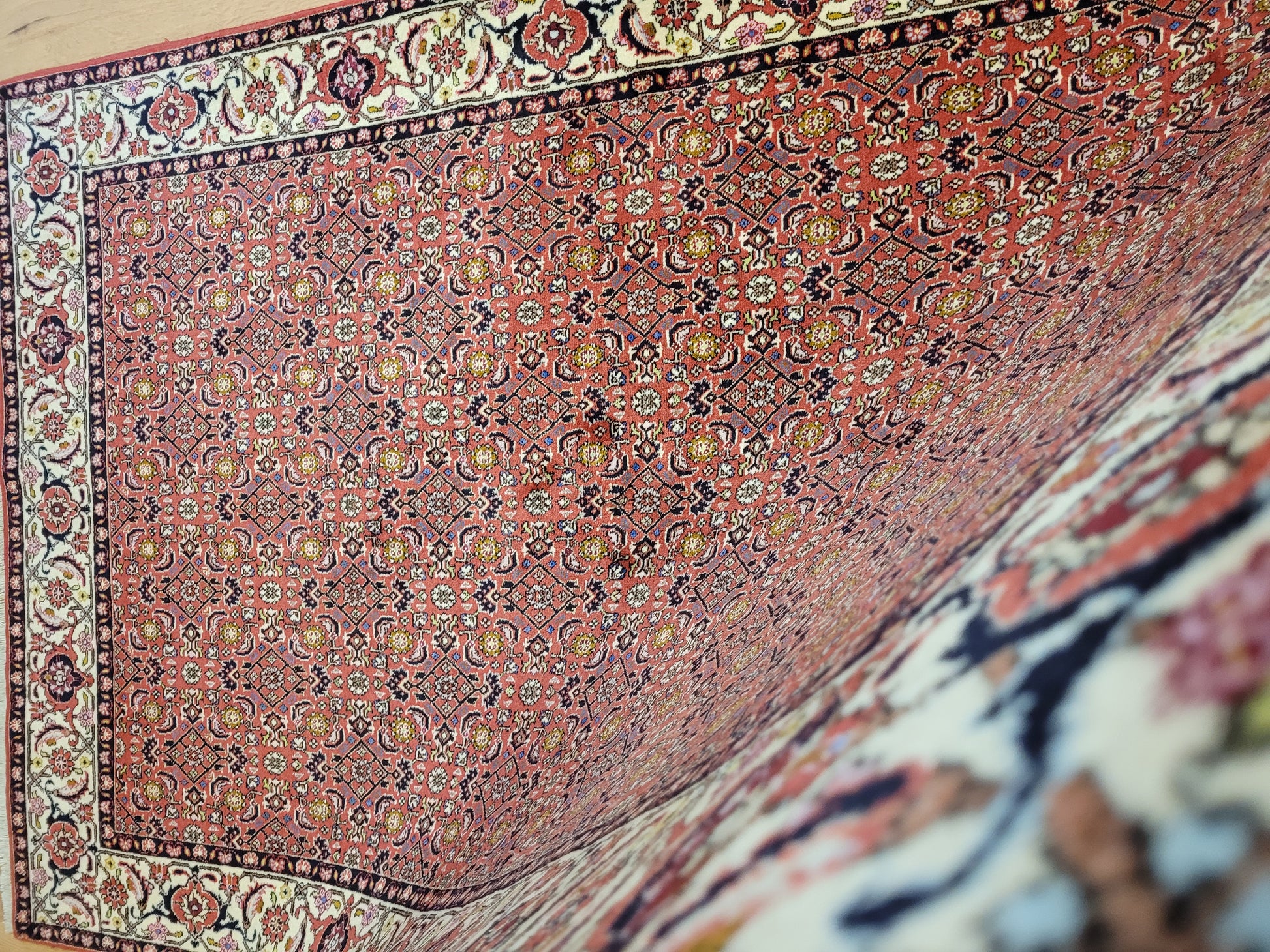 angeboten wird ein charaktervoller Bidjar Teppich aus feinster Korkwolle, bekannt für seine außerordentliche Dichte und Strapazierfähigkeit. Das Muster besticht durch ein dichtes, geometrisch angeordnetes Allover-Design, das aus kleinen Rauten, Rosetten und Blütenmotiven besteht. Die kräftigen Farben und die präzise Knüpfkunst verleihen diesem Teppich eine beeindruckende Ausdrucksstärke und machen ihn zu einem langlebigen Begleiter für viele Generationen.
