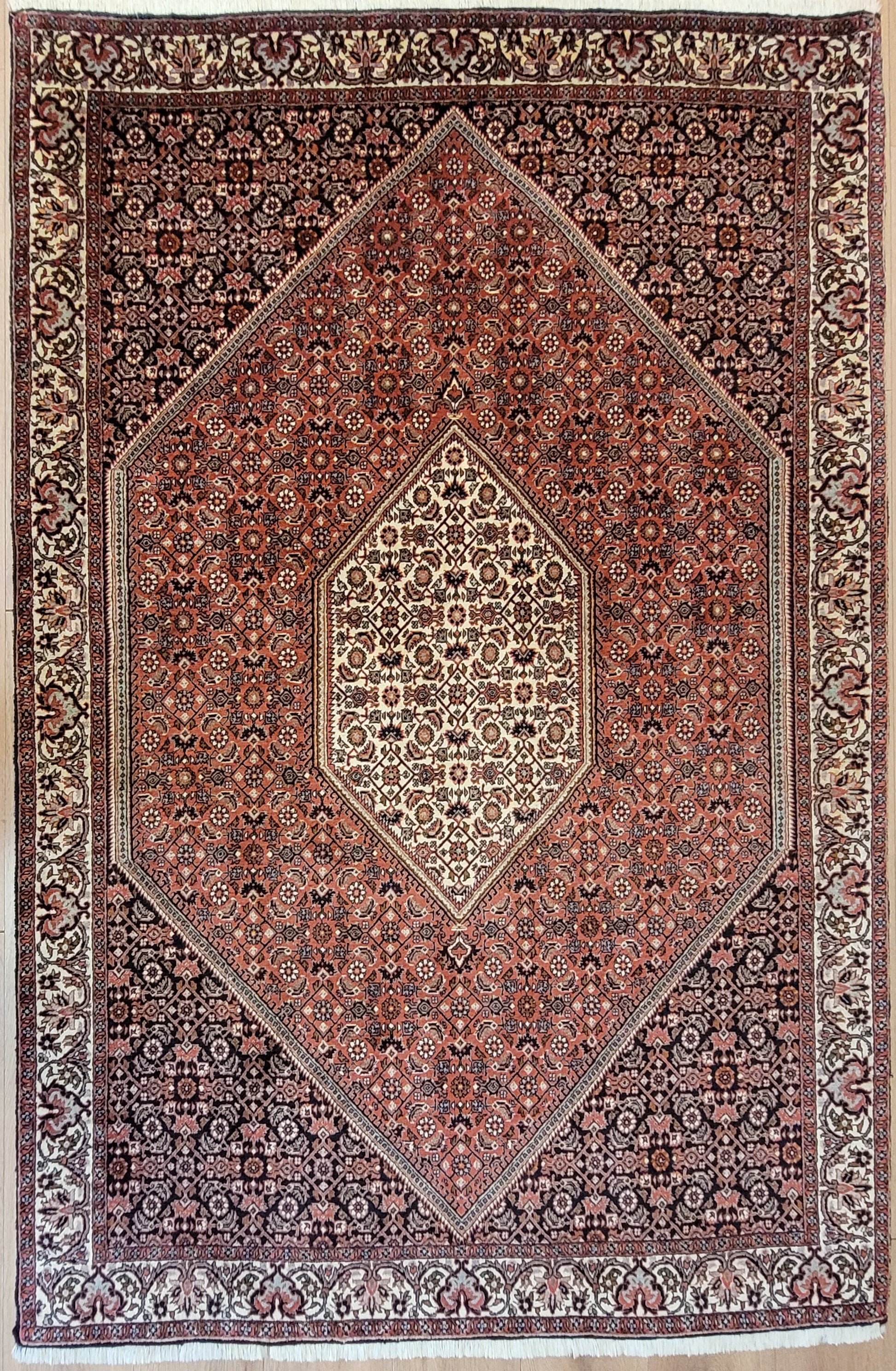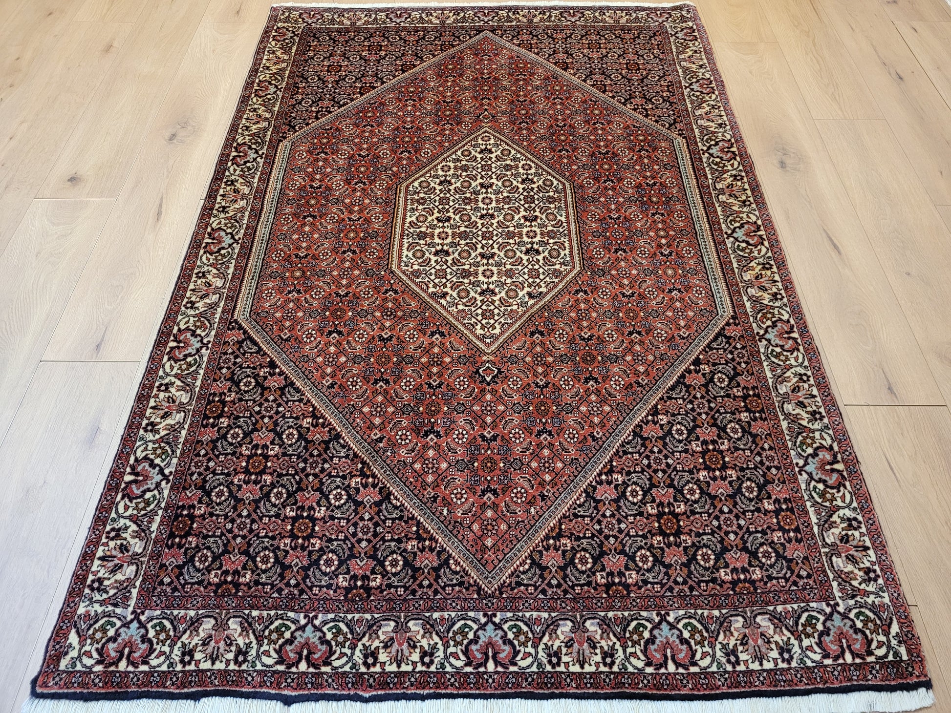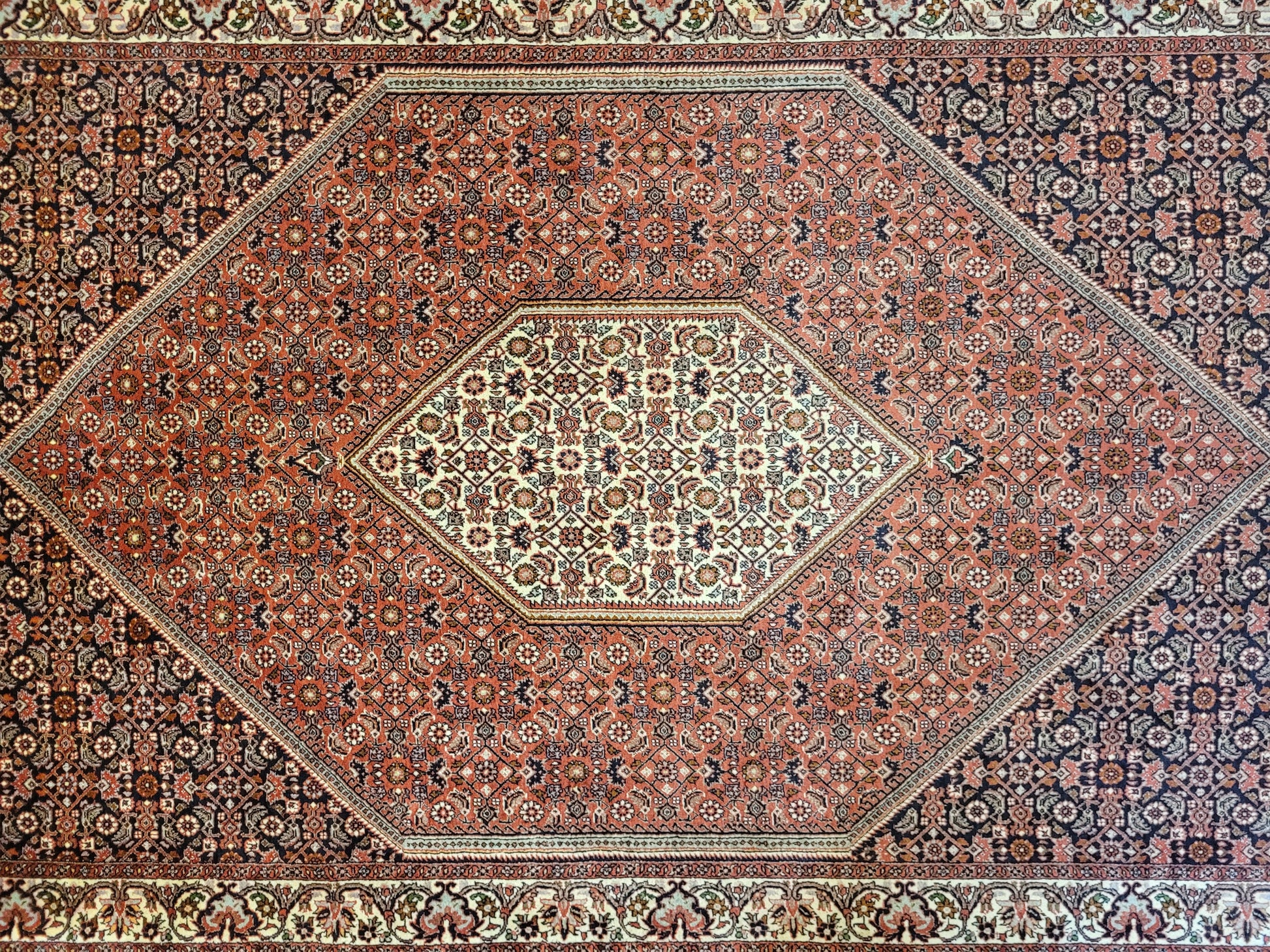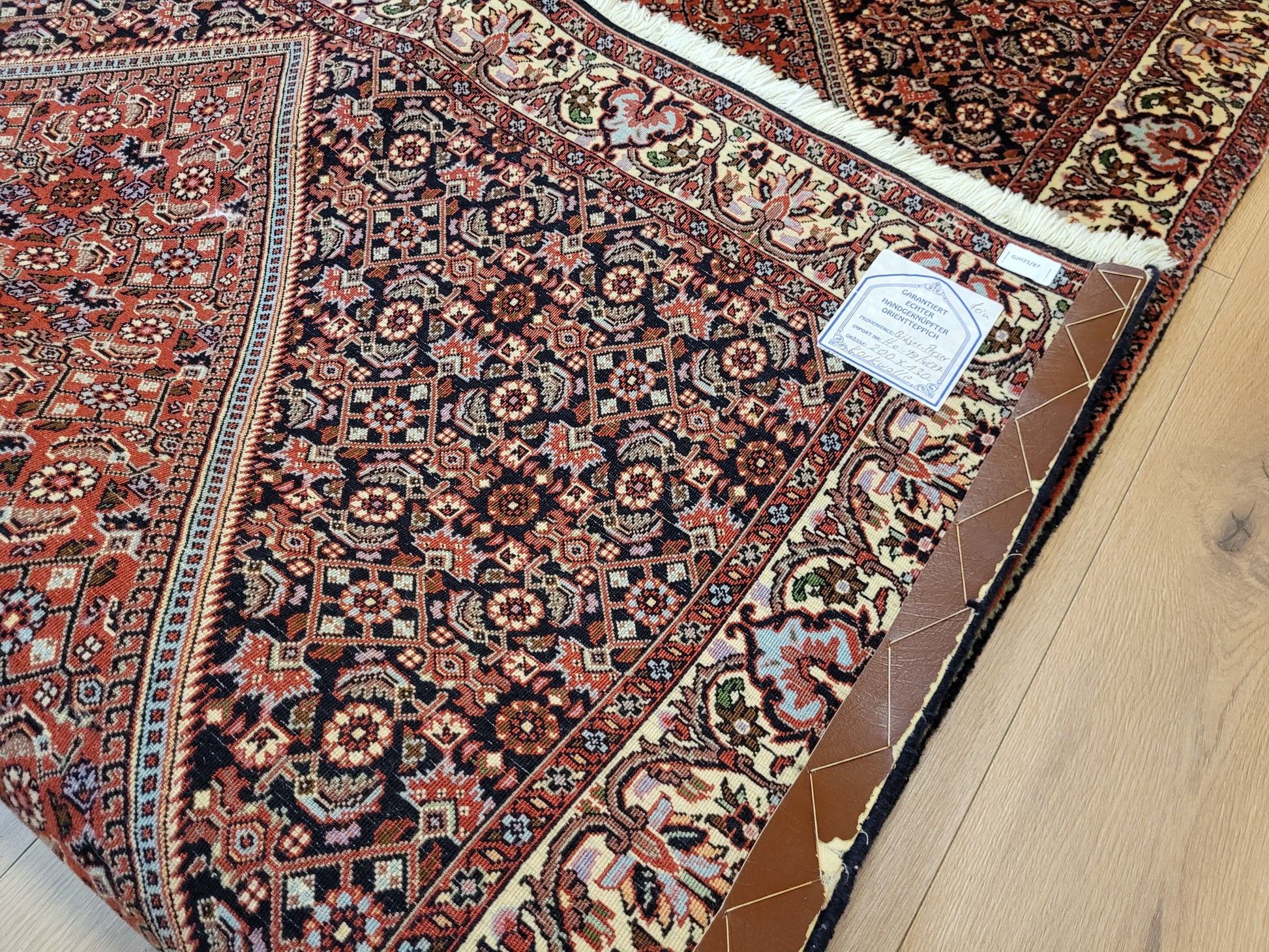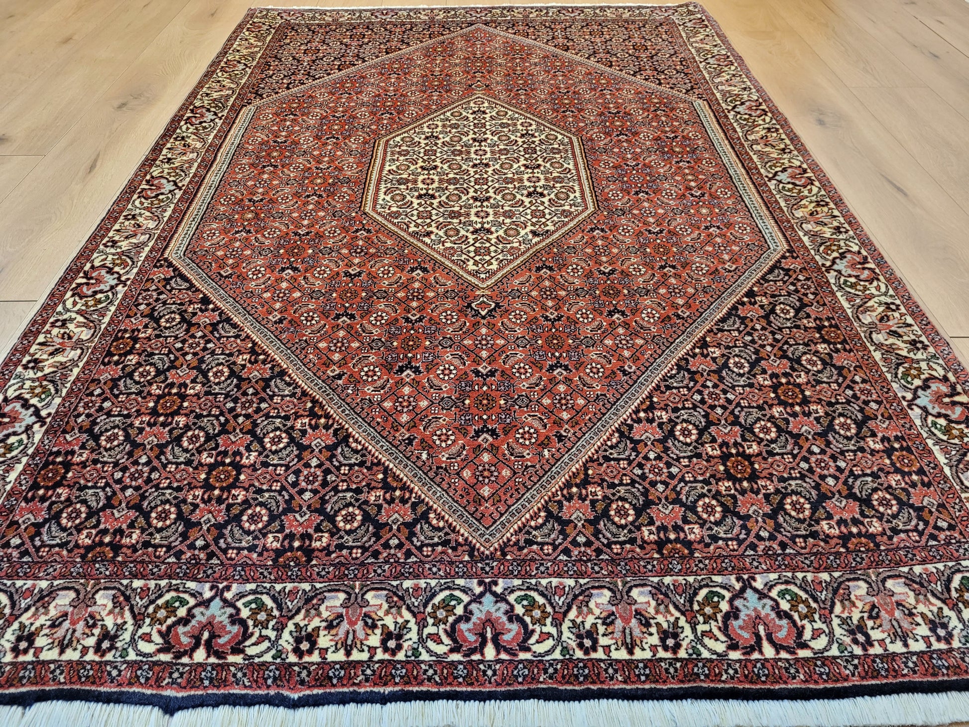 angeboten wird ein hochwertiger Bidjor Teppich, handgeknüpft aus reiner Korkwolle. Charakteristisch für Bidjor sind die geometrisch inspirierten Muster mit dichter Ornamentik und kräftigen Farben, die diesem Teppich eine markante Ausstrahlung verleihen. Das zentrale Rhombus-Medaillon wird von fein gearbeiteten Blütenmustern und einer kunstvoll gestalteten Bordüre eingerahmt.