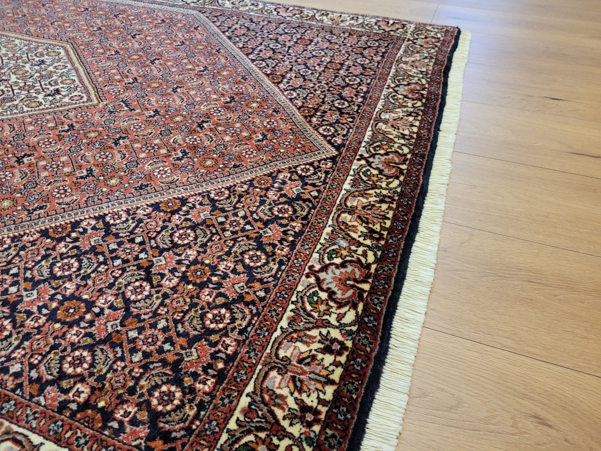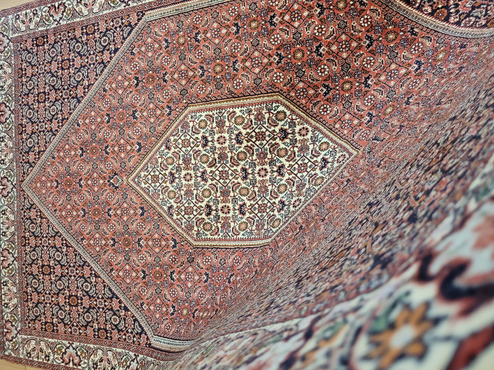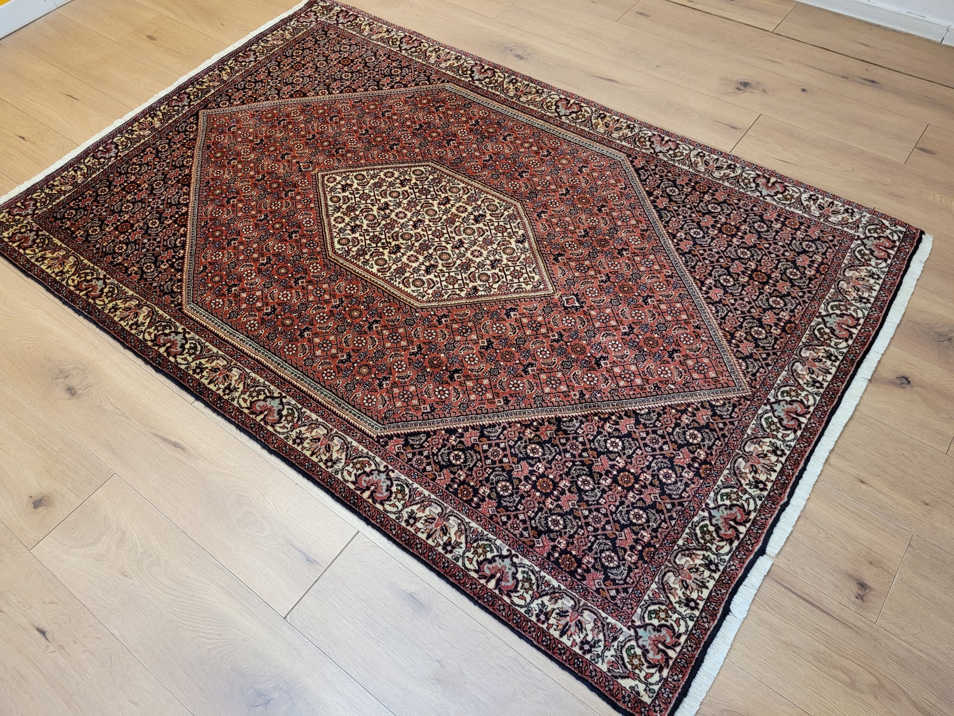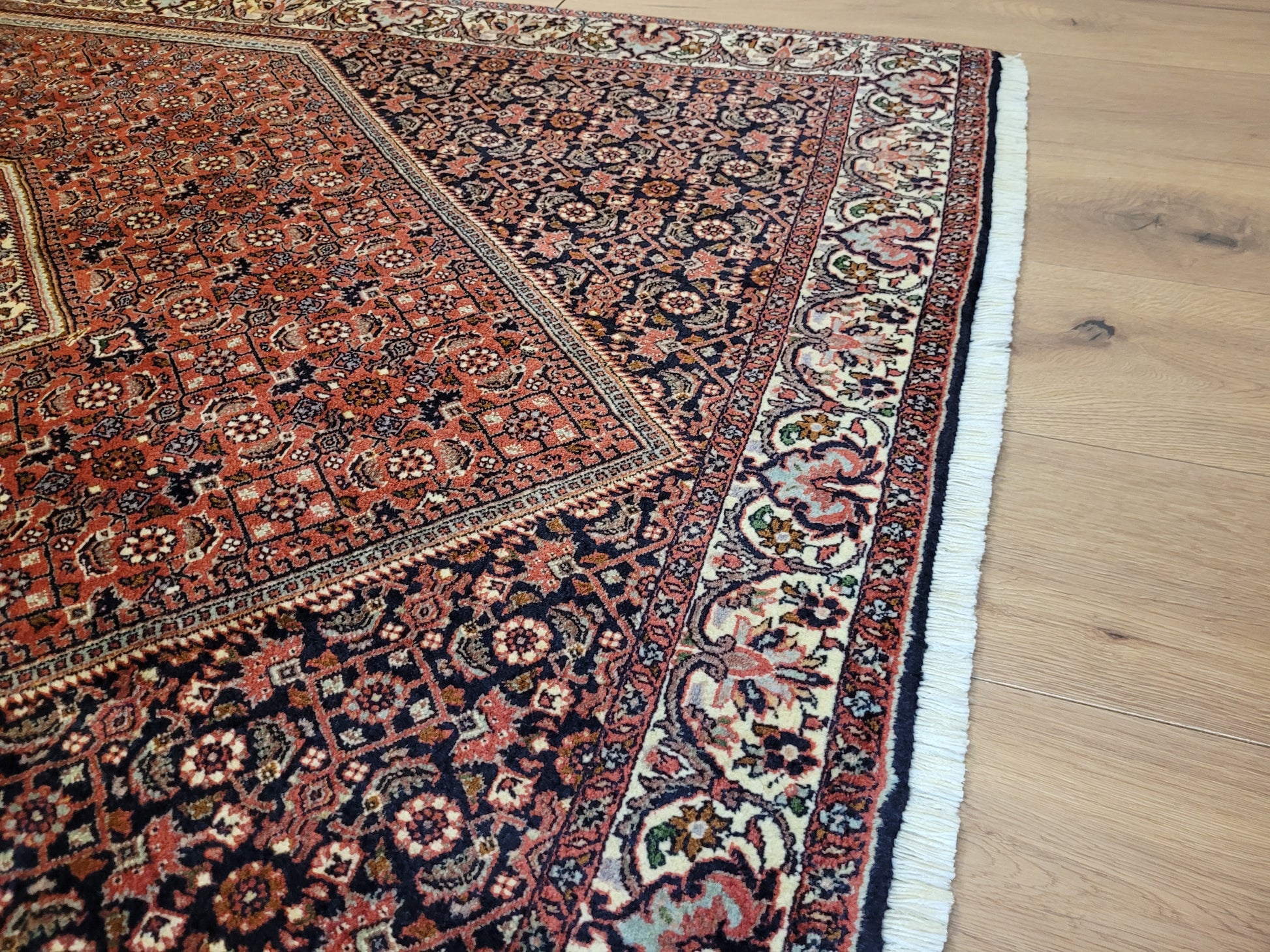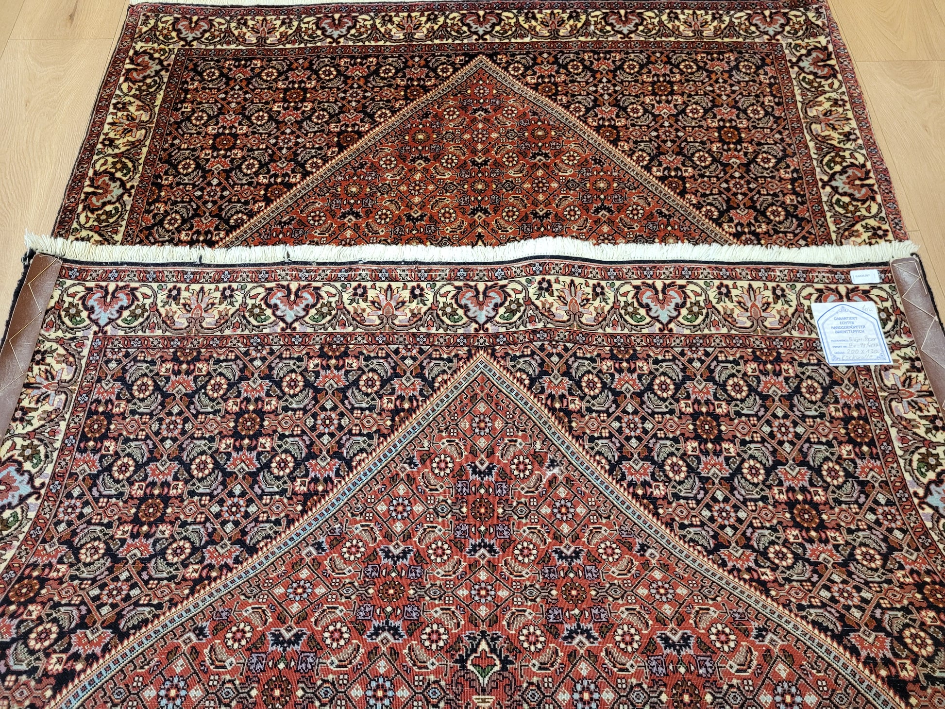 angeboten wird ein hochwertiger Bidjor Teppich, handgeknüpft aus reiner Korkwolle. Charakteristisch für Bidjor sind die geometrisch inspirierten Muster mit dichter Ornamentik und kräftigen Farben, die diesem Teppich eine markante Ausstrahlung verleihen. Das zentrale Rhombus-Medaillon wird von fein gearbeiteten Blütenmustern und einer kunstvoll gestalteten Bordüre eingerahmt.