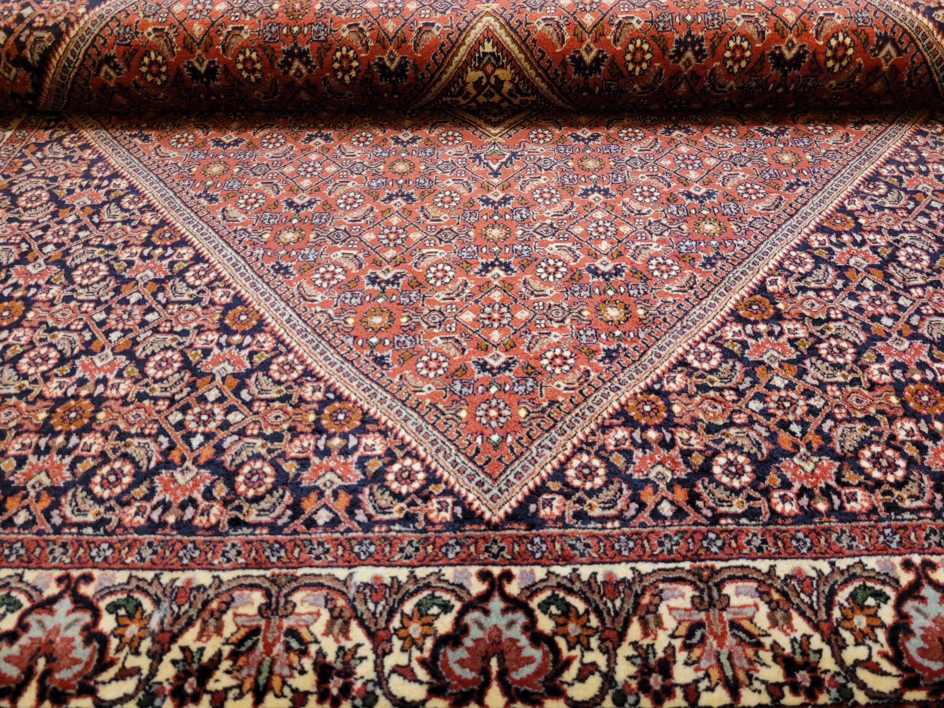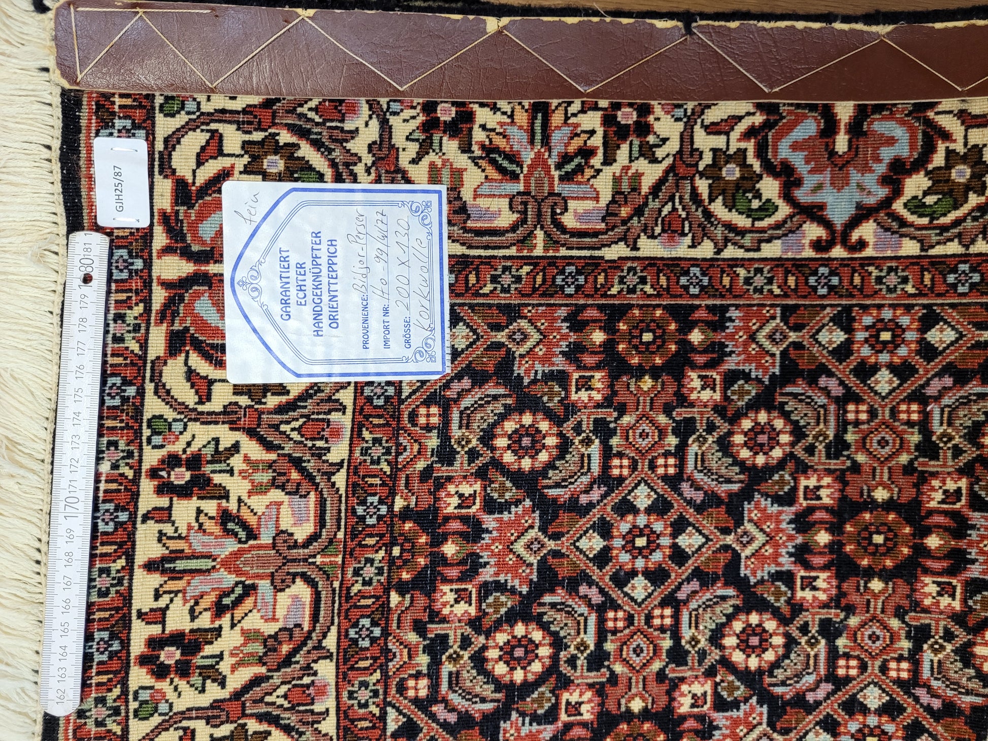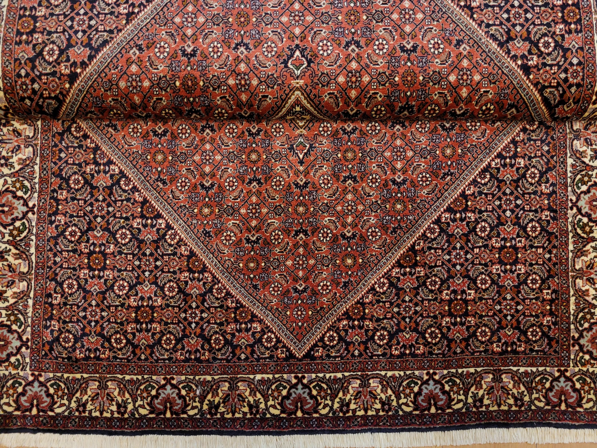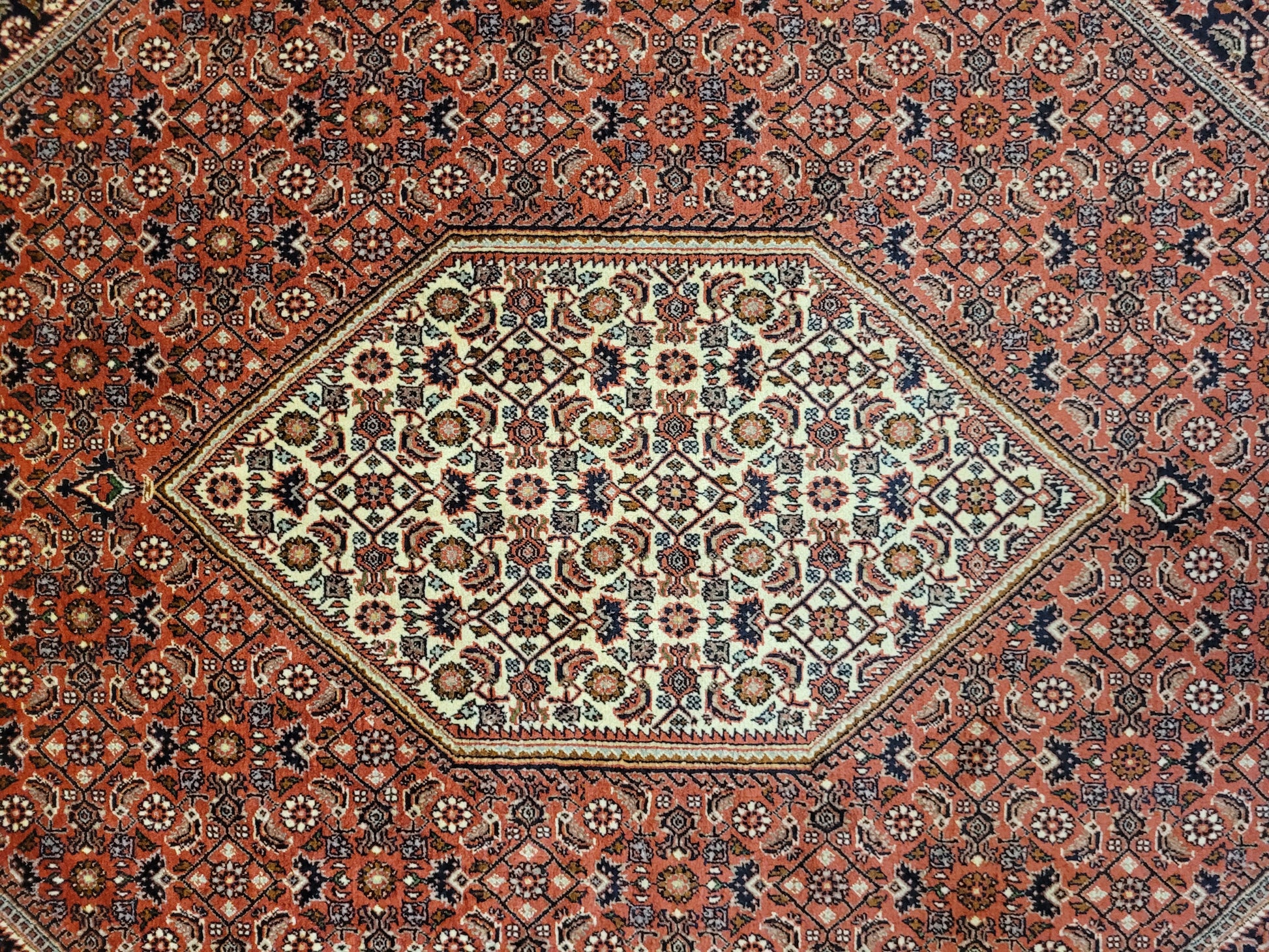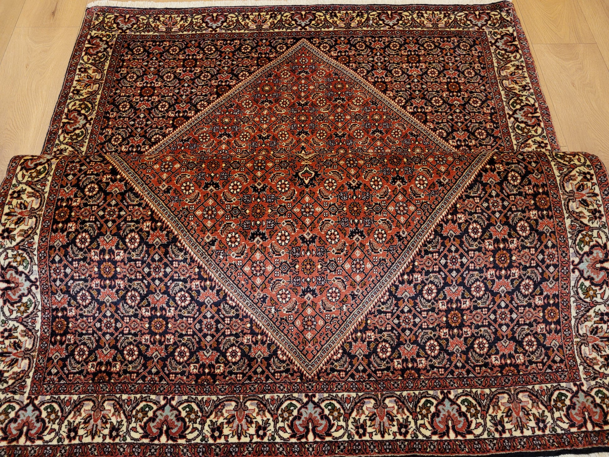 angeboten wird ein hochwertiger Bidjor Teppich, handgeknüpft aus reiner Korkwolle. Charakteristisch für Bidjor sind die geometrisch inspirierten Muster mit dichter Ornamentik und kräftigen Farben, die diesem Teppich eine markante Ausstrahlung verleihen. Das zentrale Rhombus-Medaillon wird von fein gearbeiteten Blütenmustern und einer kunstvoll gestalteten Bordüre eingerahmt.