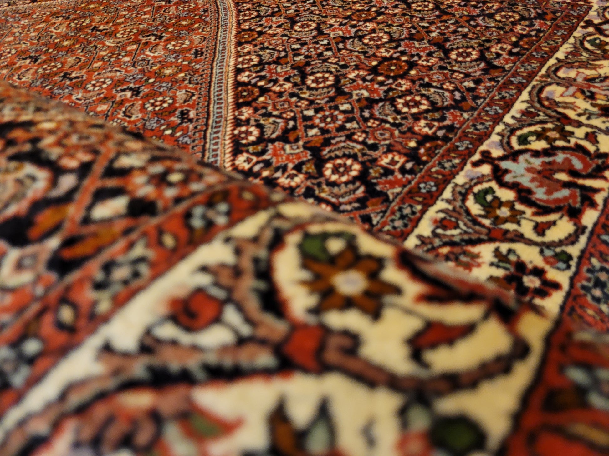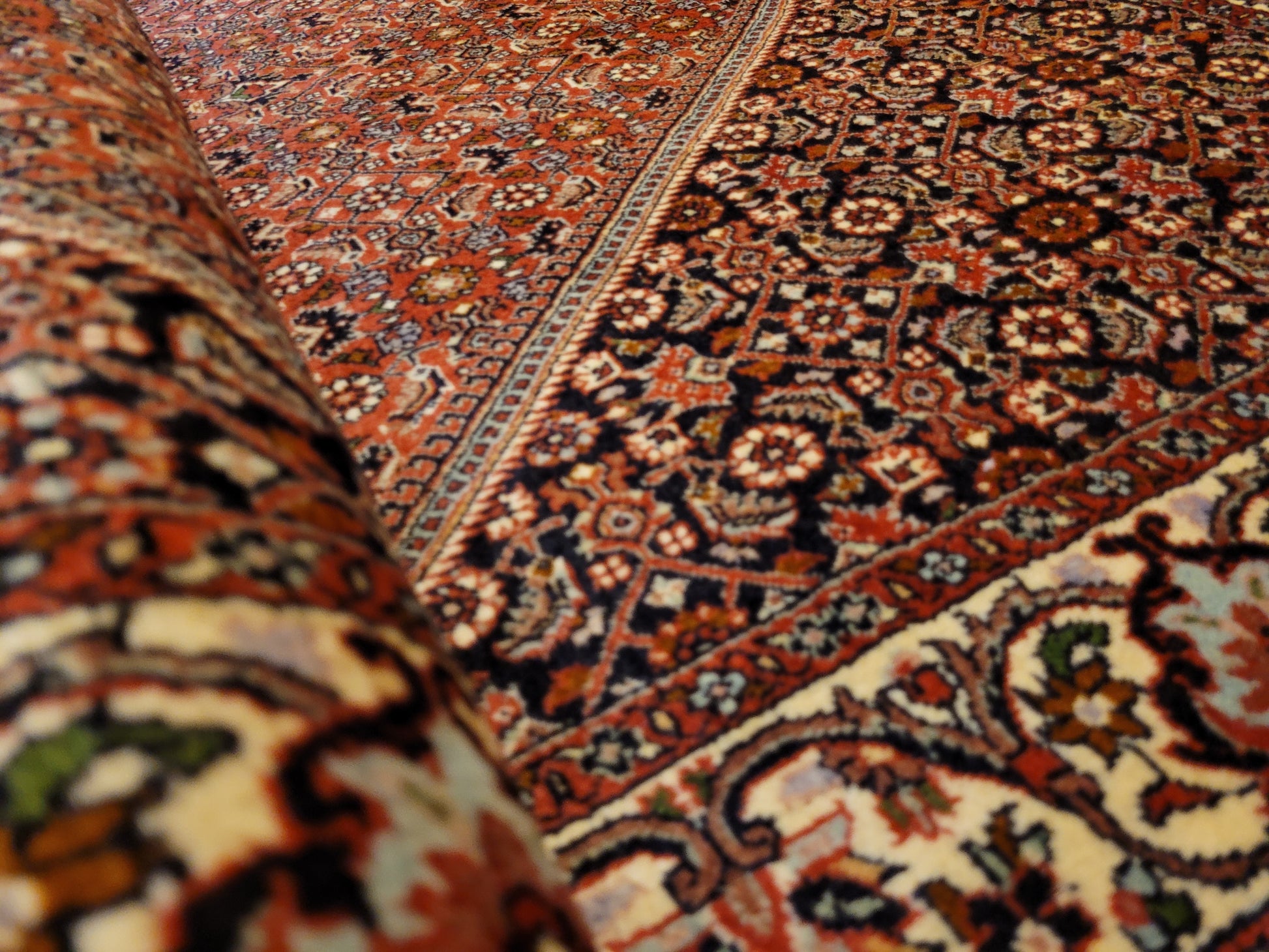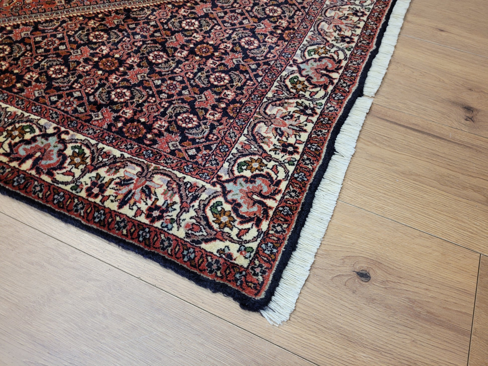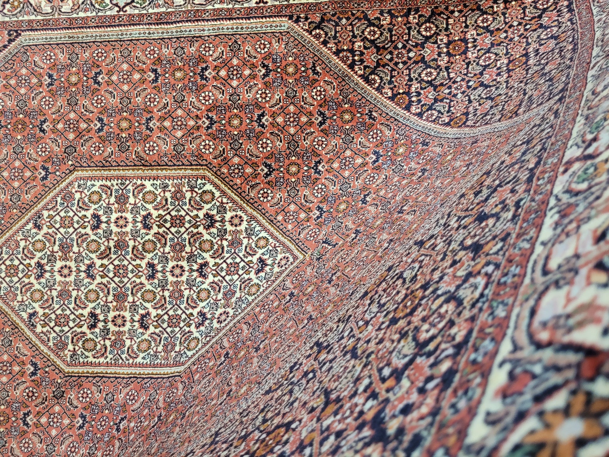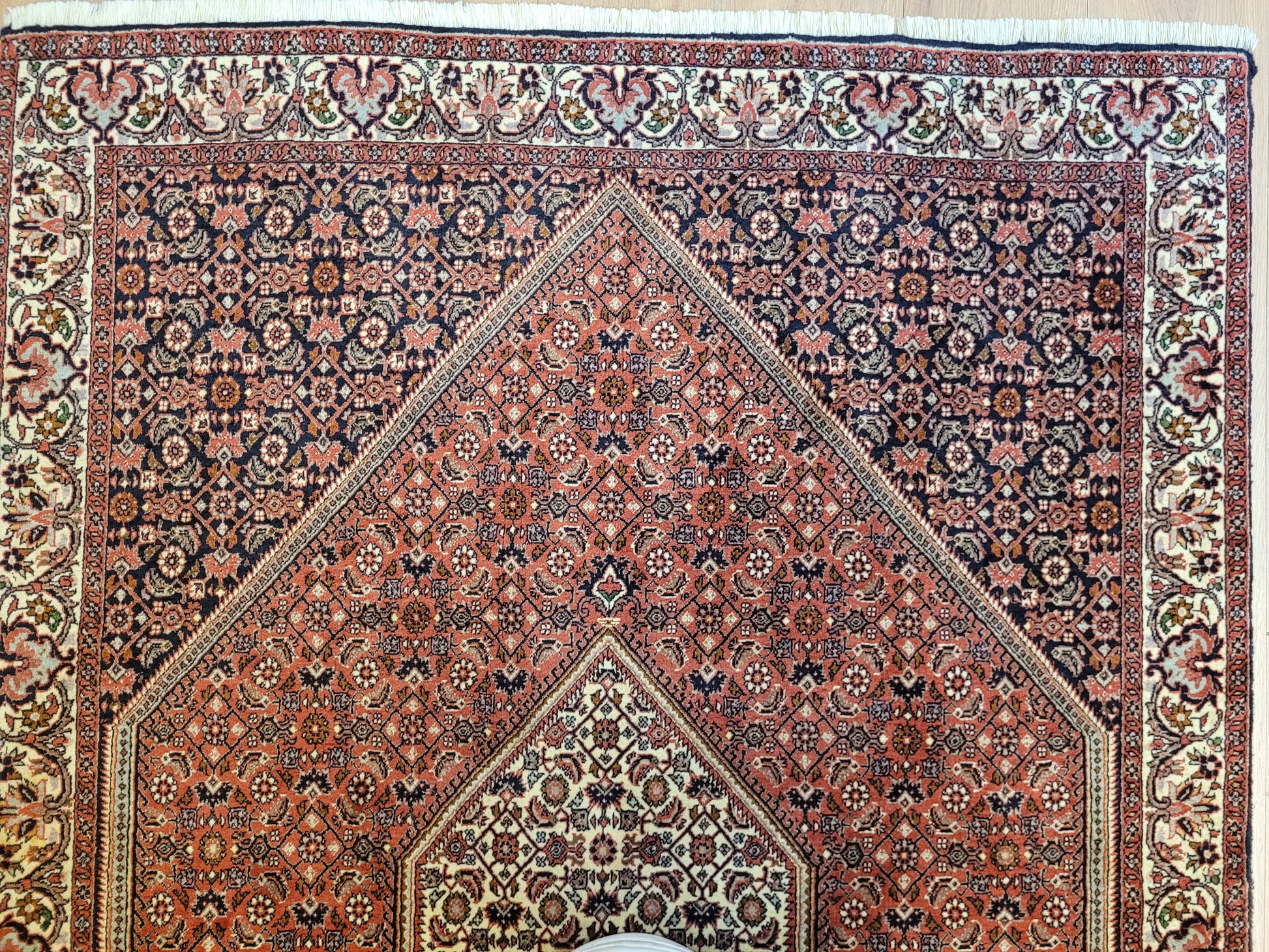 angeboten wird ein hochwertiger Bidjor Teppich, handgeknüpft aus reiner Korkwolle. Charakteristisch für Bidjor sind die geometrisch inspirierten Muster mit dichter Ornamentik und kräftigen Farben, die diesem Teppich eine markante Ausstrahlung verleihen. Das zentrale Rhombus-Medaillon wird von fein gearbeiteten Blütenmustern und einer kunstvoll gestalteten Bordüre eingerahmt.