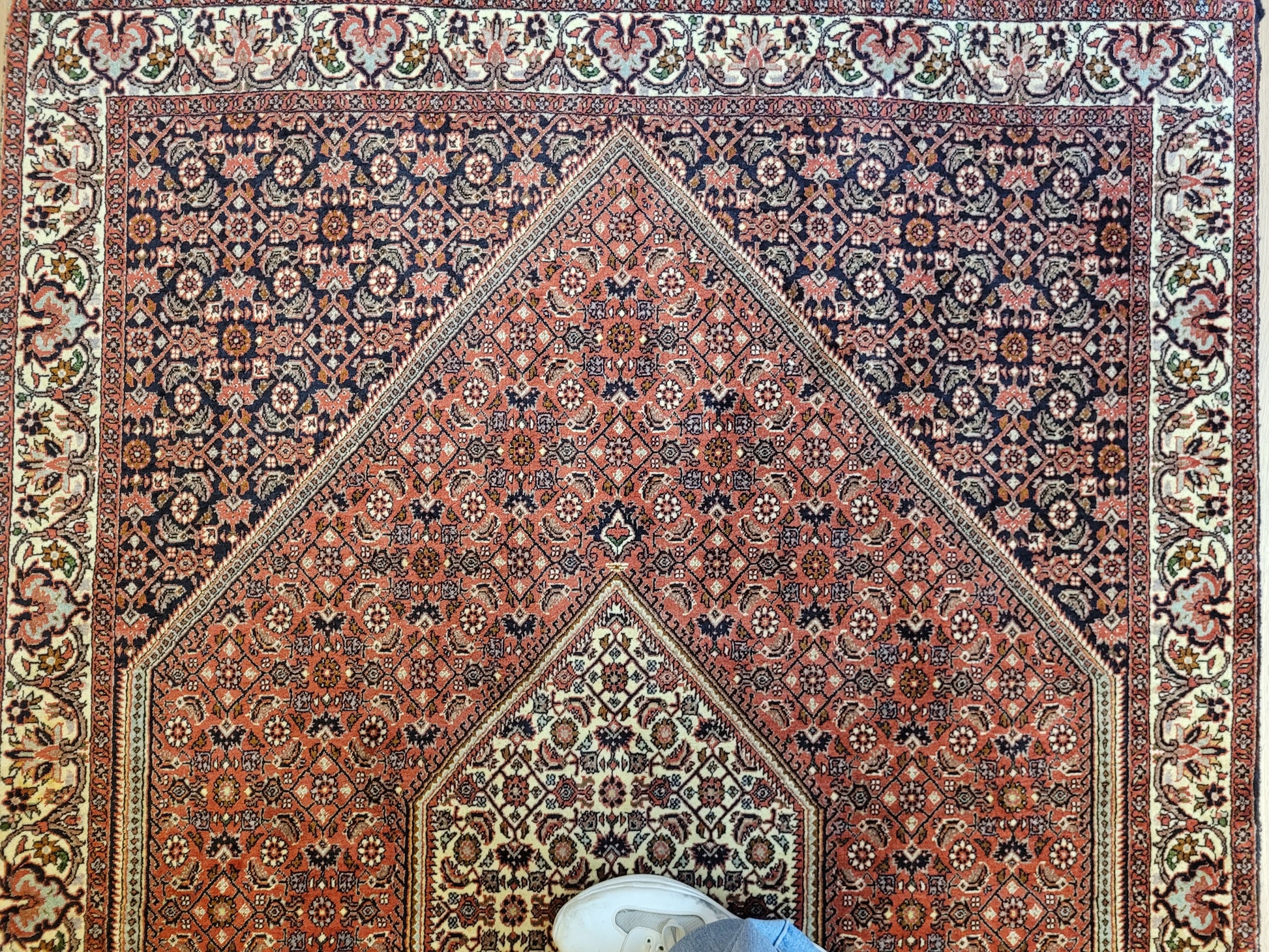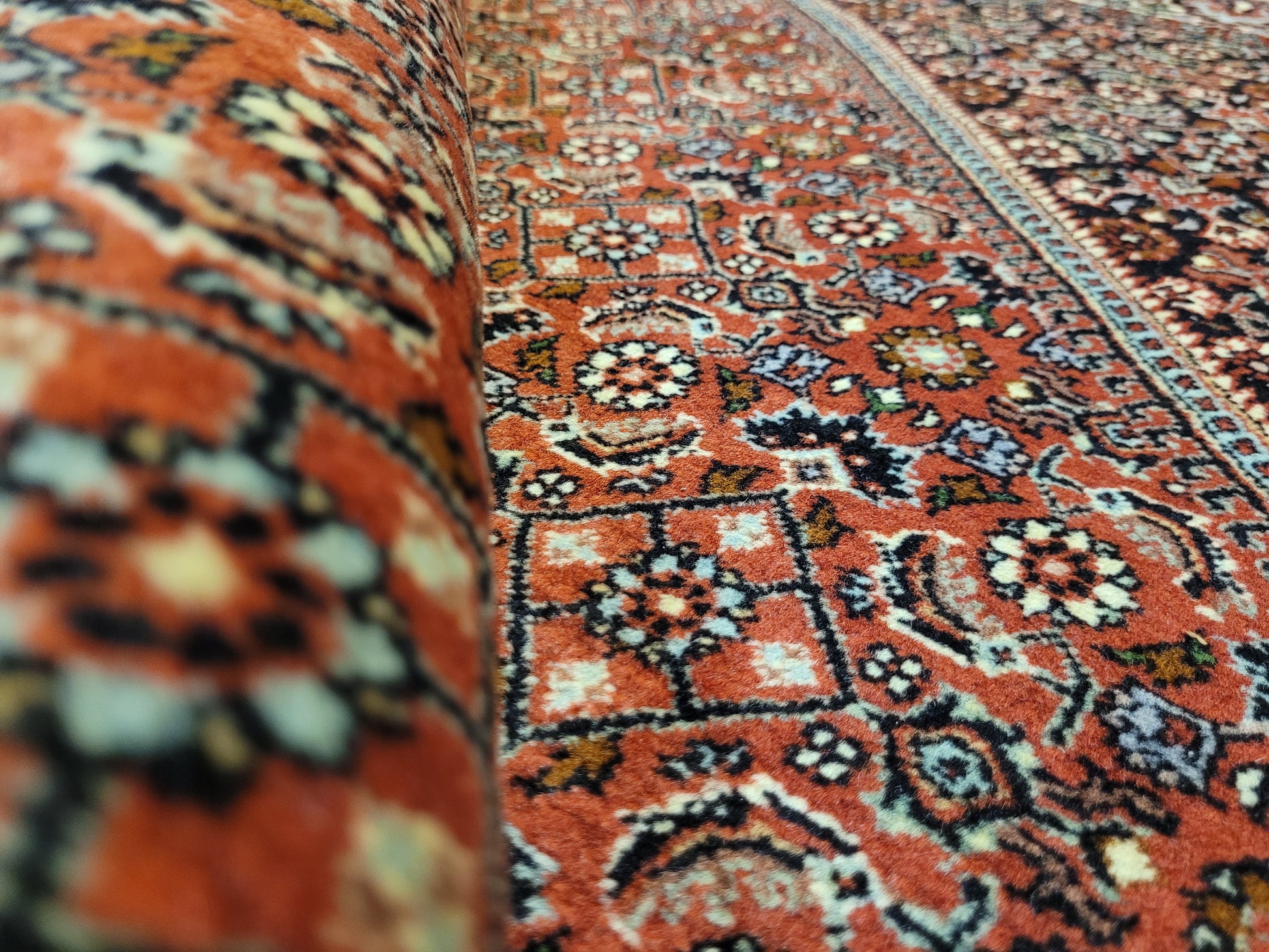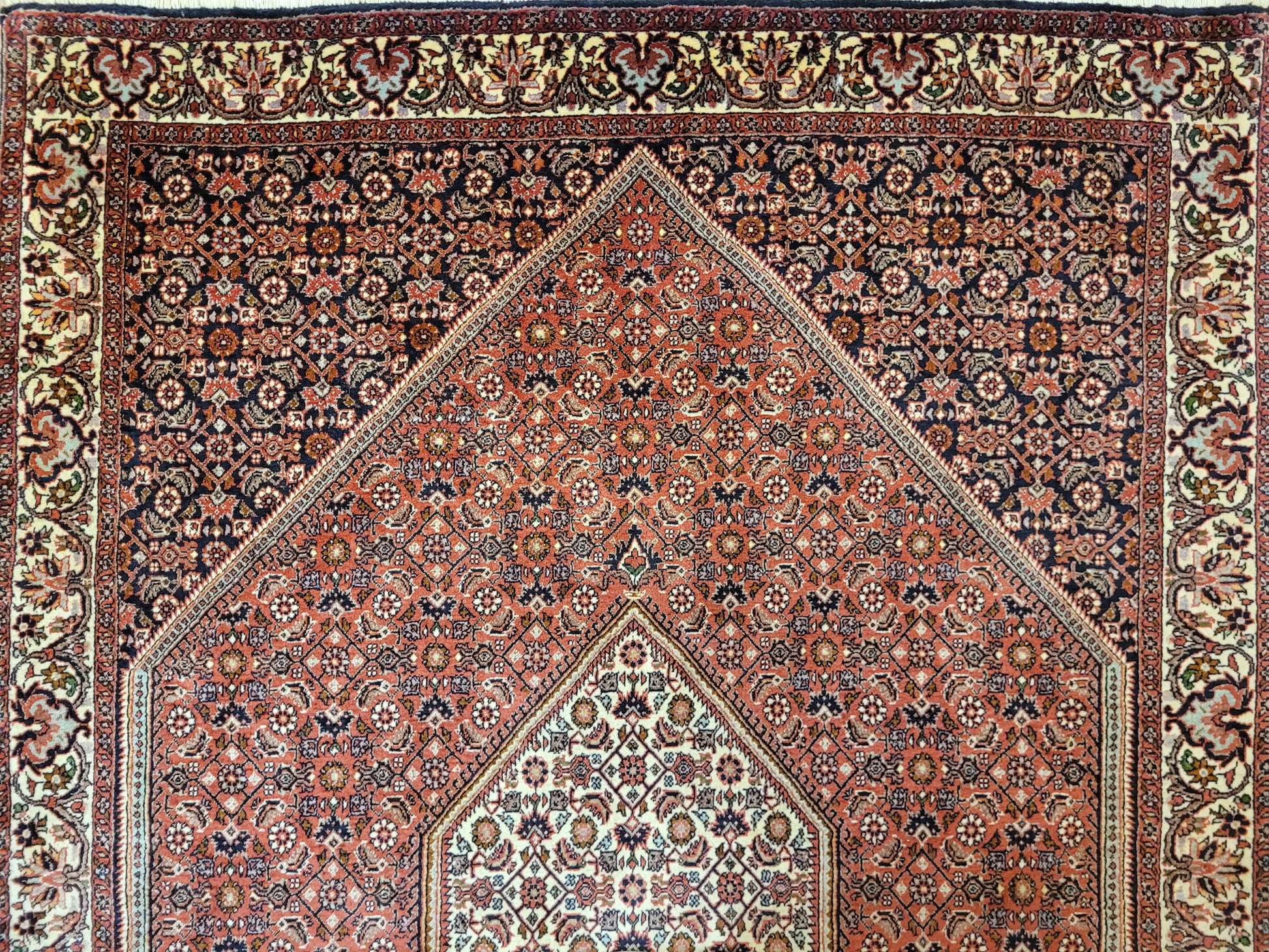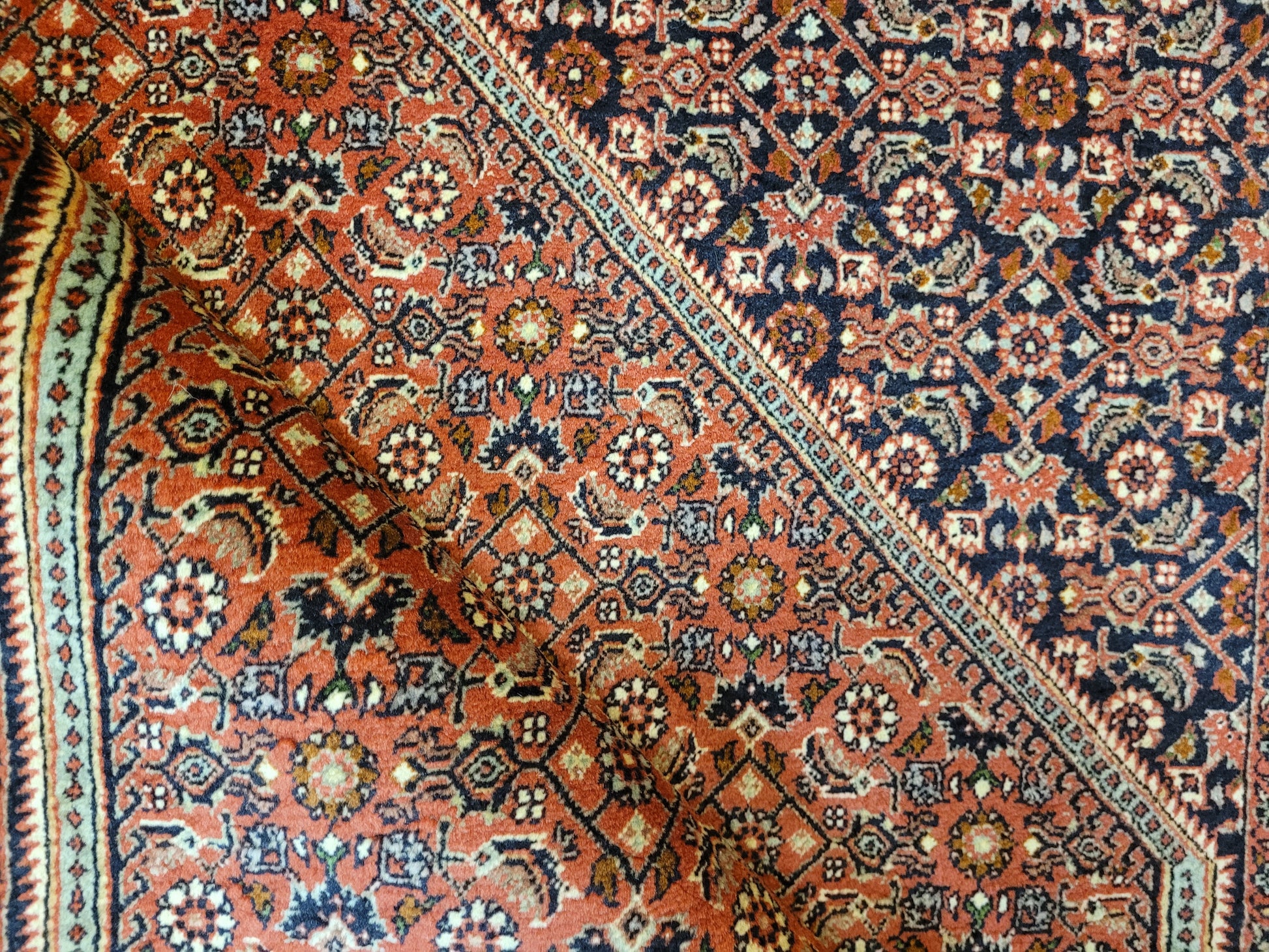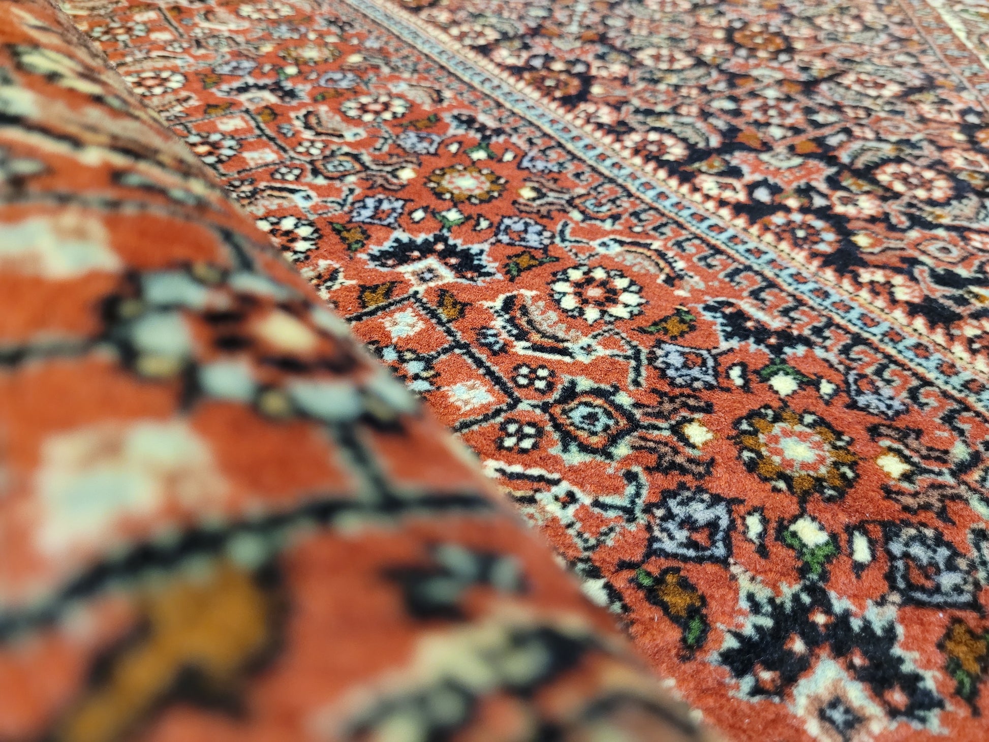 angeboten wird ein hochwertiger Bidjor Teppich, handgeknüpft aus reiner Korkwolle. Charakteristisch für Bidjor sind die geometrisch inspirierten Muster mit dichter Ornamentik und kräftigen Farben, die diesem Teppich eine markante Ausstrahlung verleihen. Das zentrale Rhombus-Medaillon wird von fein gearbeiteten Blütenmustern und einer kunstvoll gestalteten Bordüre eingerahmt.