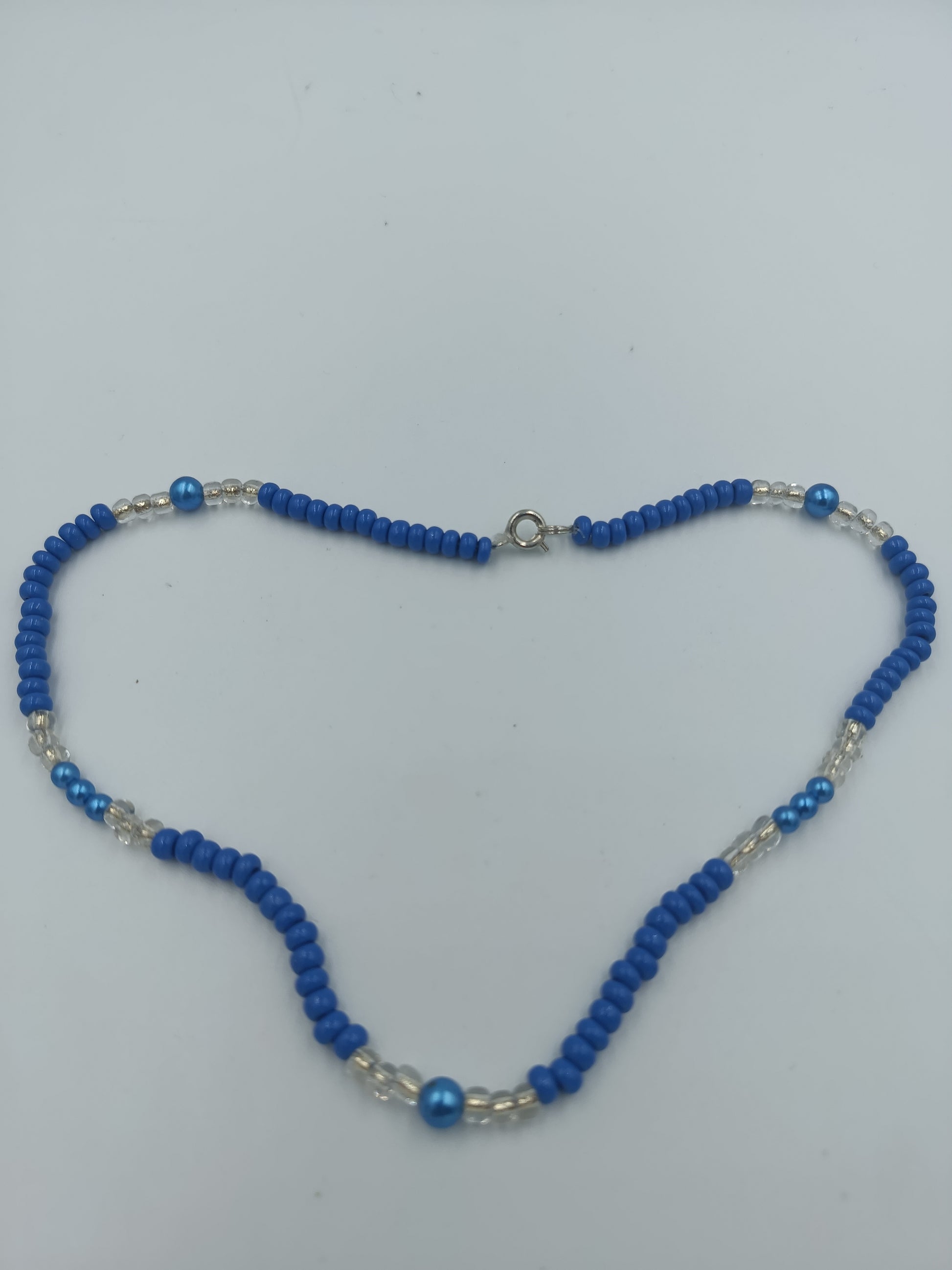 Verspielte Halskette mit blauen Glasperlen und transparenten Abstandsperlen. Frisch, farbenfroh und perfekt als Sommer-Accessoire.