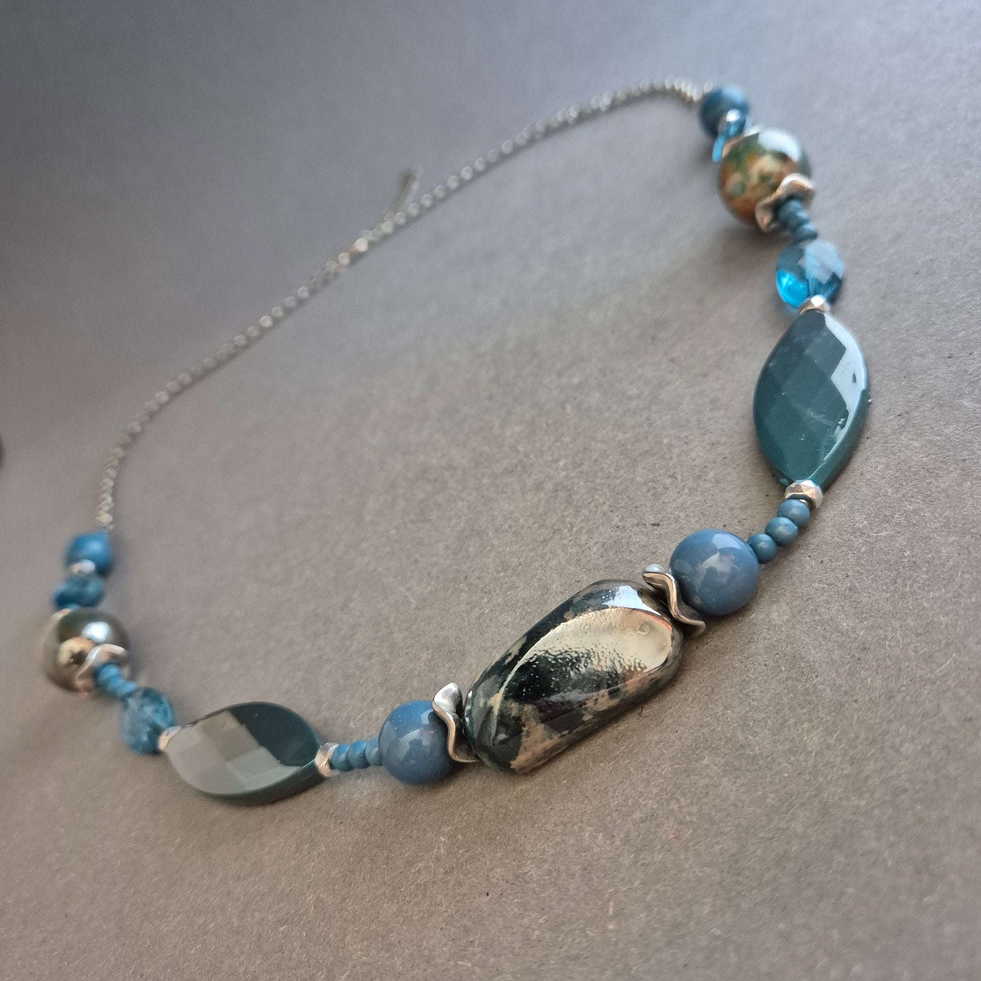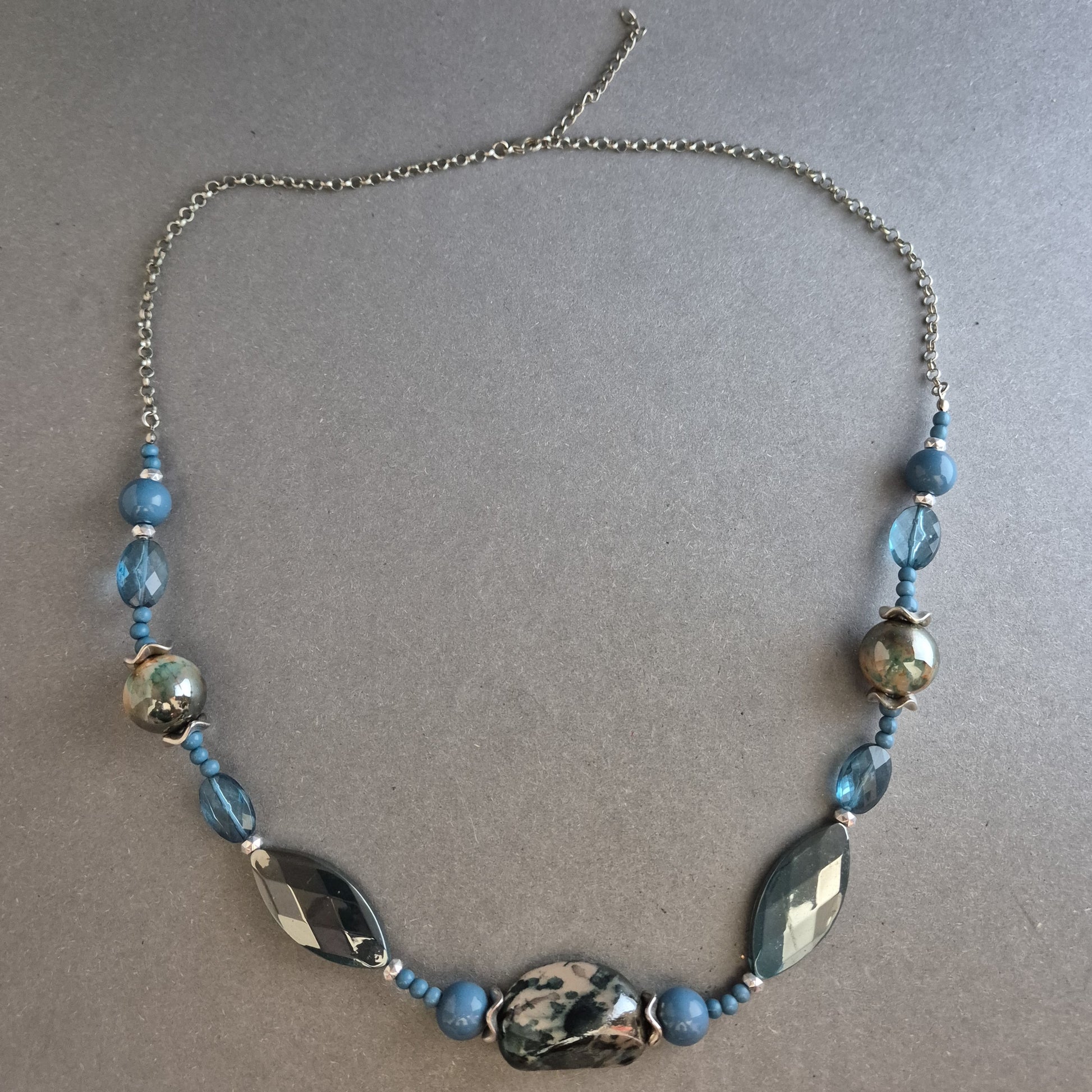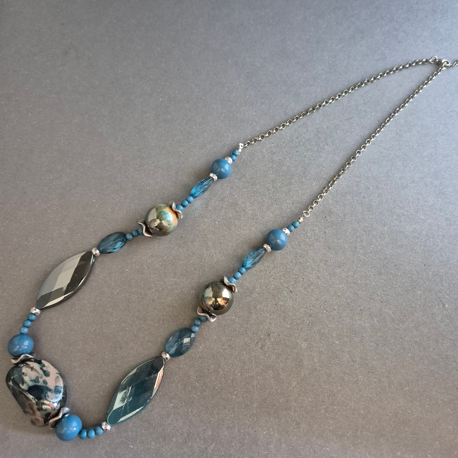 Diese auffällige Statement-Halskette kombiniert verschiedenste Blautöne mit marmorierten Schmucksteinen und silbernen Elementen. Die Mischung aus schimmernden Glasperlen, glänzenden Metallelementen und einzigartig gemusterten Steinen verleiht ihr einen kunstvollen und modernen Charakter – ideal für kreative Looks oder als Hingucker zu schlichten Outfits.