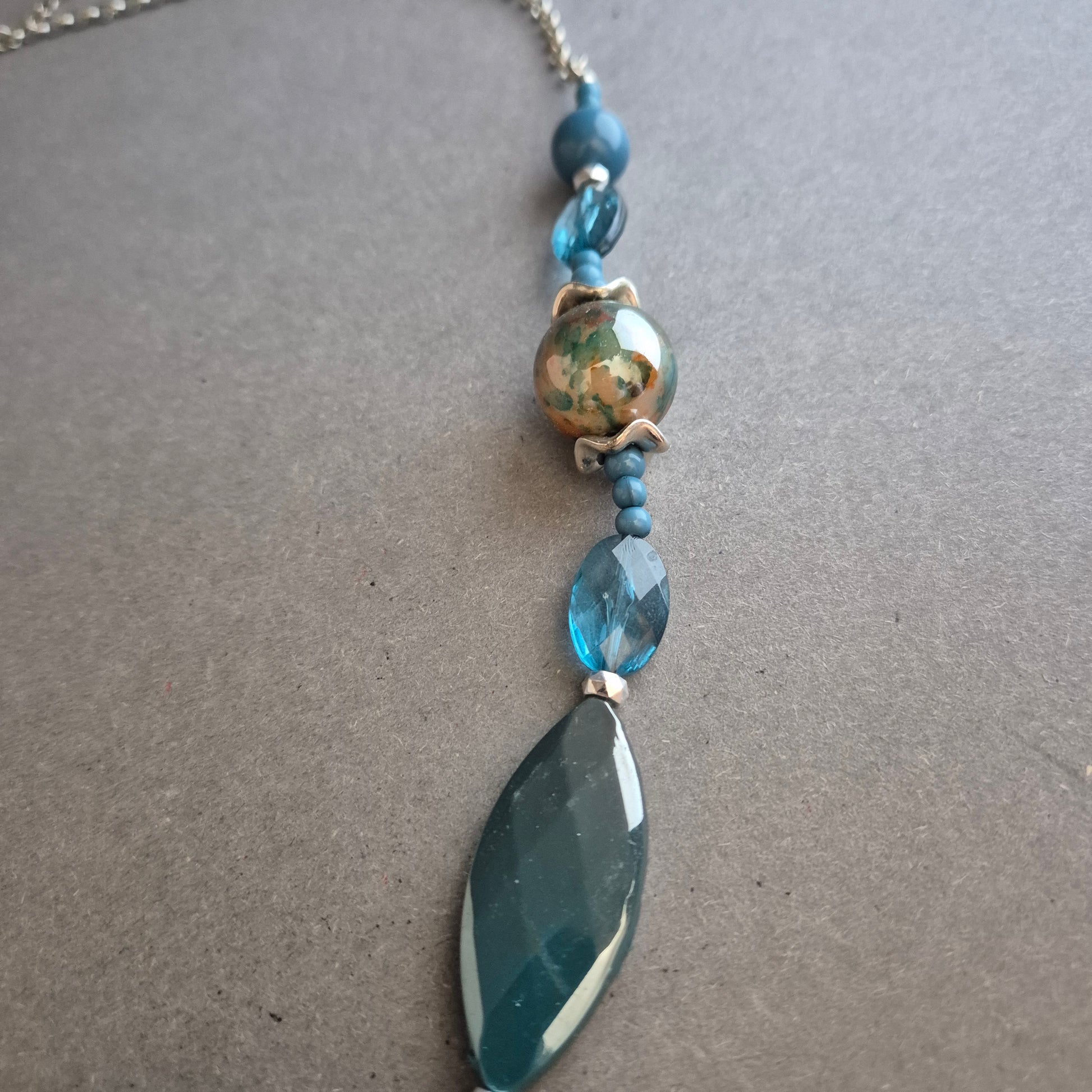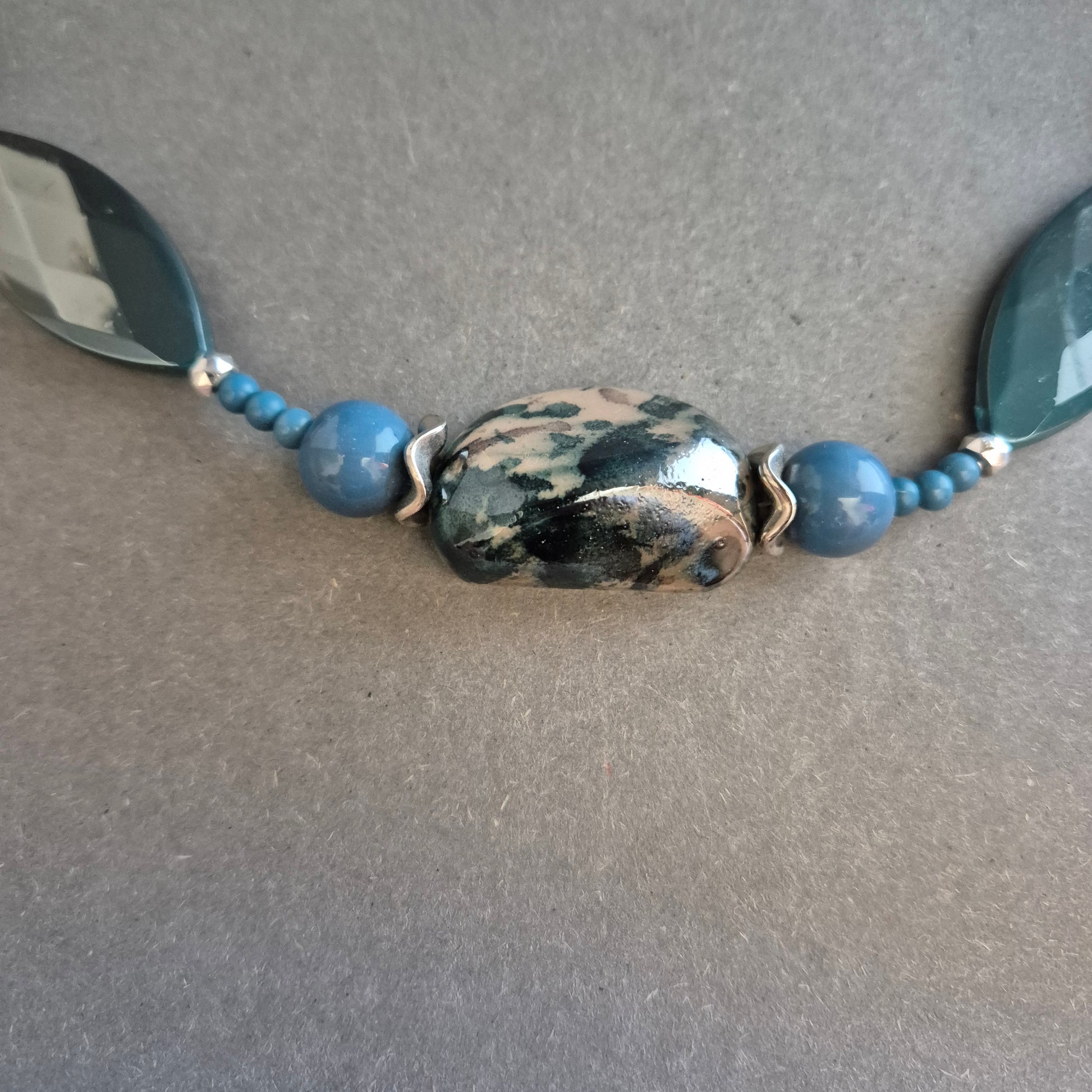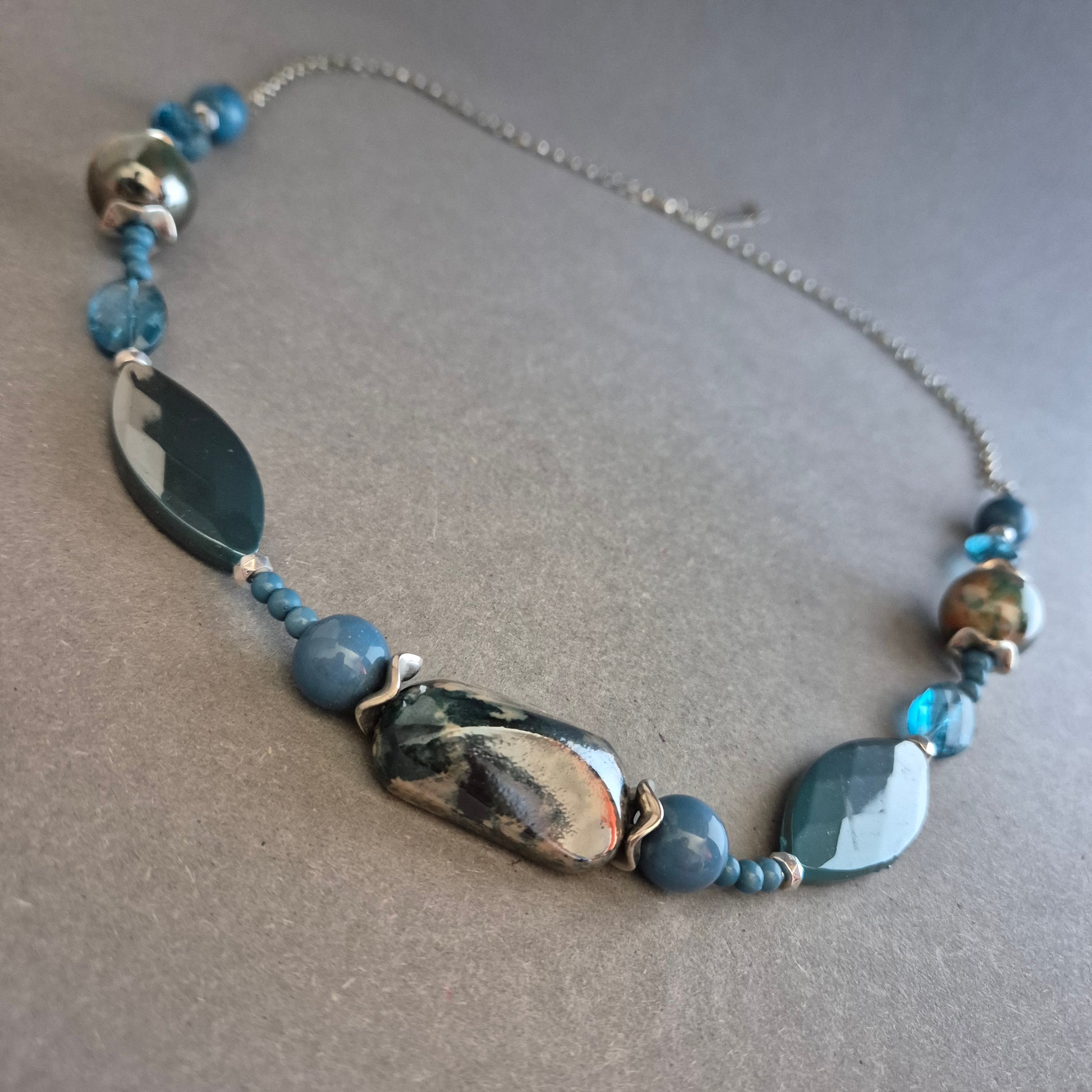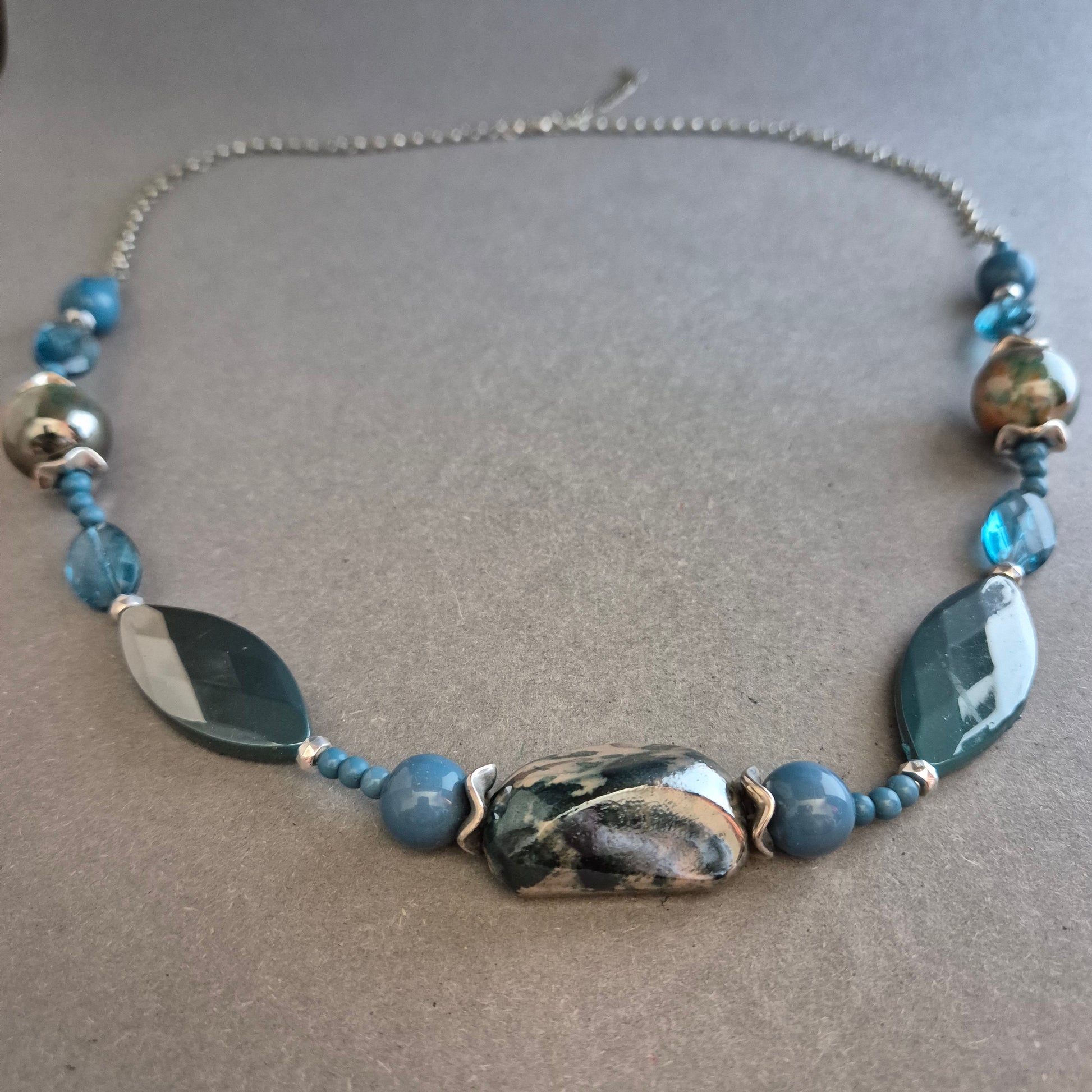 Diese auffällige Statement-Halskette kombiniert verschiedenste Blautöne mit marmorierten Schmucksteinen und silbernen Elementen. Die Mischung aus schimmernden Glasperlen, glänzenden Metallelementen und einzigartig gemusterten Steinen verleiht ihr einen kunstvollen und modernen Charakter – ideal für kreative Looks oder als Hingucker zu schlichten Outfits.