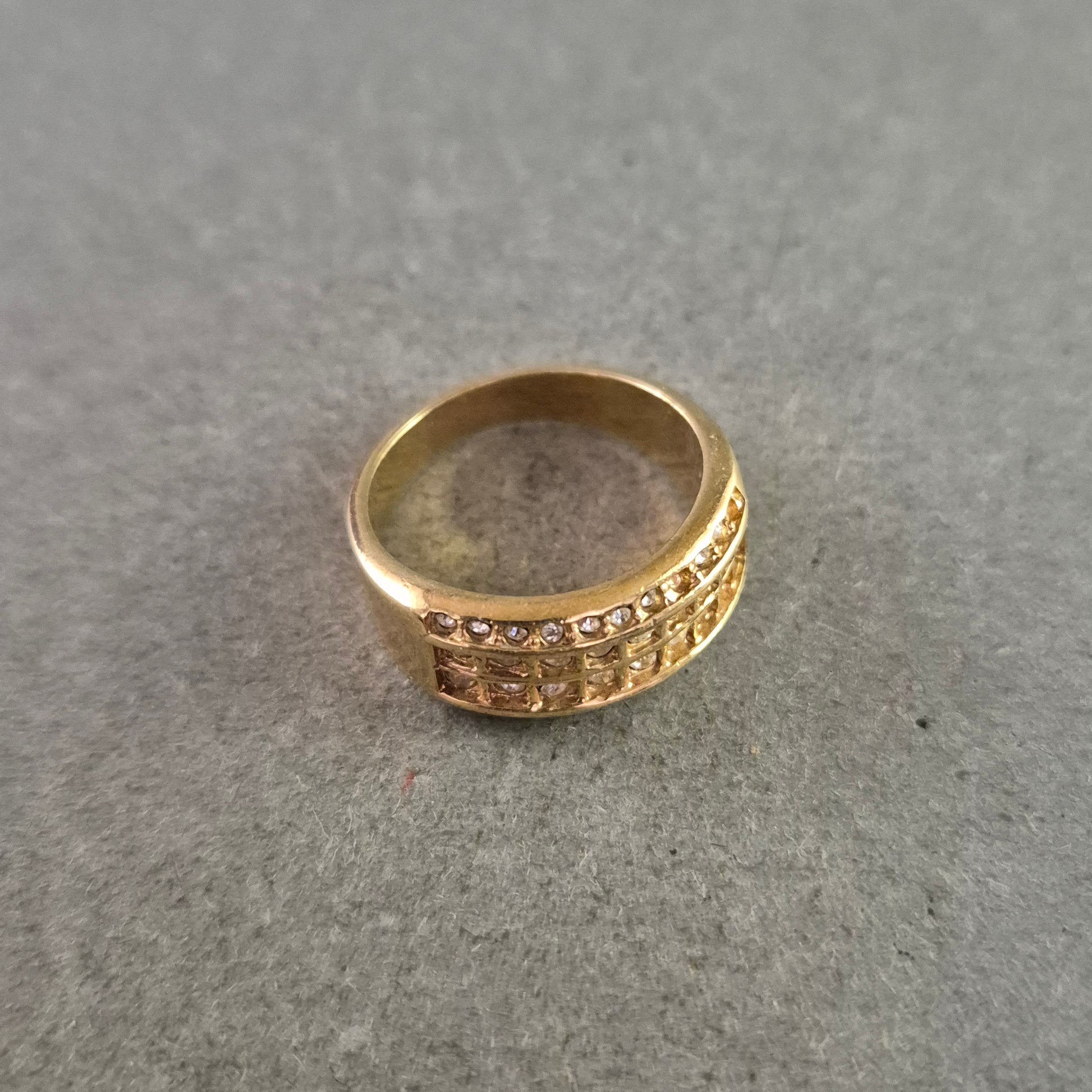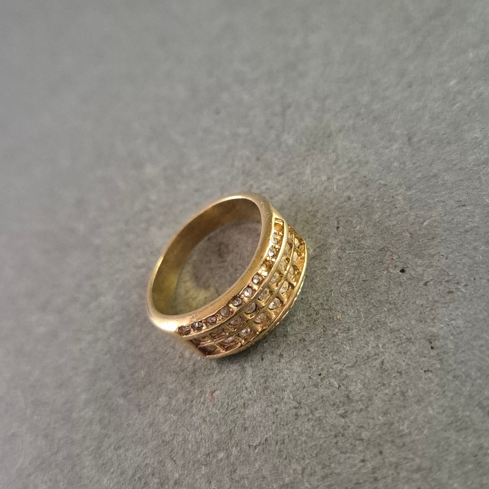 Dieser markante Damen Ring überzeugt mit seinem breiten Band und gleich drei Reihen funkelnder Strasssteine, die in rechteckigem Raster eingefasst sind. Die goldfarbene Oberfläche unterstreicht den luxuriösen Look und macht diesen Ring zu einem echten Hingucker – perfekt für festliche Anlässe oder glamouröse Outfits.