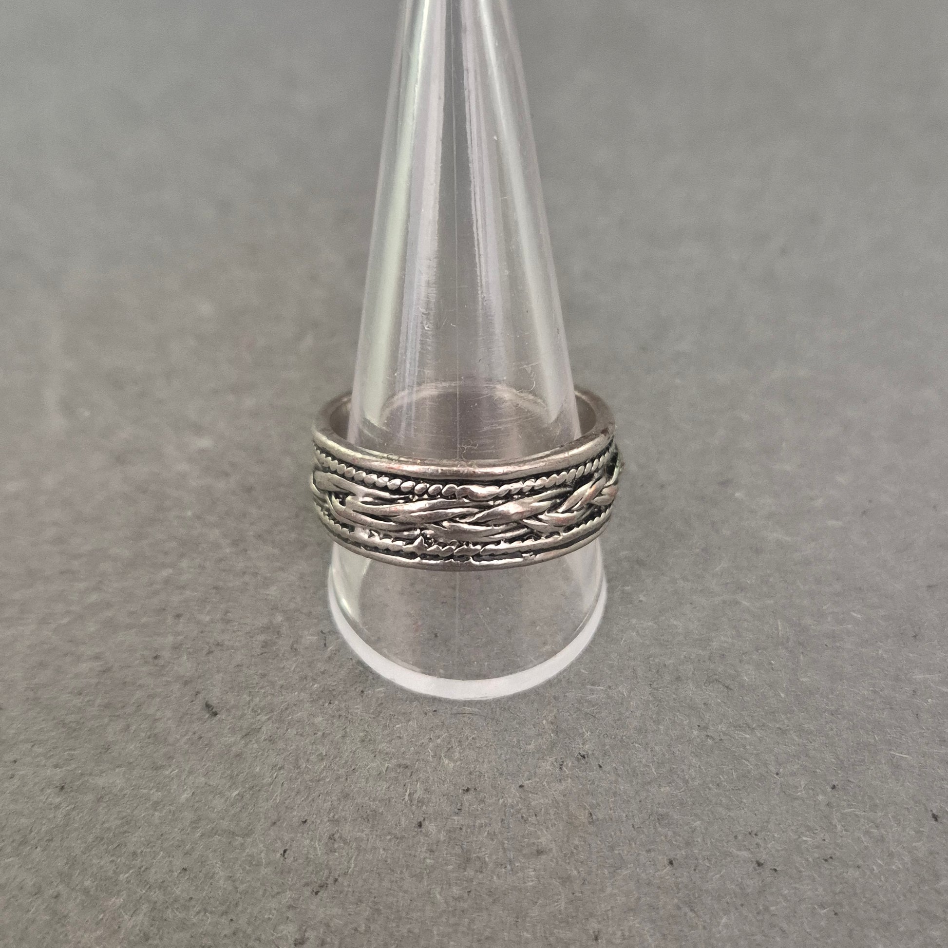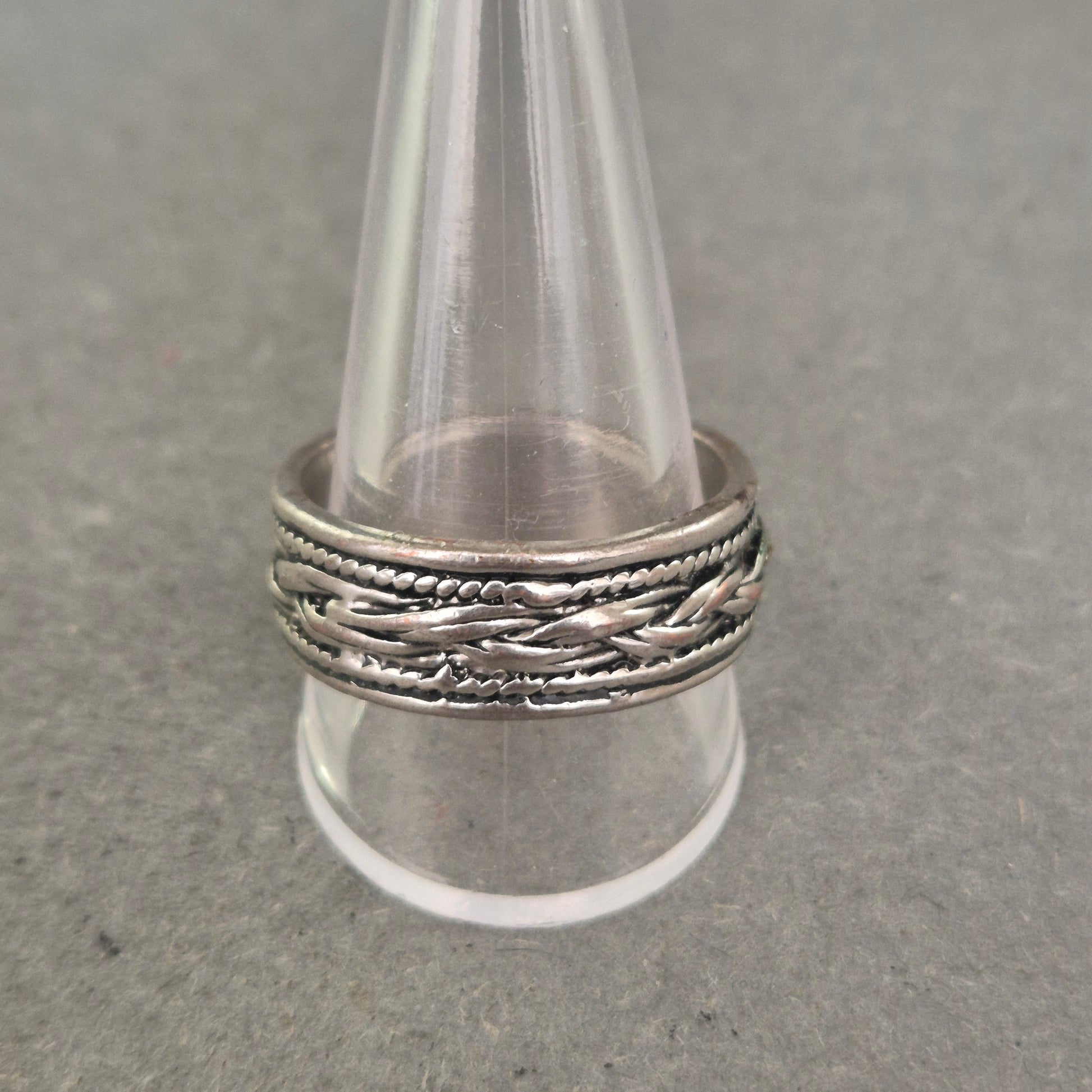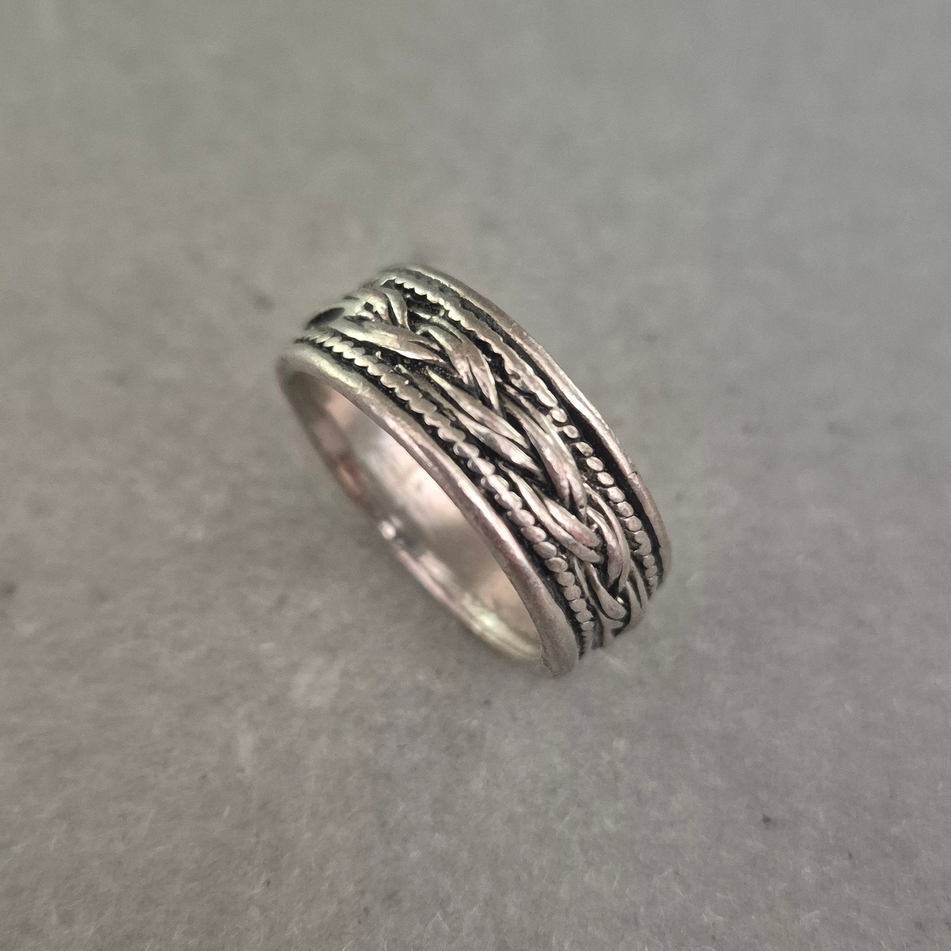 Dieser massive Vintage-Ring aus silberfarbenem Metall besticht durch ein kunstvolles, umlaufendes Flechtmuster und eine robuste Verarbeitung. Die oxidierte Oberfläche verleiht dem Ring einen markanten Antik-Look. Ideal für Damen oder Herren, die ein charakterstarkes Accessoire im Ethno- oder Boho-Stil suchen.